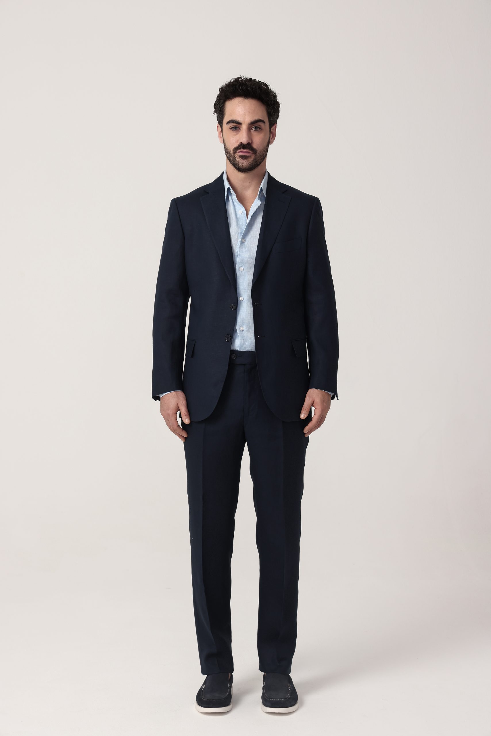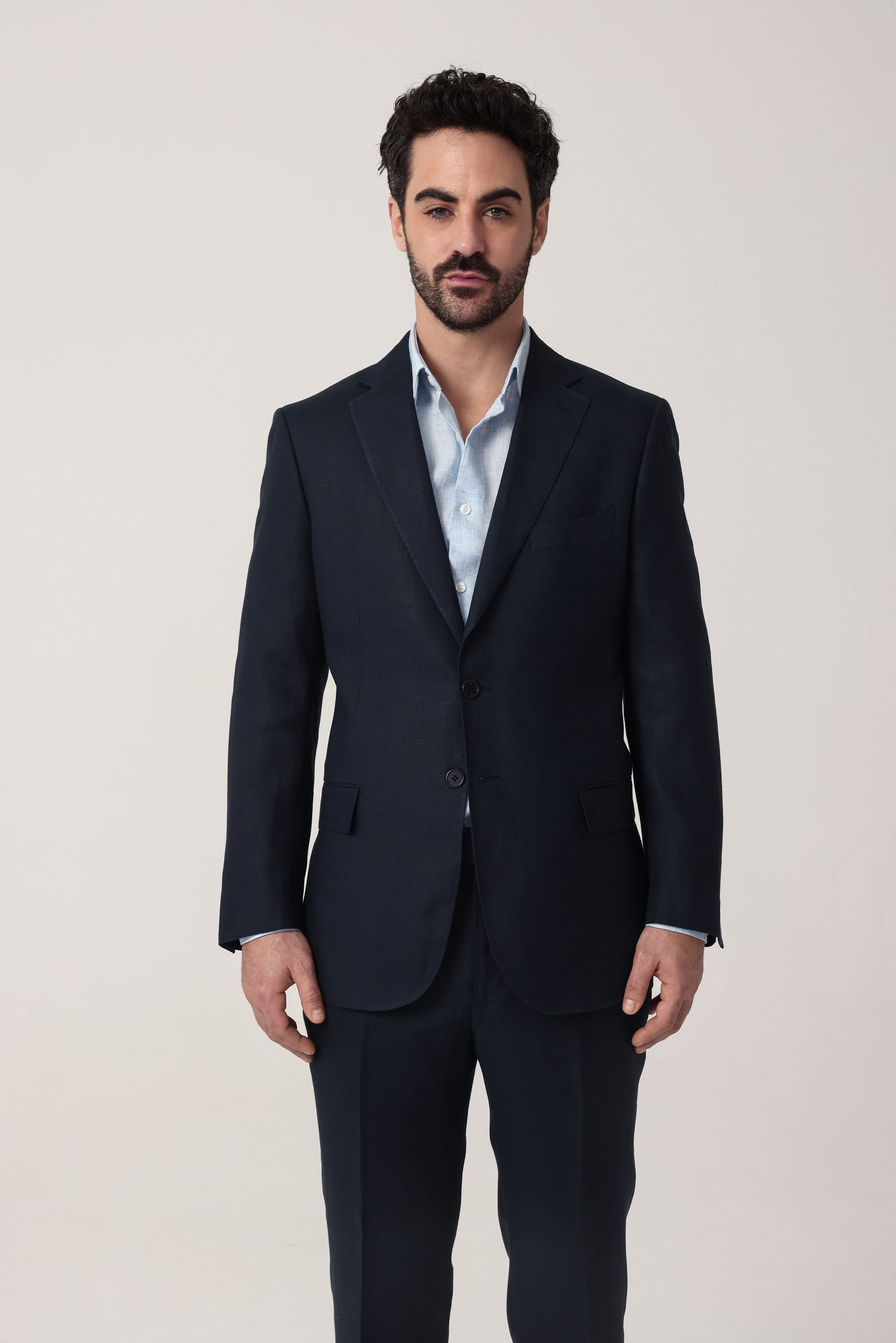 Ambo de lino liso. Saco recto con dos botones. Solapa angosta. Interior sin forro. Bolsillos con tapa. Doble abertura trasera. Moldería regular.