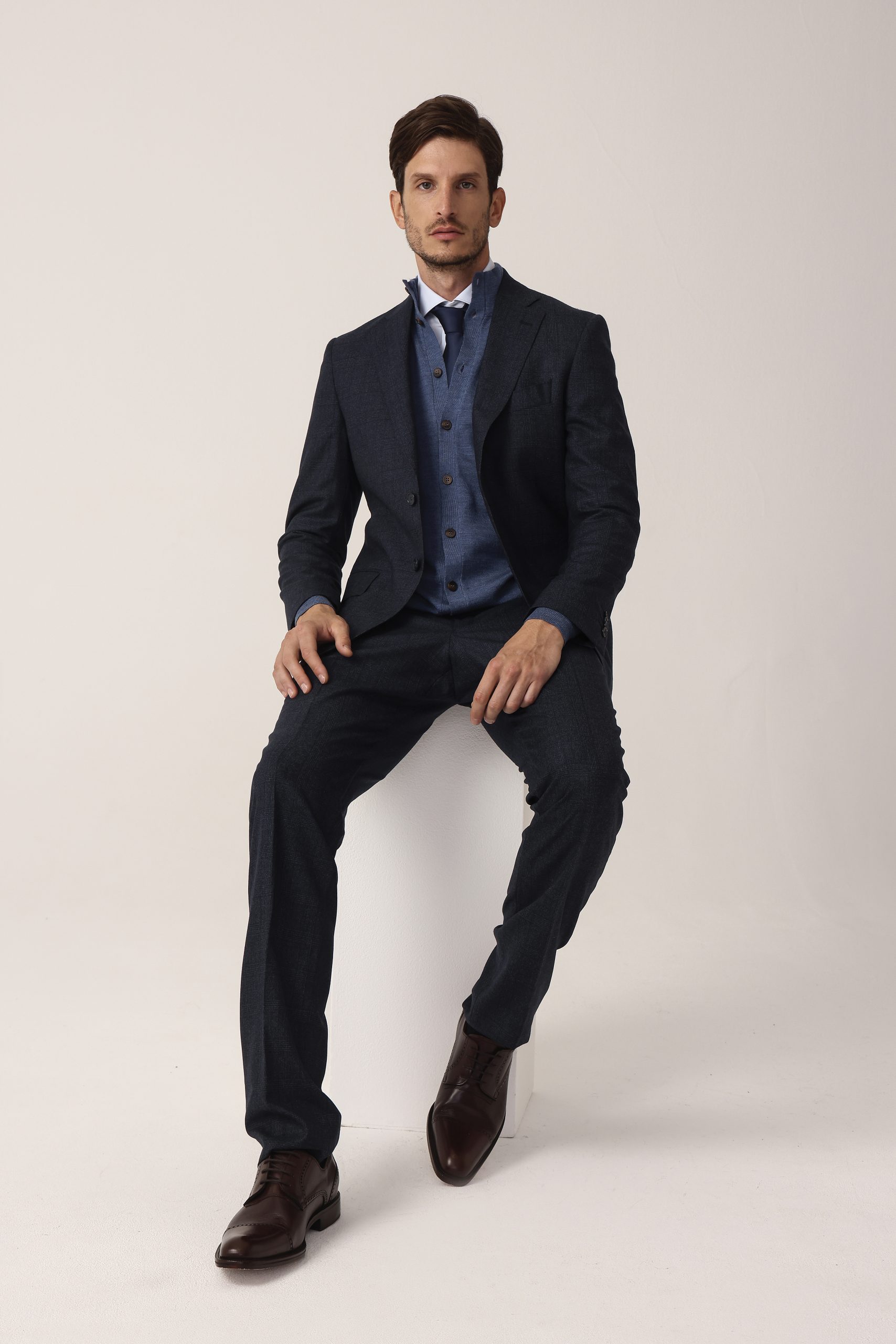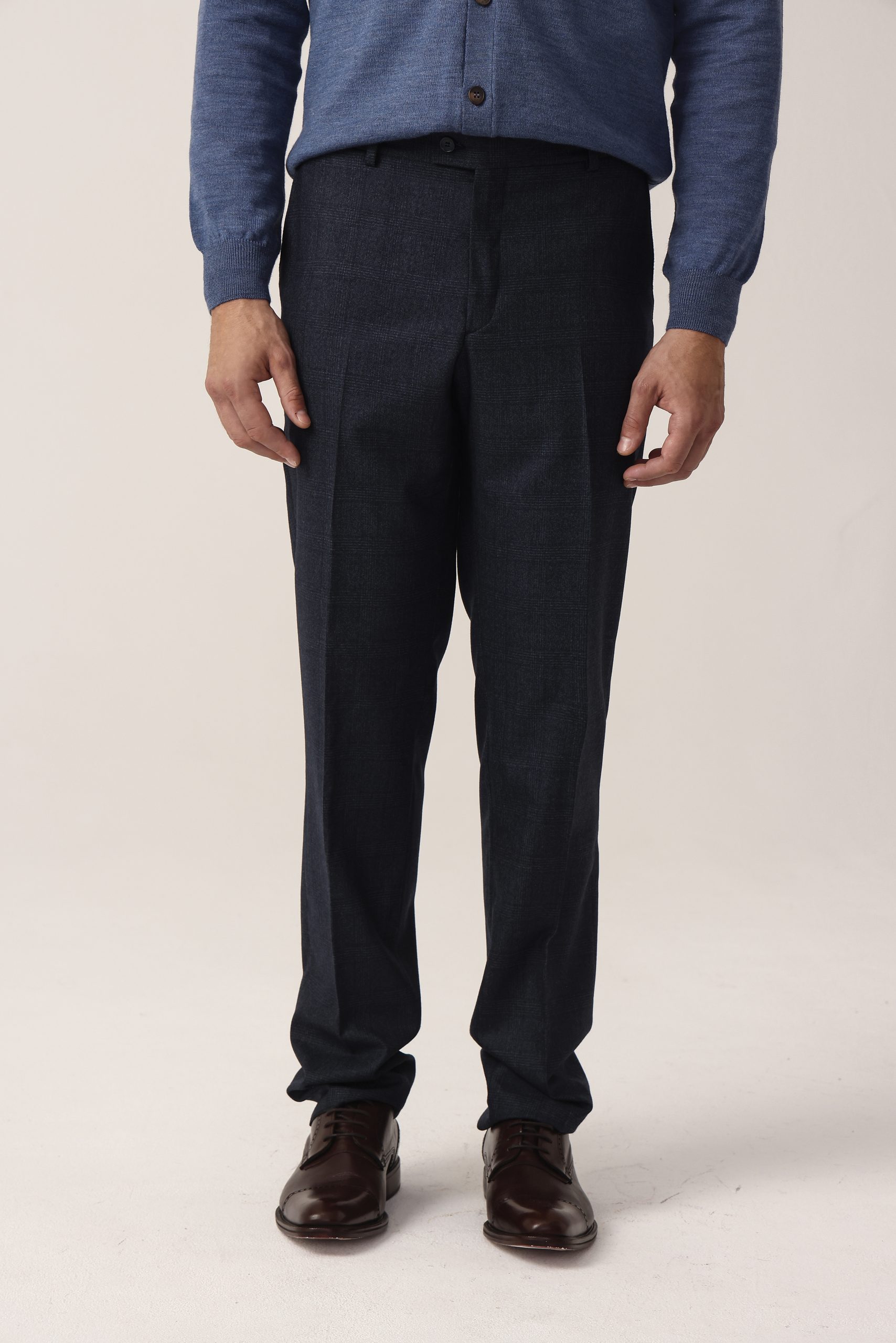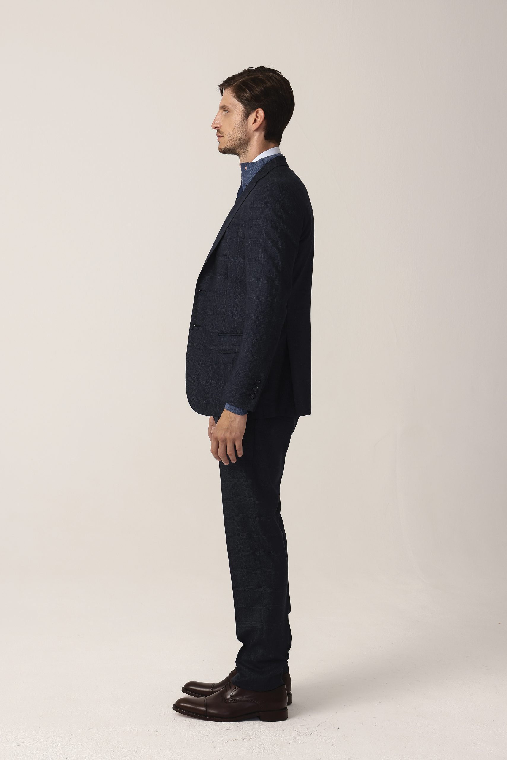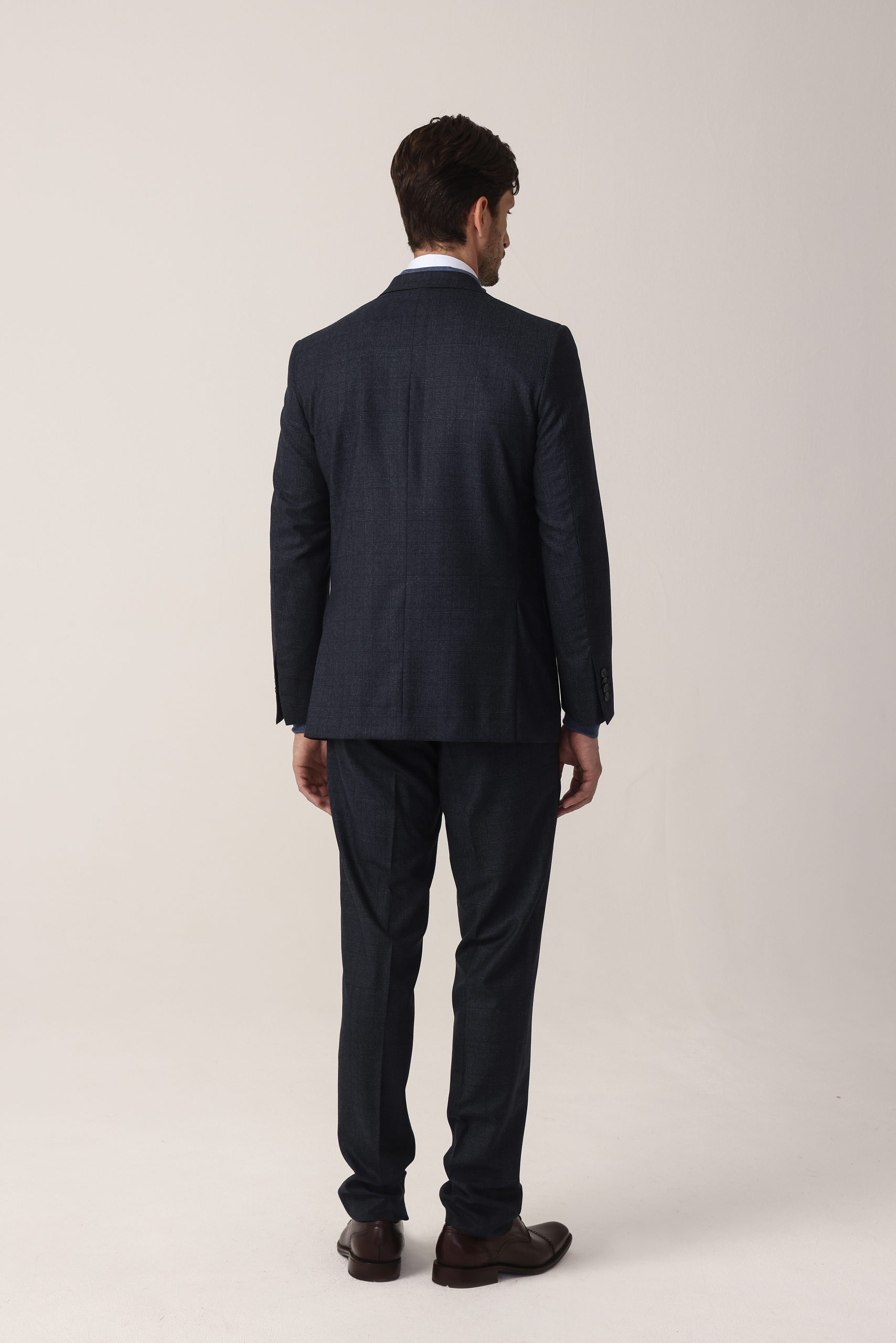 Ambo con fantasía cuadro ventana. Saco recto con dos botones. Solapa angosta. Doble abertura trasera. Interior forrado. Moldería regular. Pantalón sin pinzas. Cintura cruzada. Calce regular.