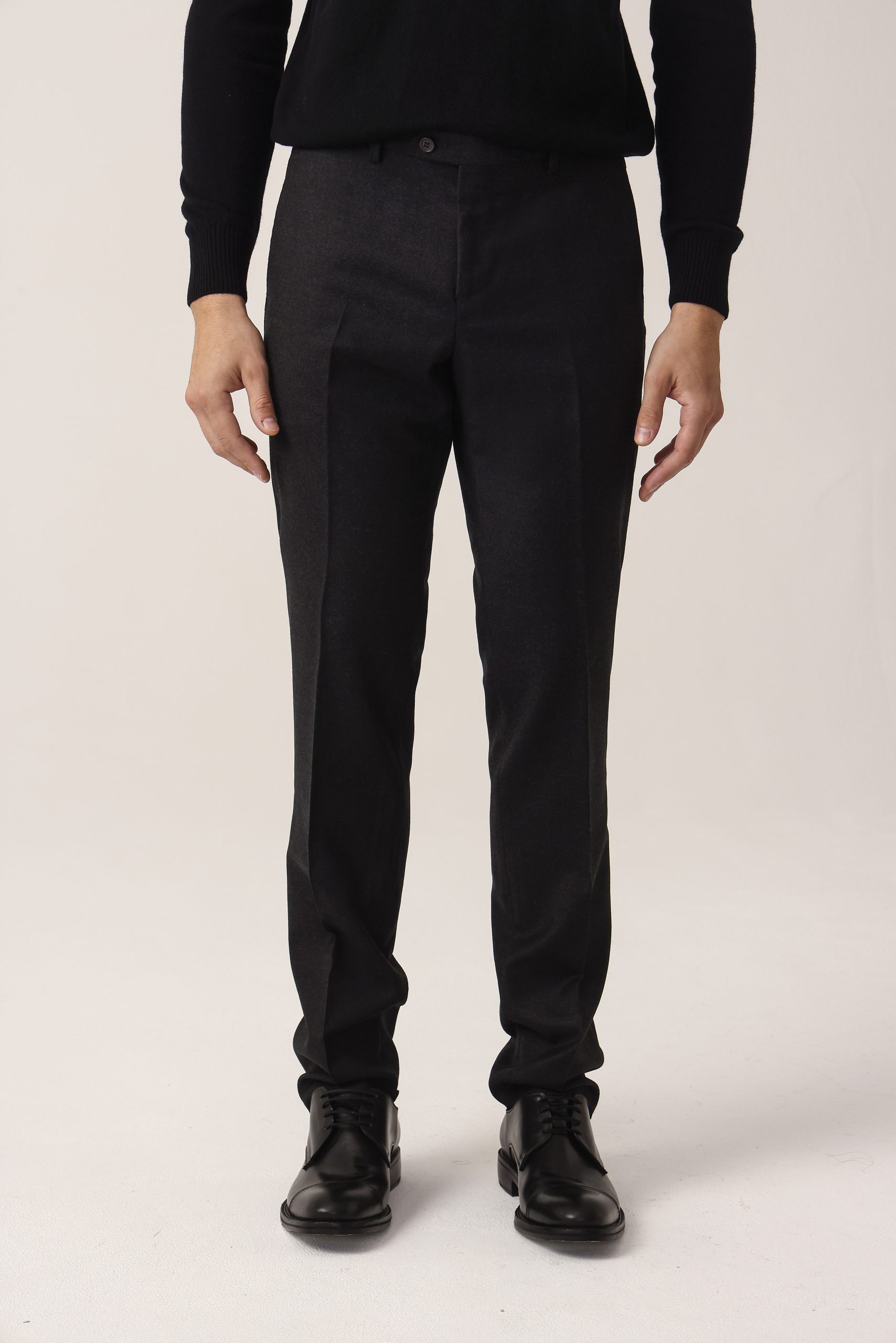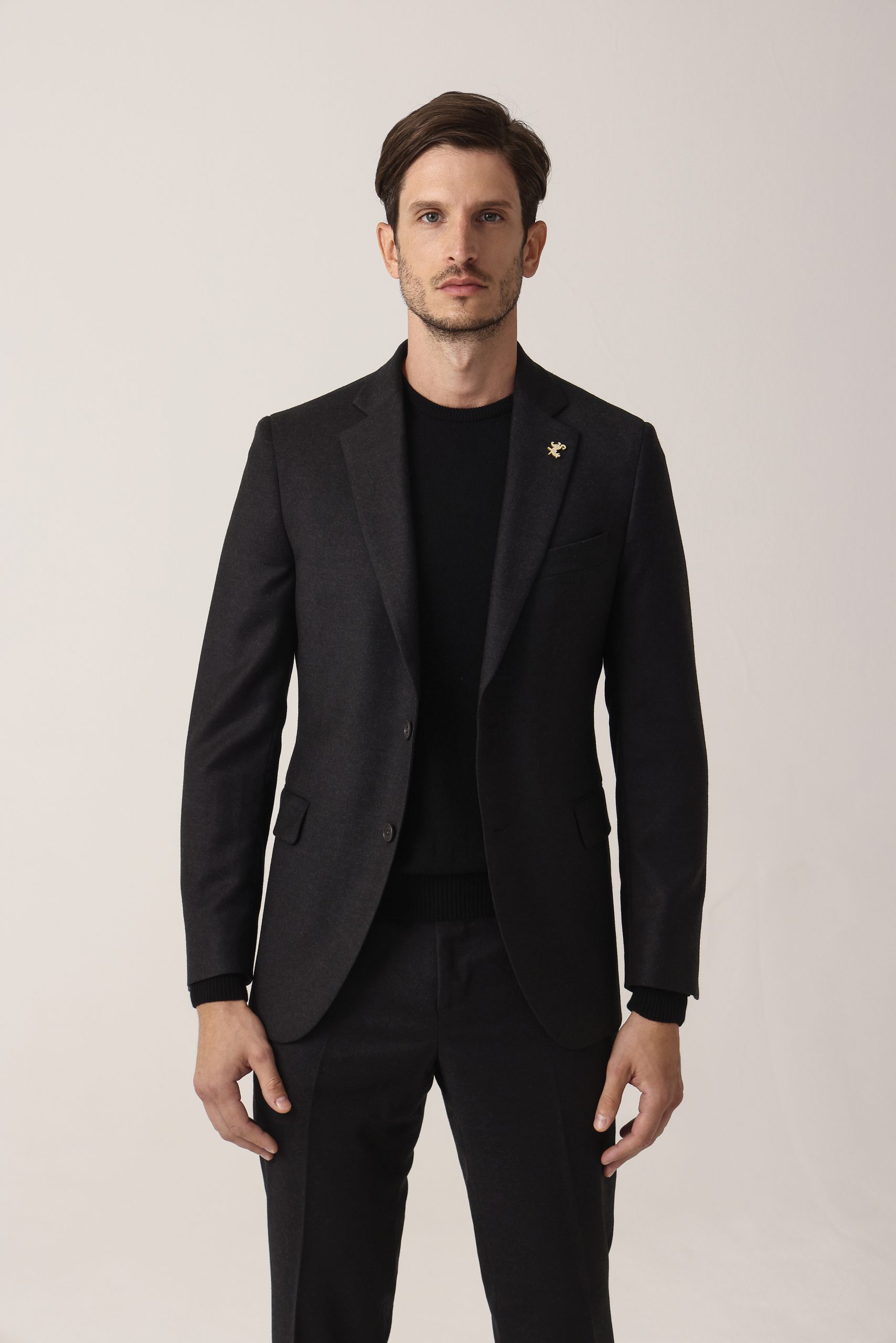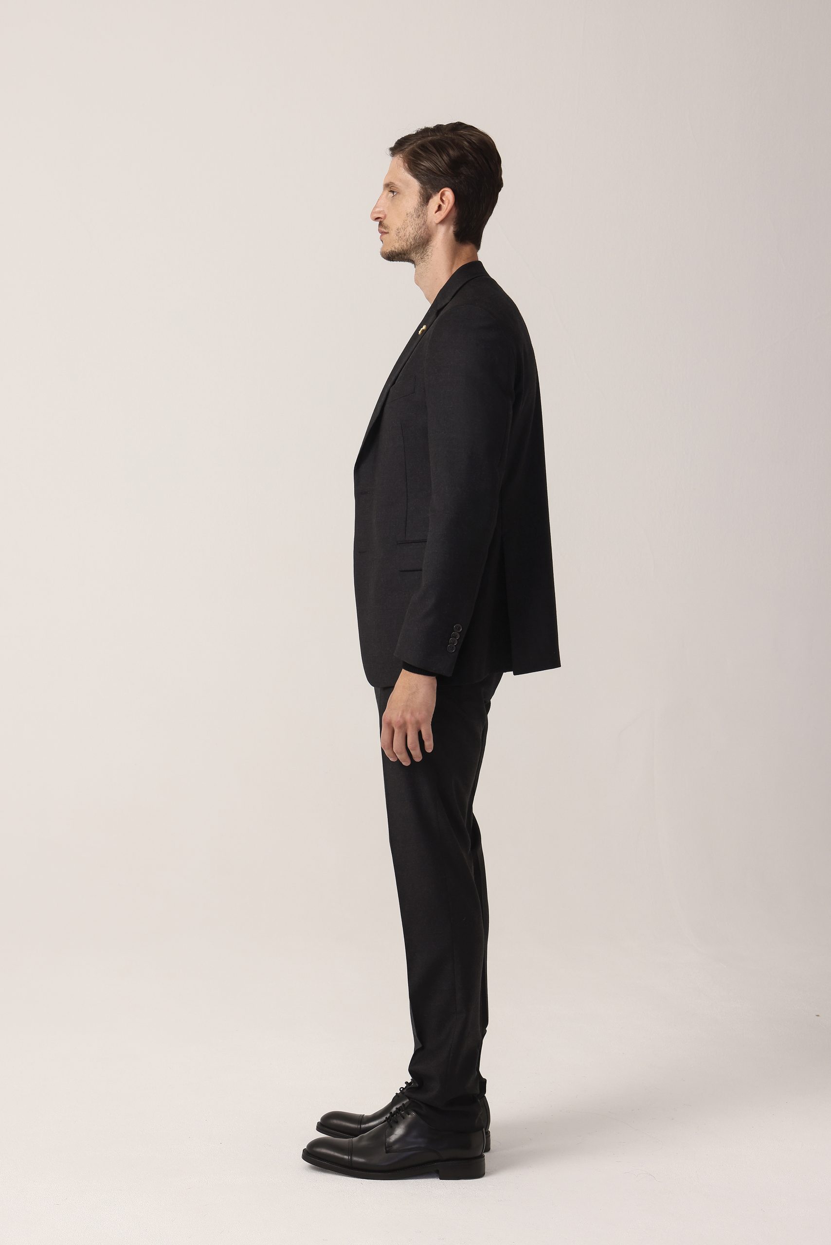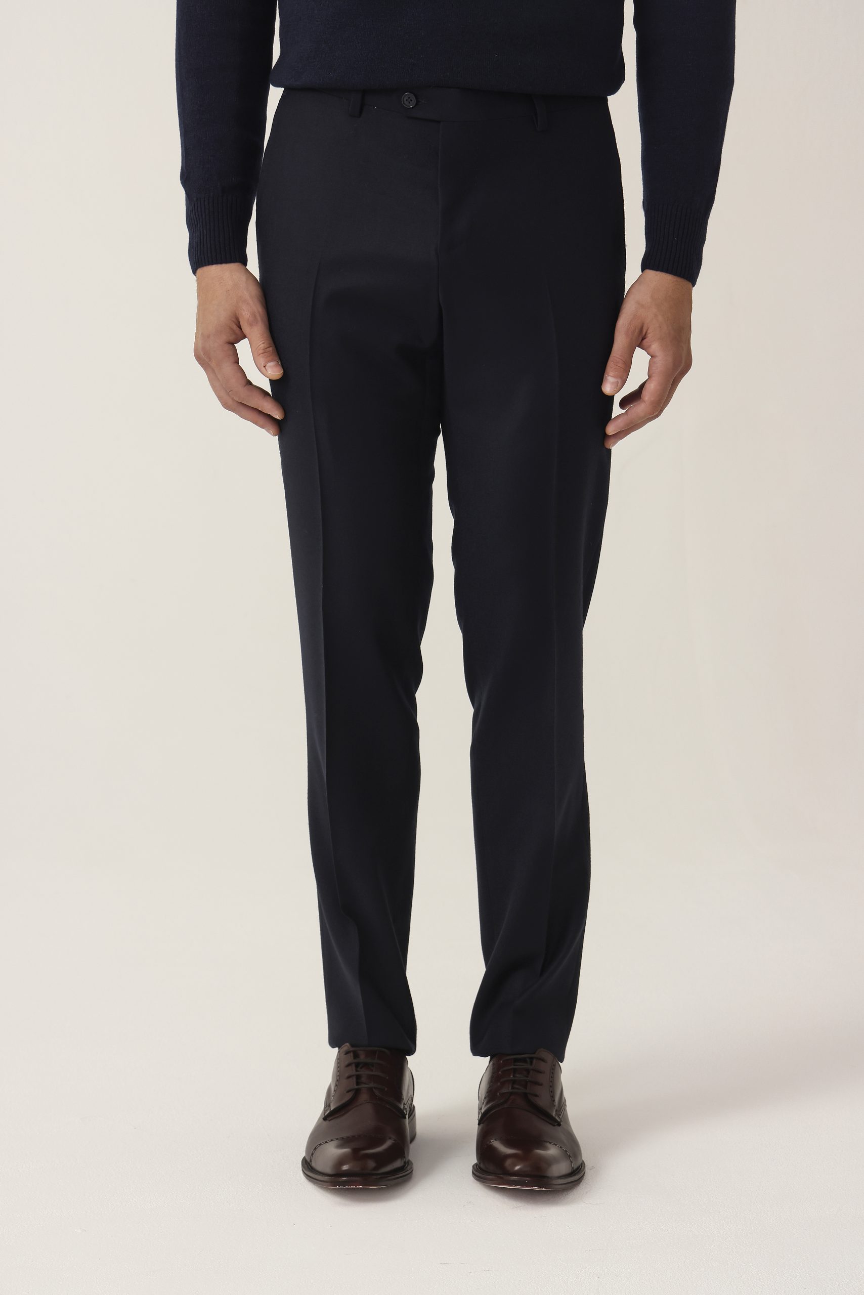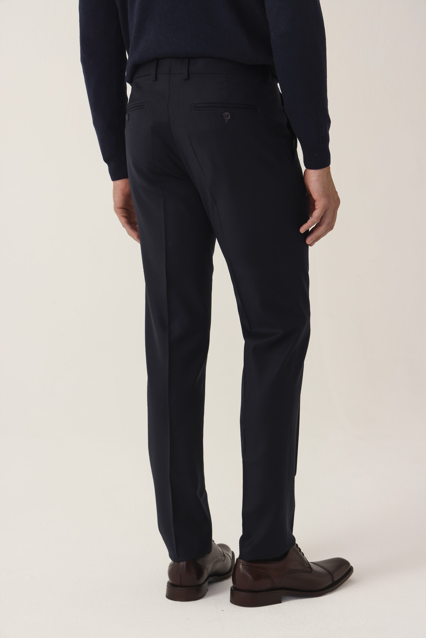 Ambo en cheviot liso Tombolini T300. Saco recto con dos botones. Solapa angosta. Interior forrado. Doble abertura trasera.