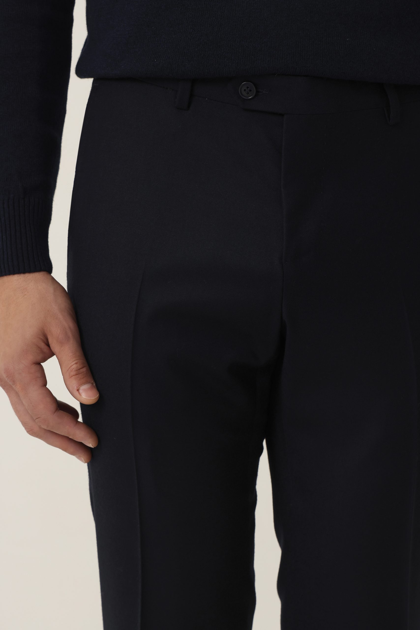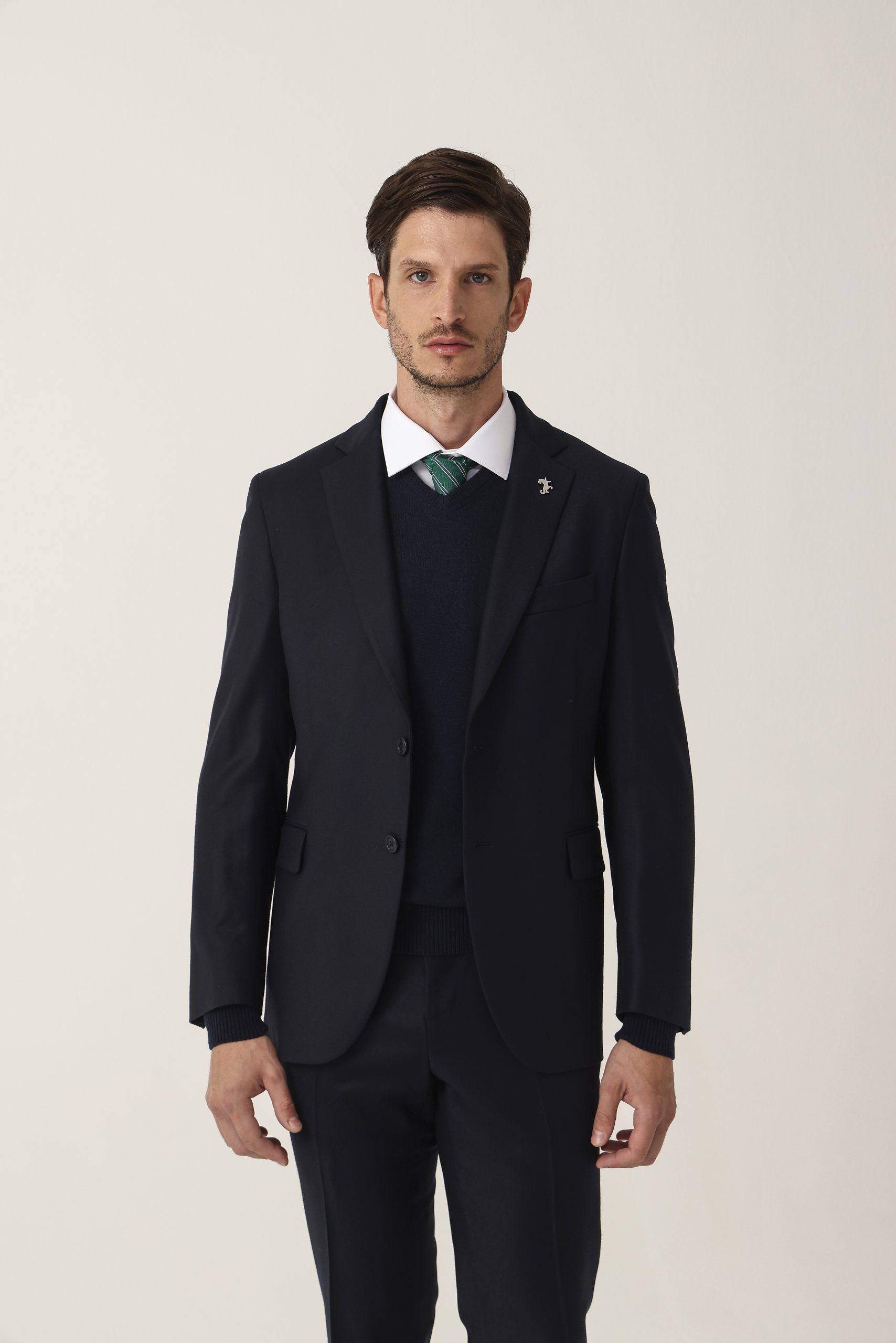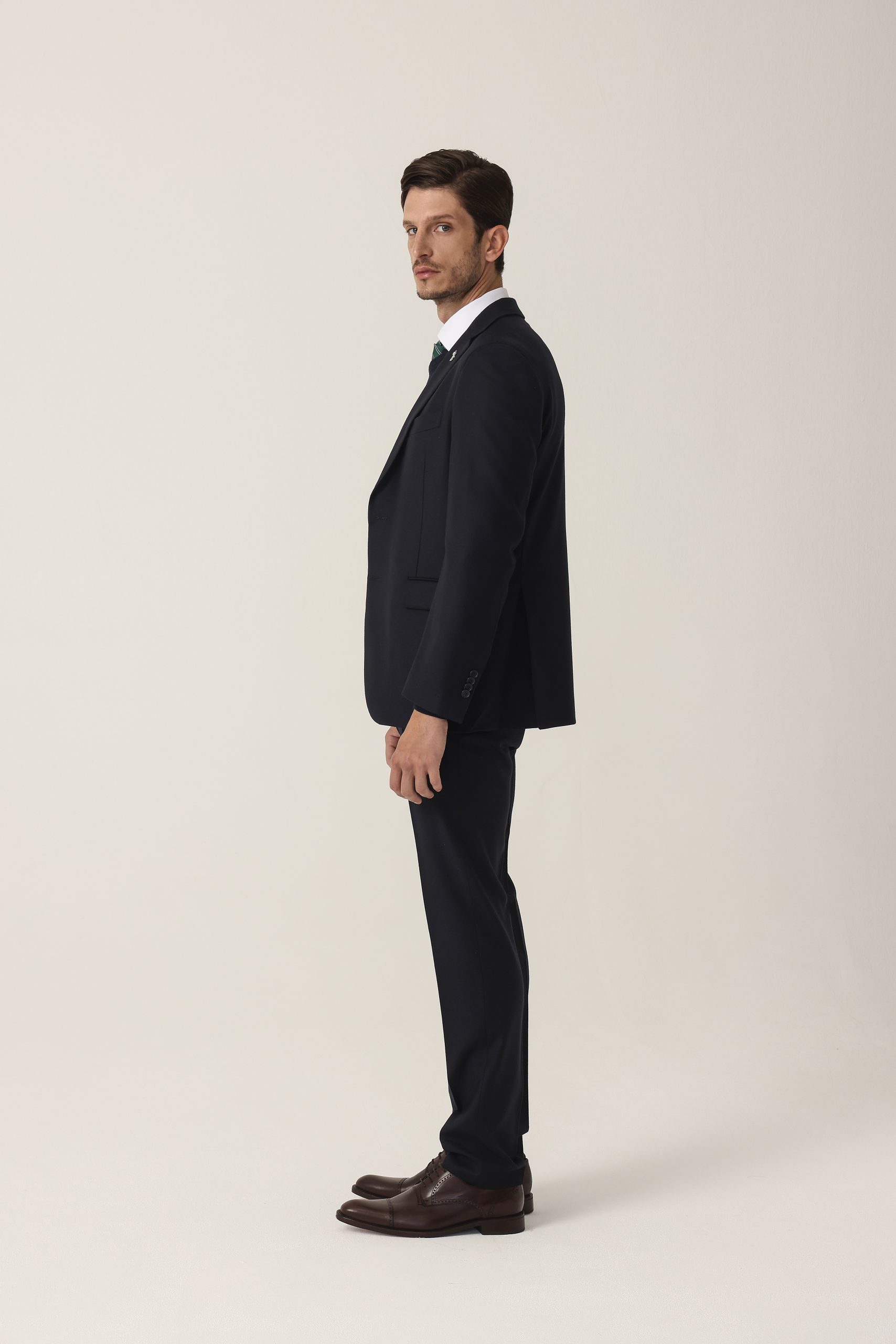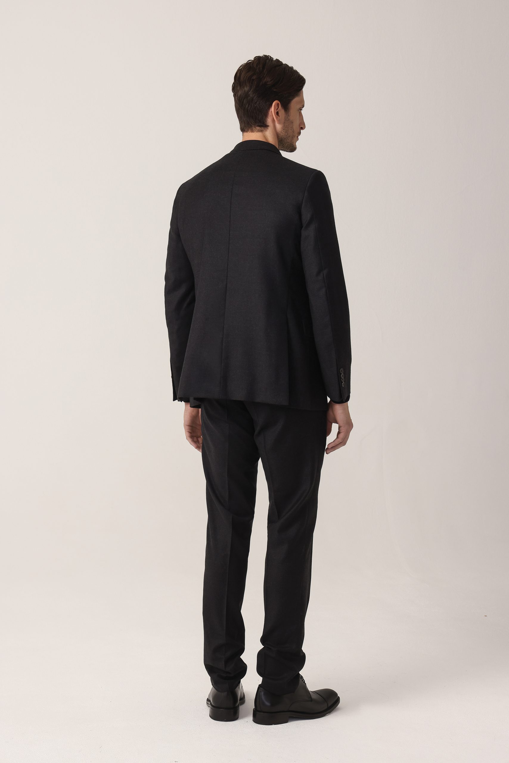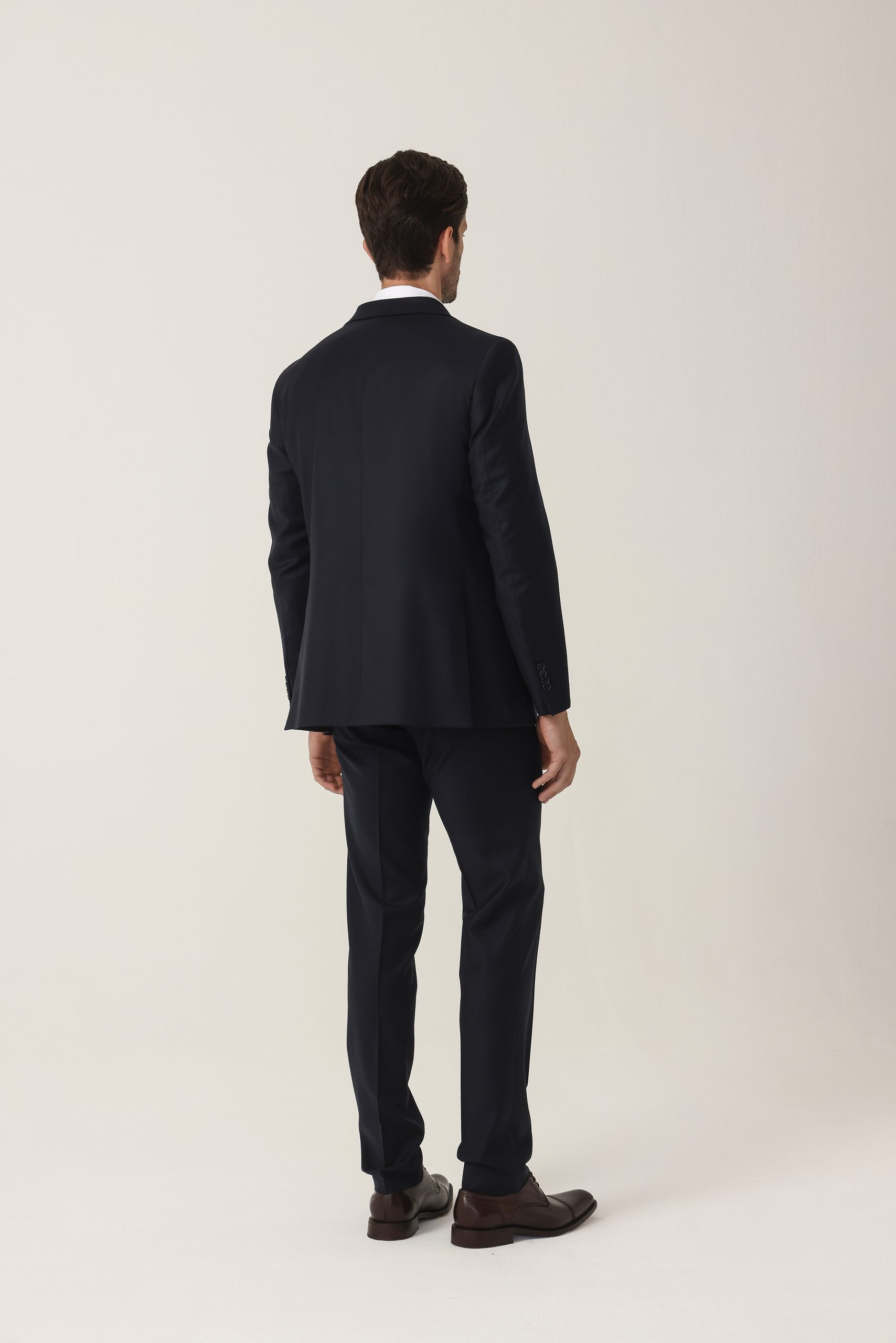 Ambo en cheviot liso Tombolini T300. Saco recto con dos botones. Solapa angosta. Interior forrado. Doble abertura trasera.