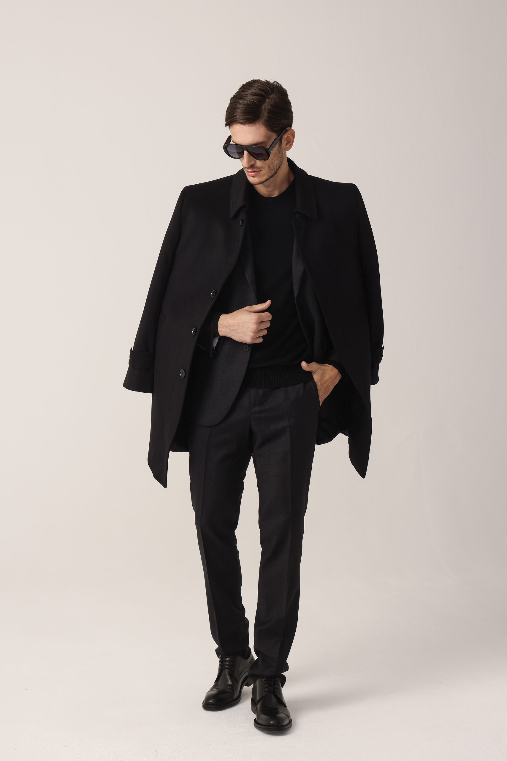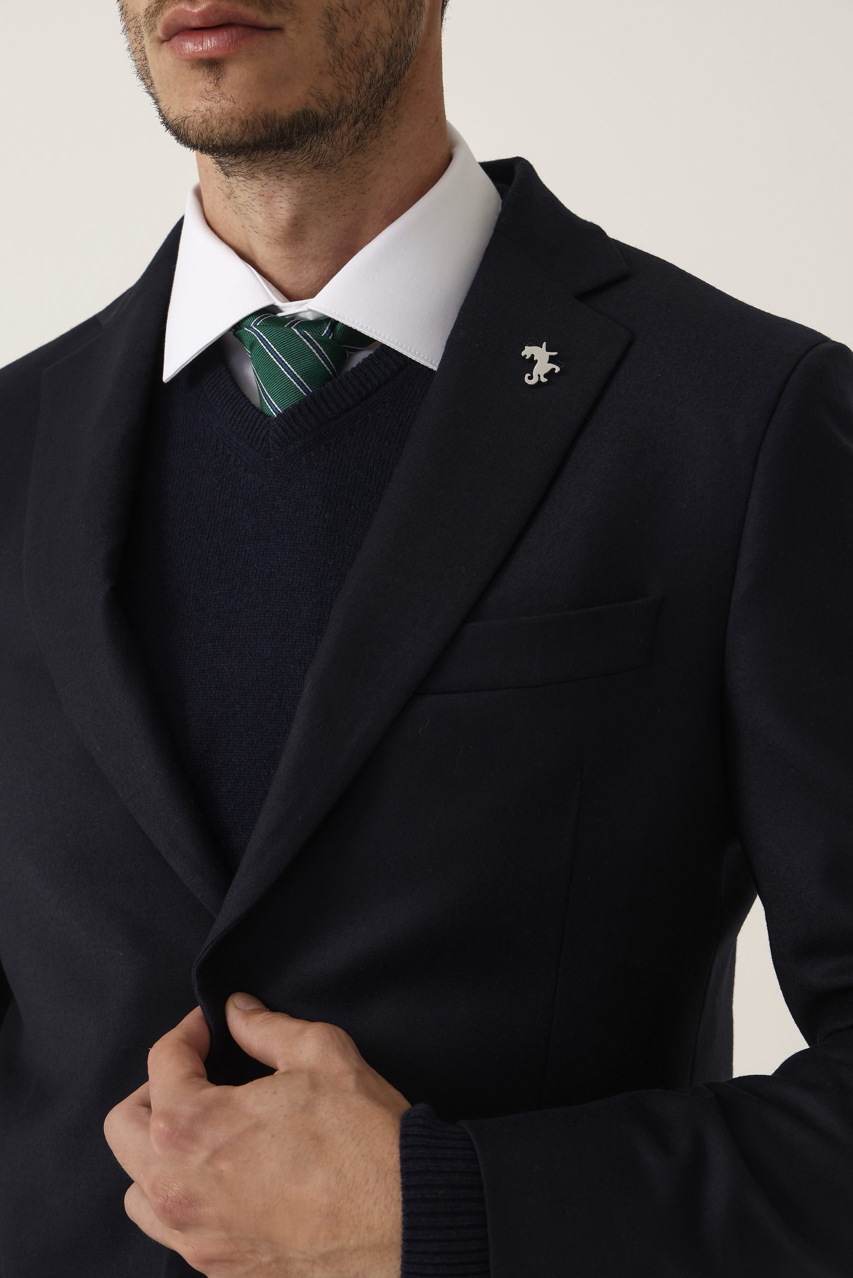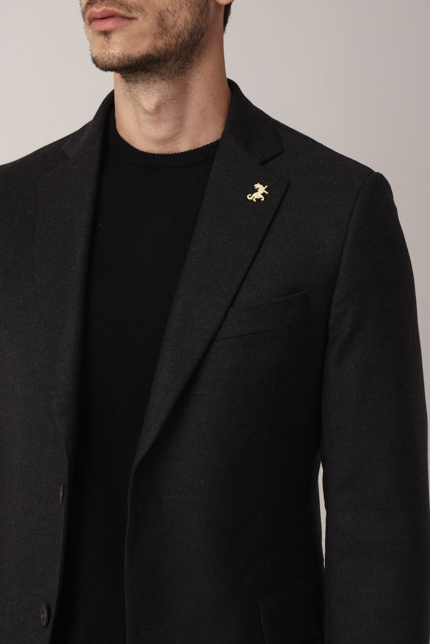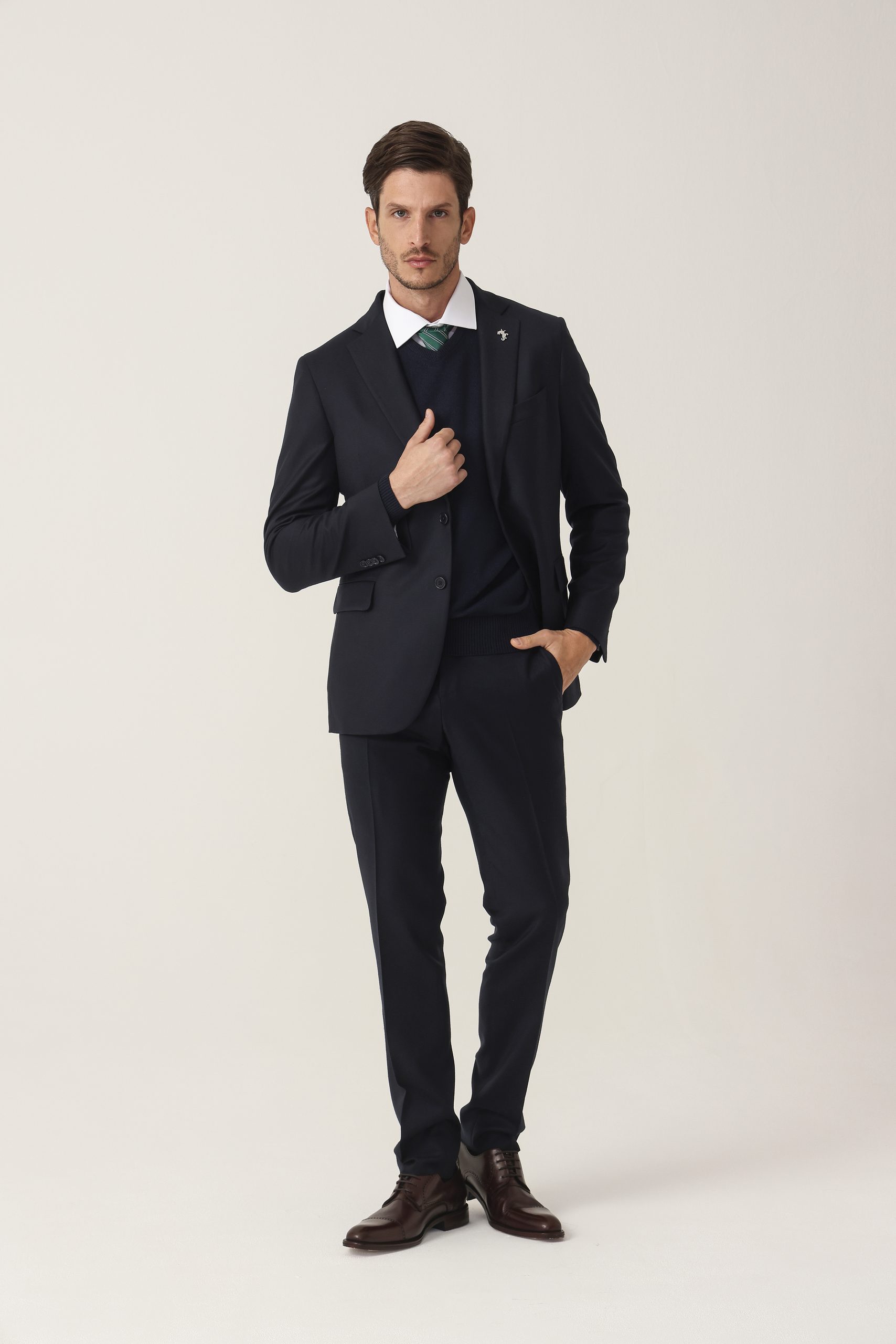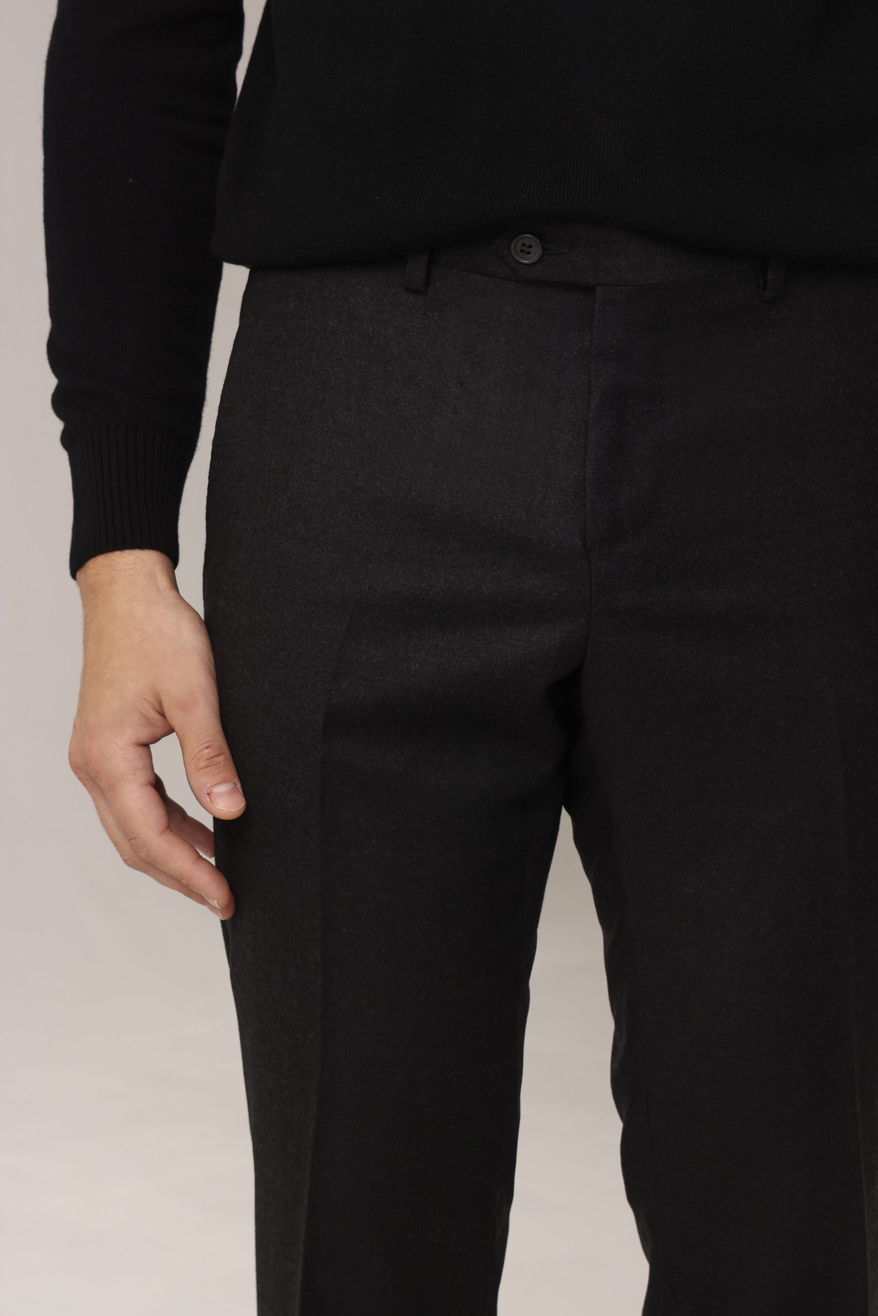 Ambo en cheviot liso Tombolini T300. Saco recto con dos botones. Solapa angosta. Interior forrado. Doble abertura trasera.