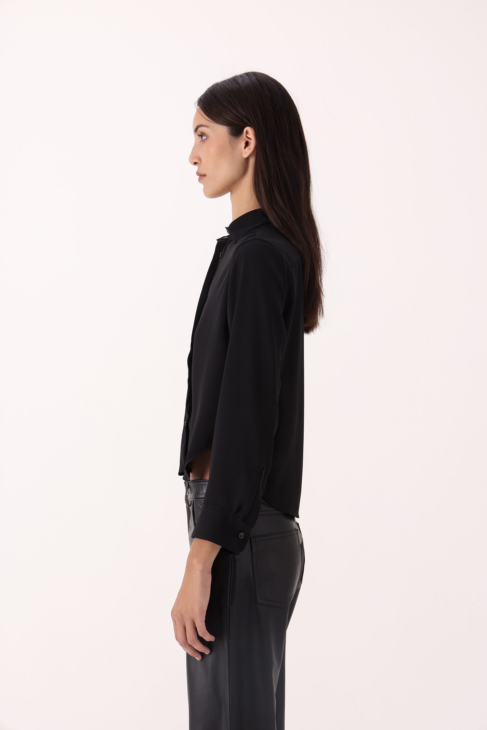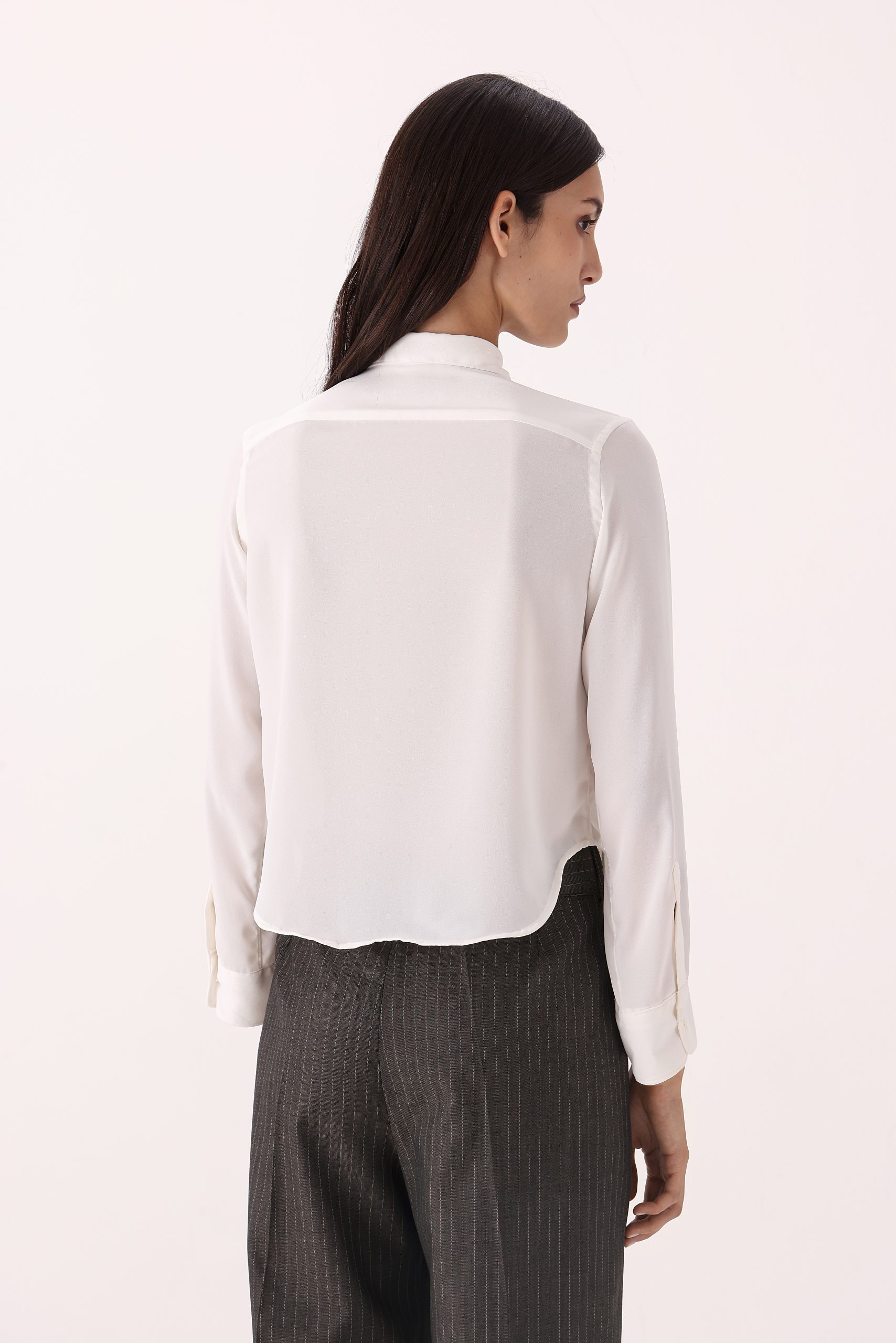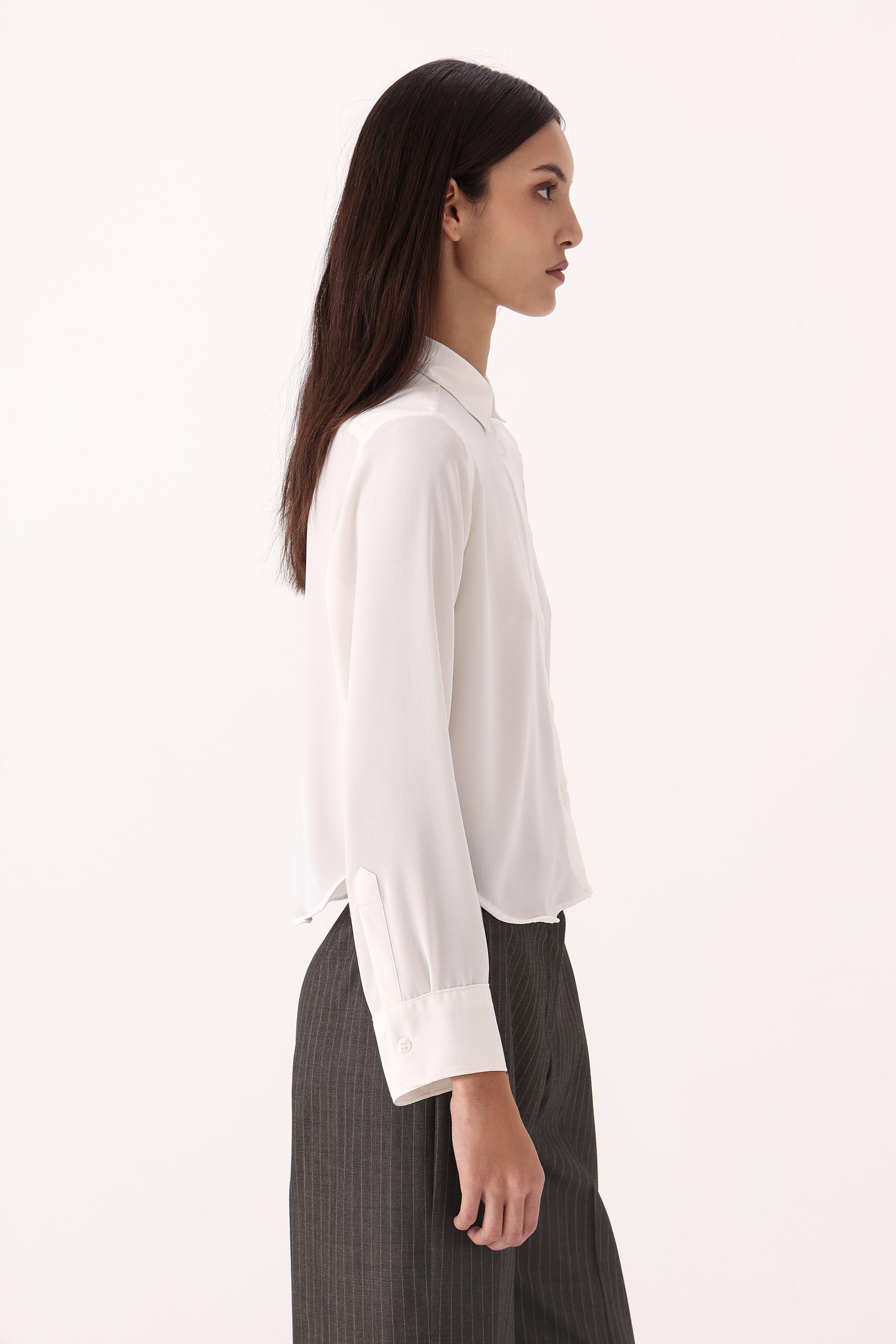 Camisa corta de dama lisa. Cuello italiano. Cartera simple. Moldería regular.