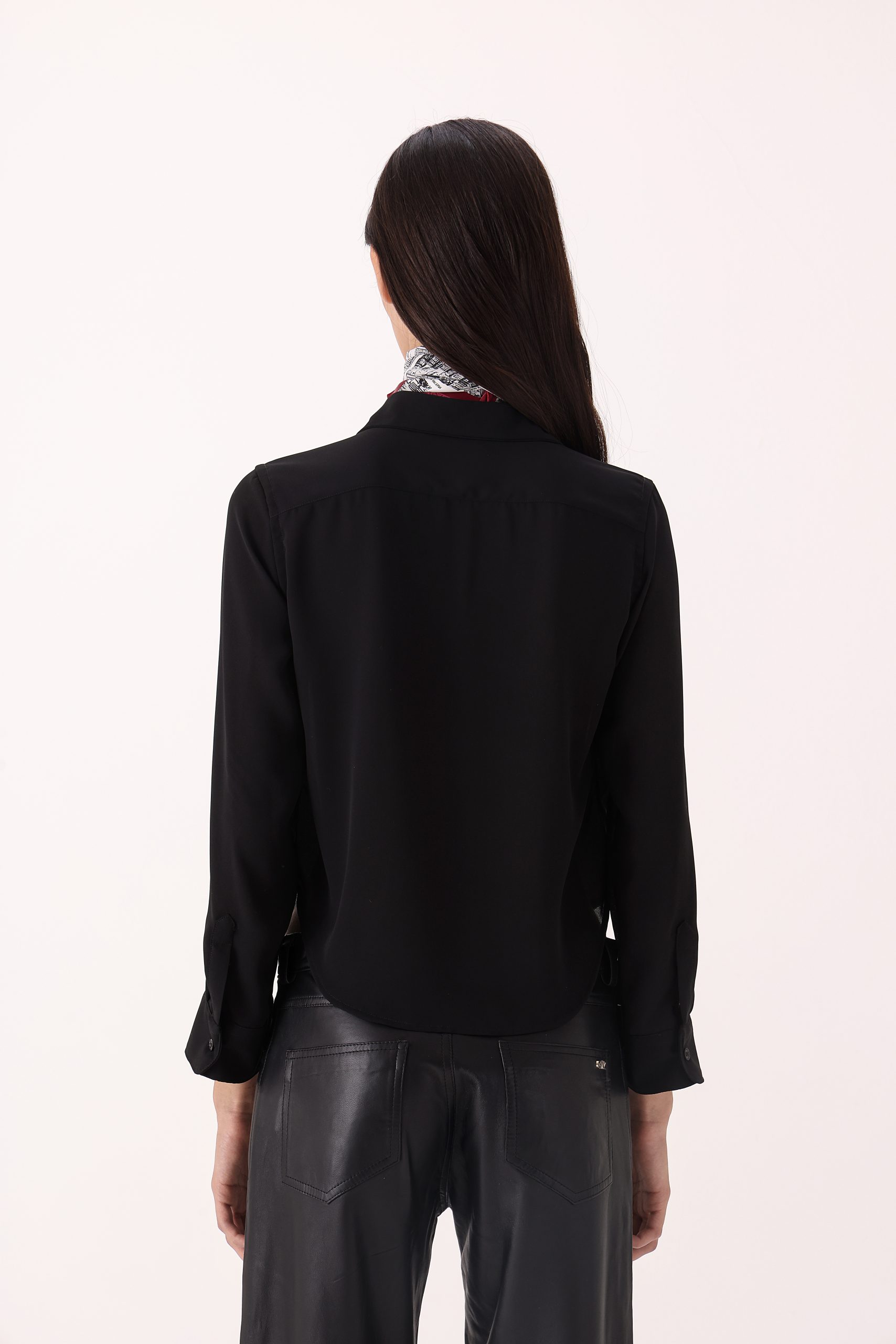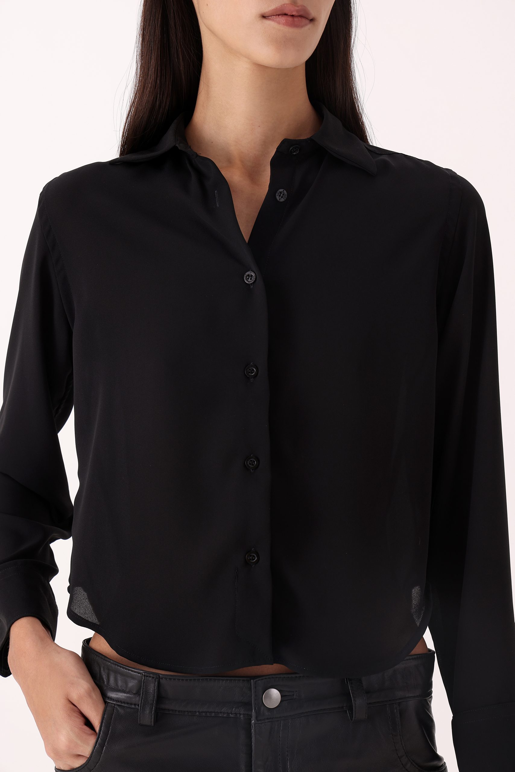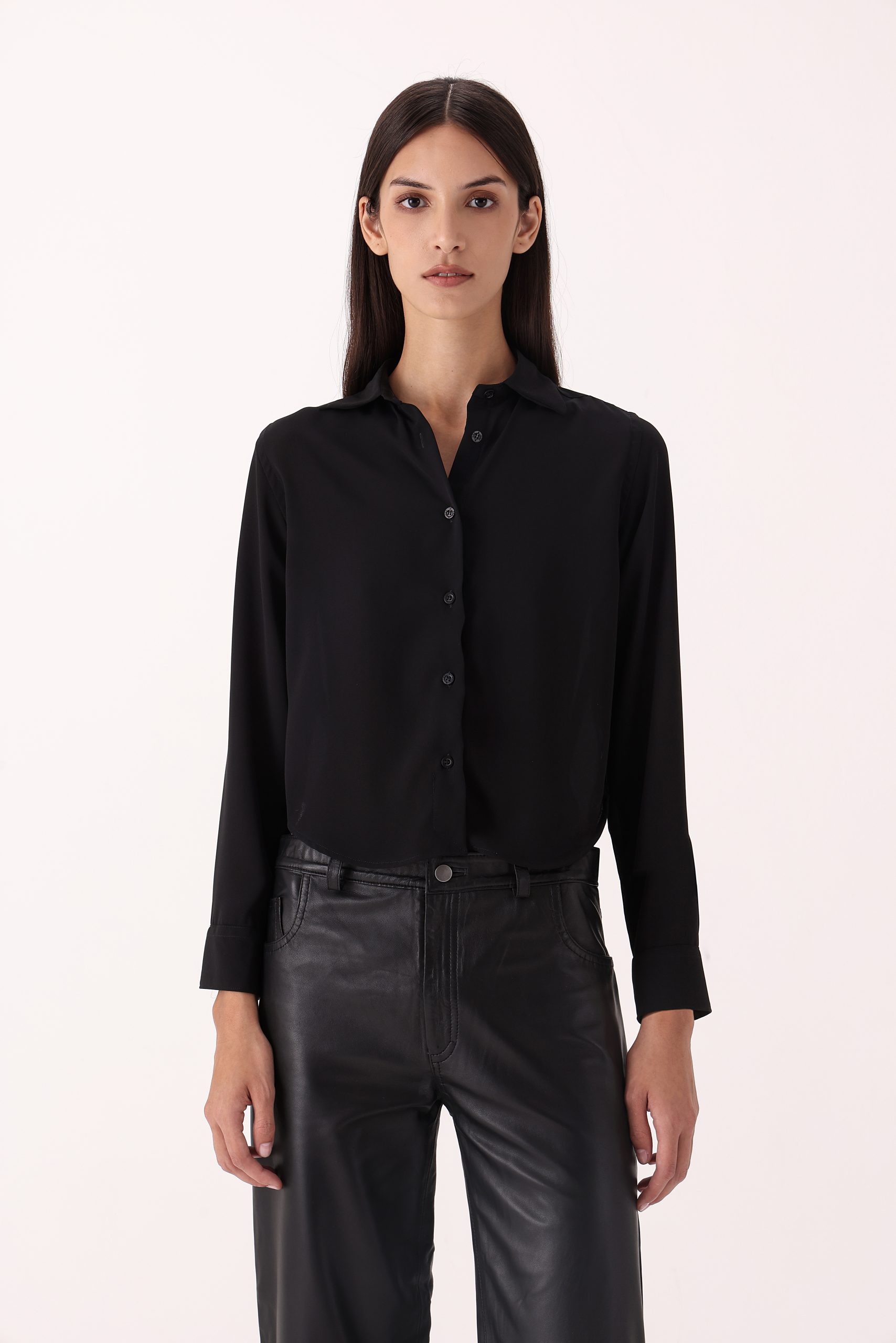 Camisa corta de dama lisa. Cuello italiano. Cartera simple. Moldería regular.