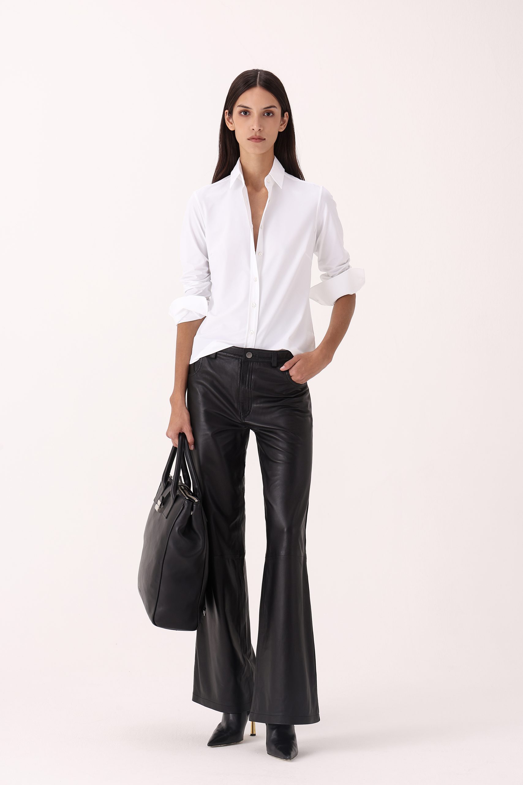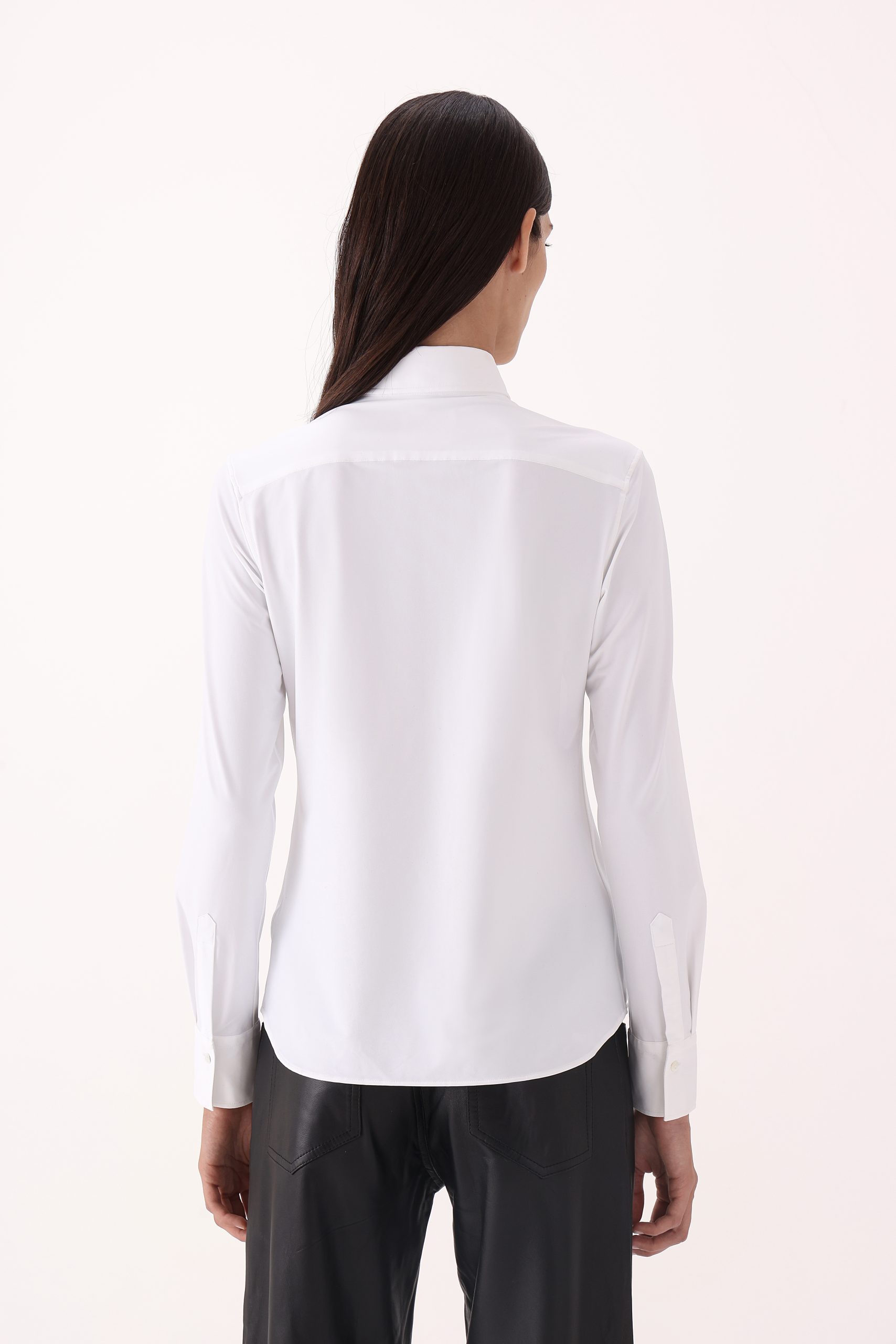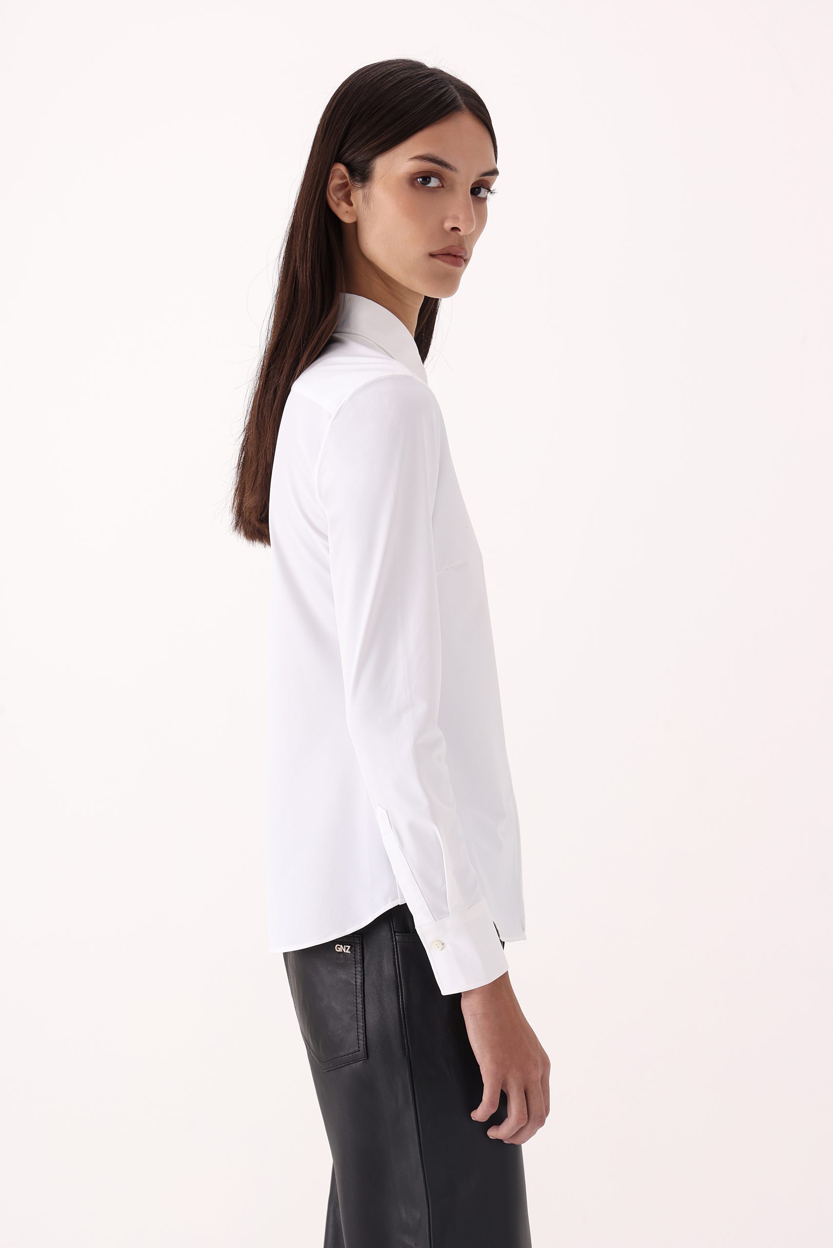 Camisa de dama lisa Xacus. Cuello italiano alto. Cartera simple reforzada. Moldería regular.
