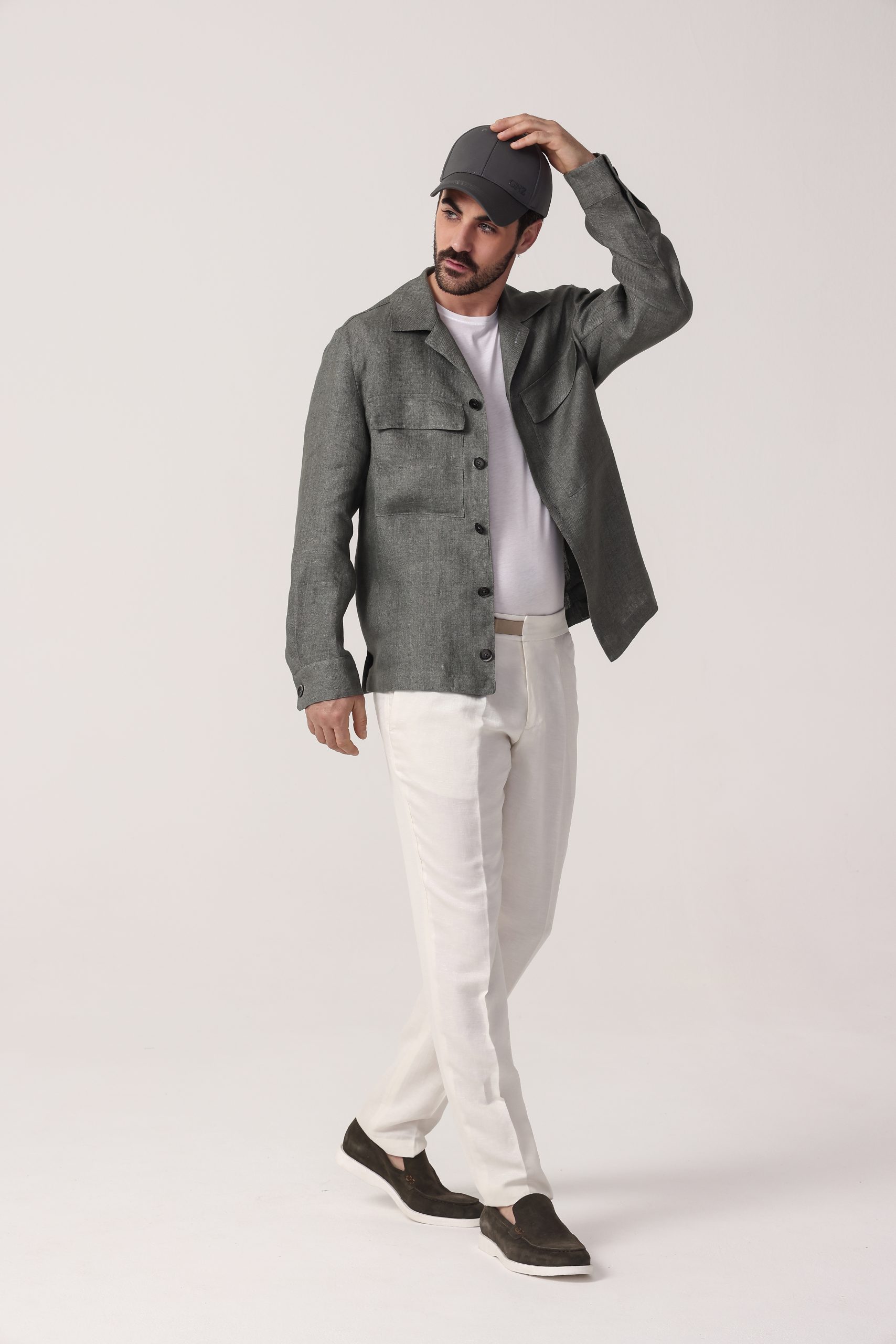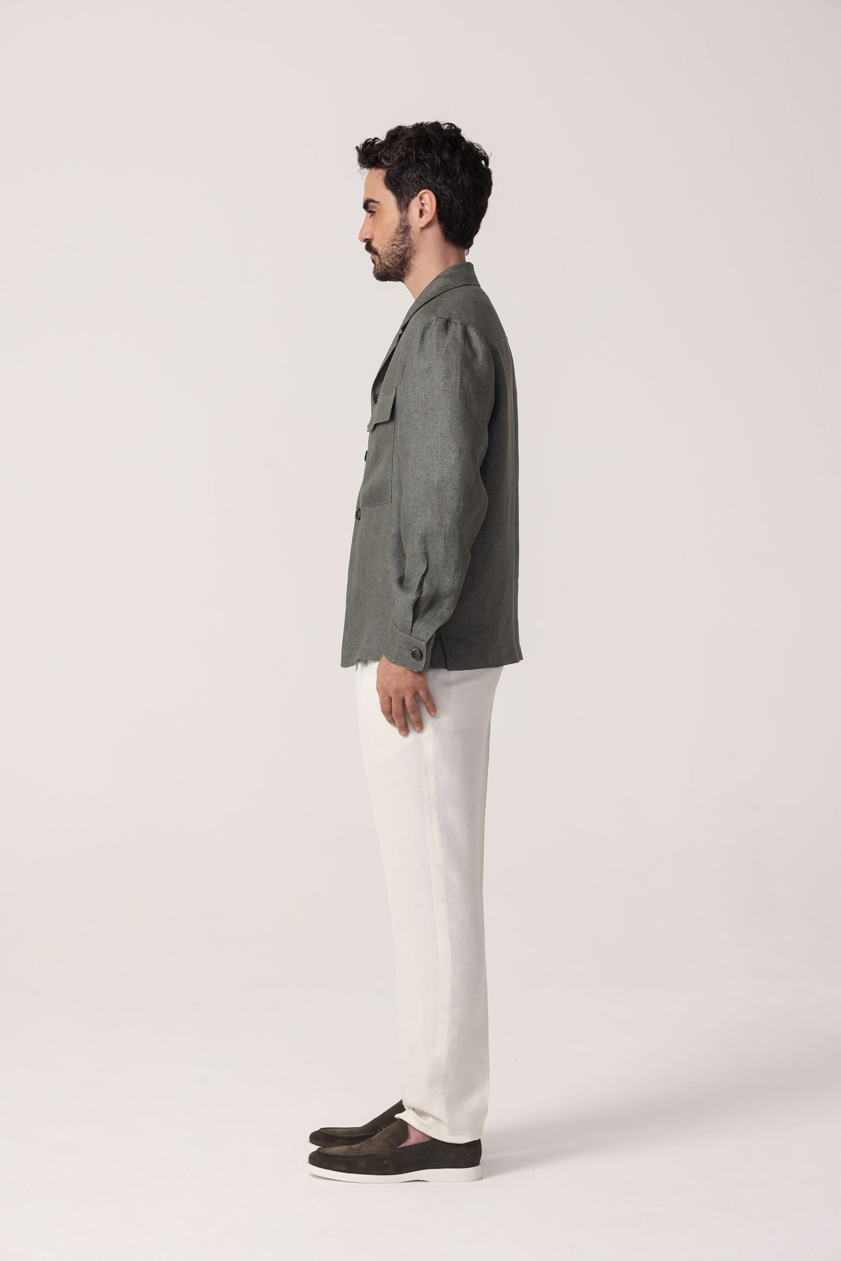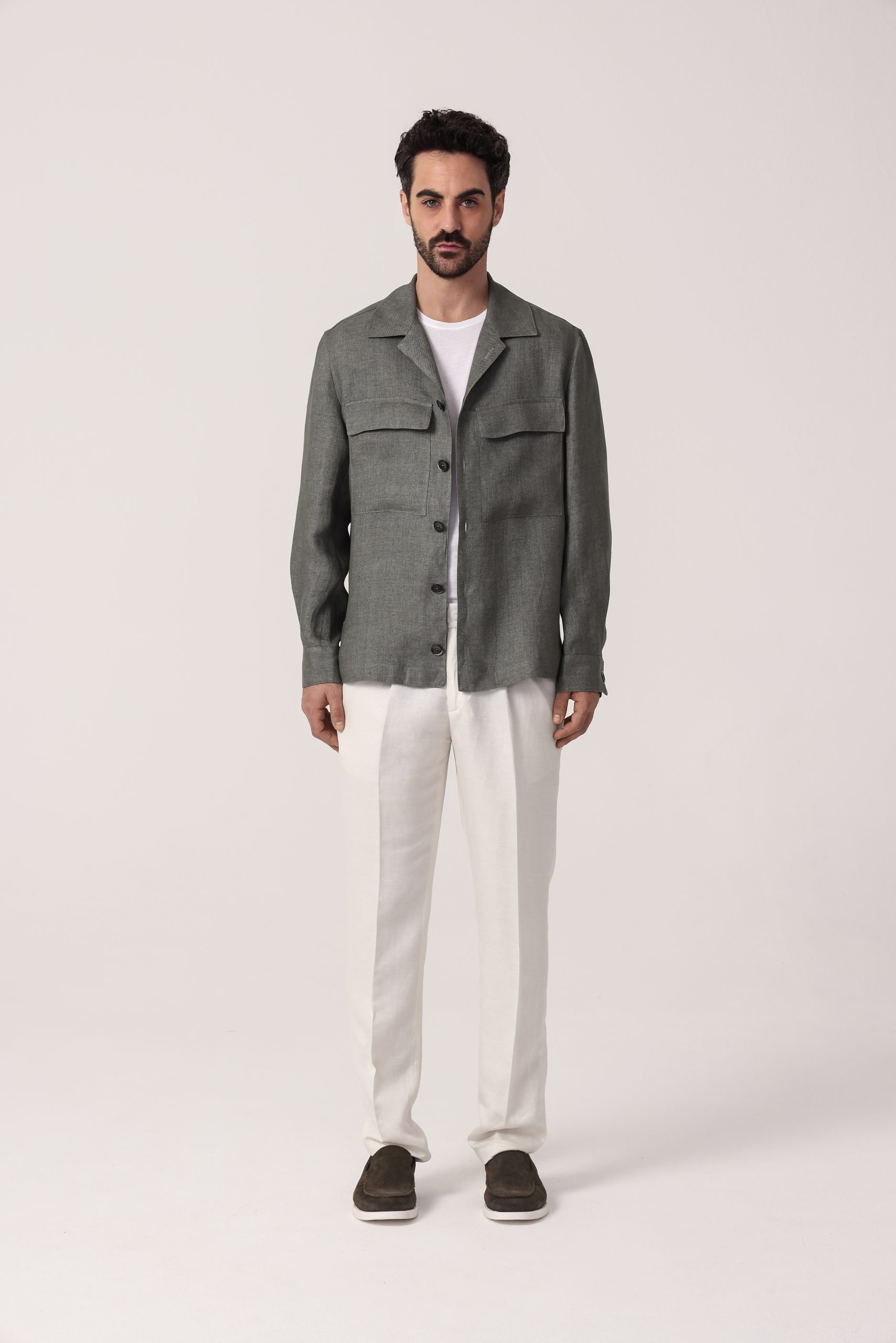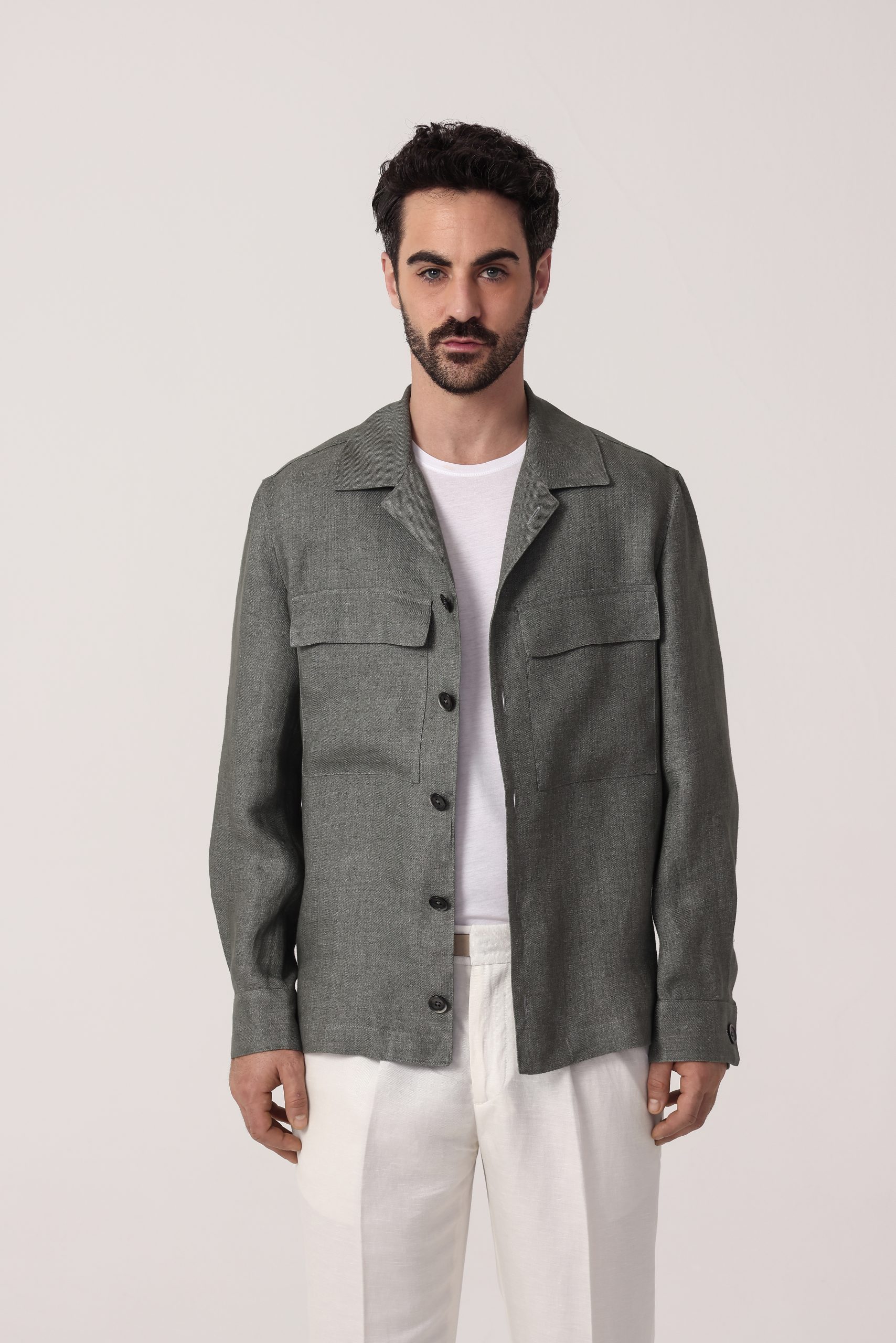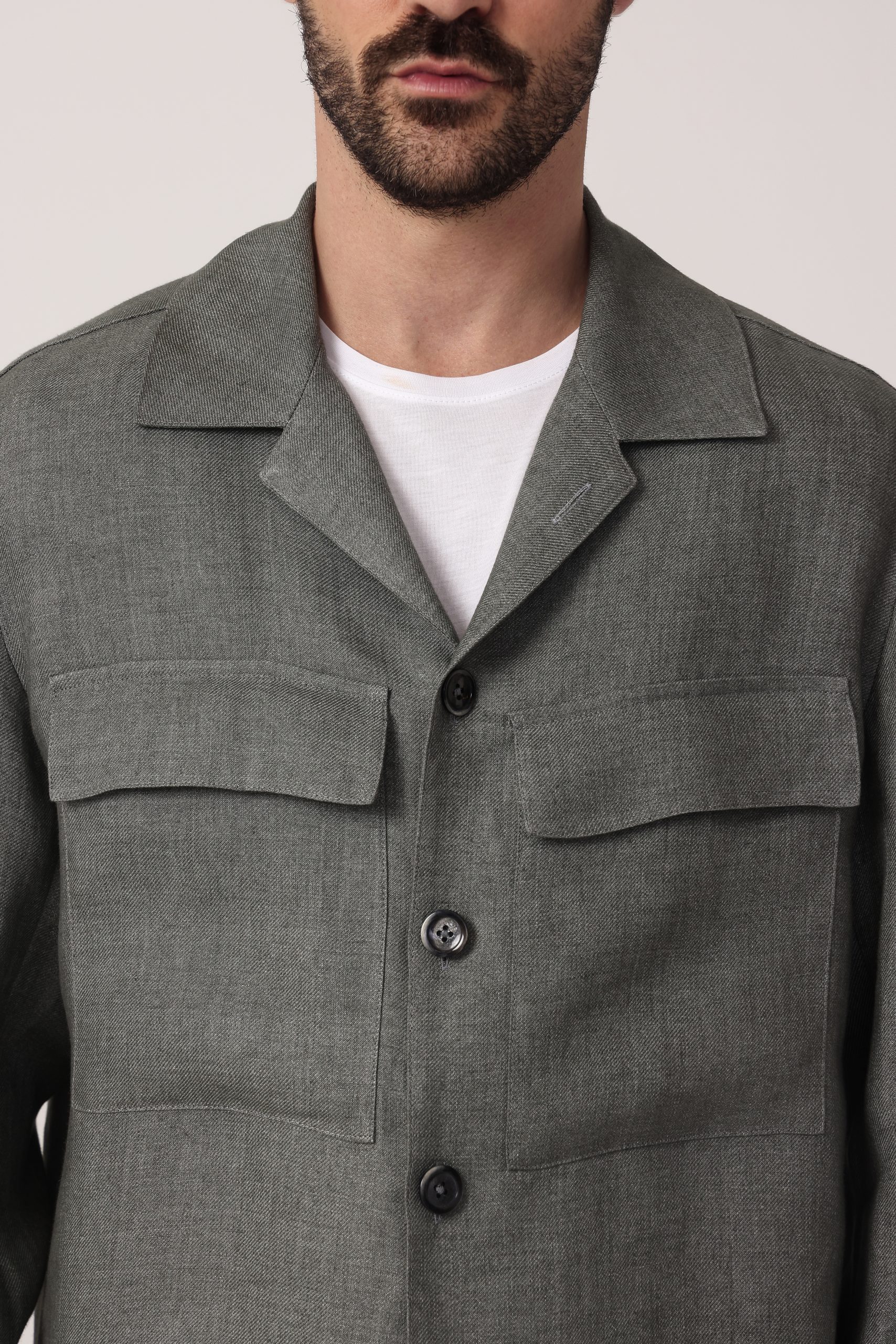 Camisaco de lino Tombolini Dream. Cartera con botones. Bolsillos frontales con tapa. Interior sin forro. Puños con botones. Moldería regular.