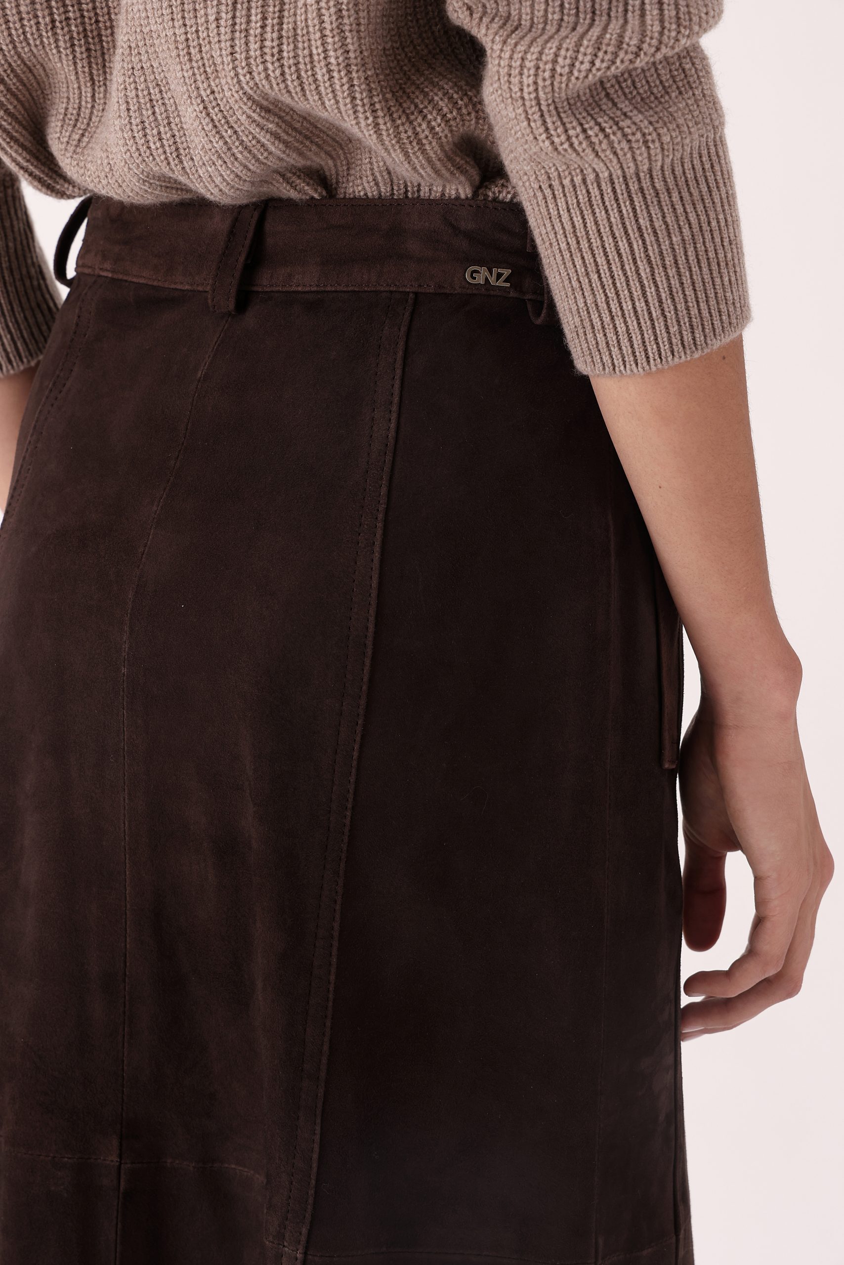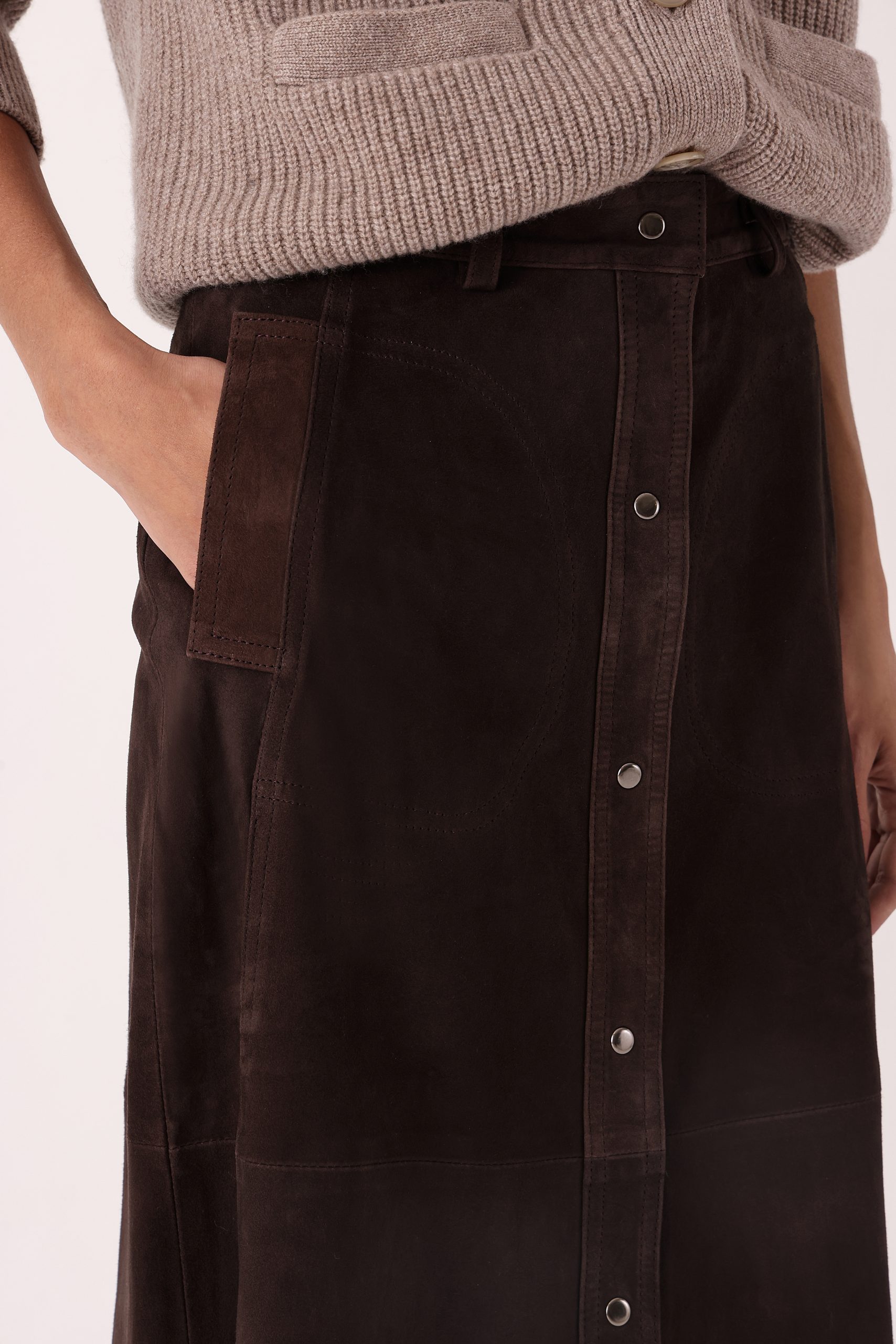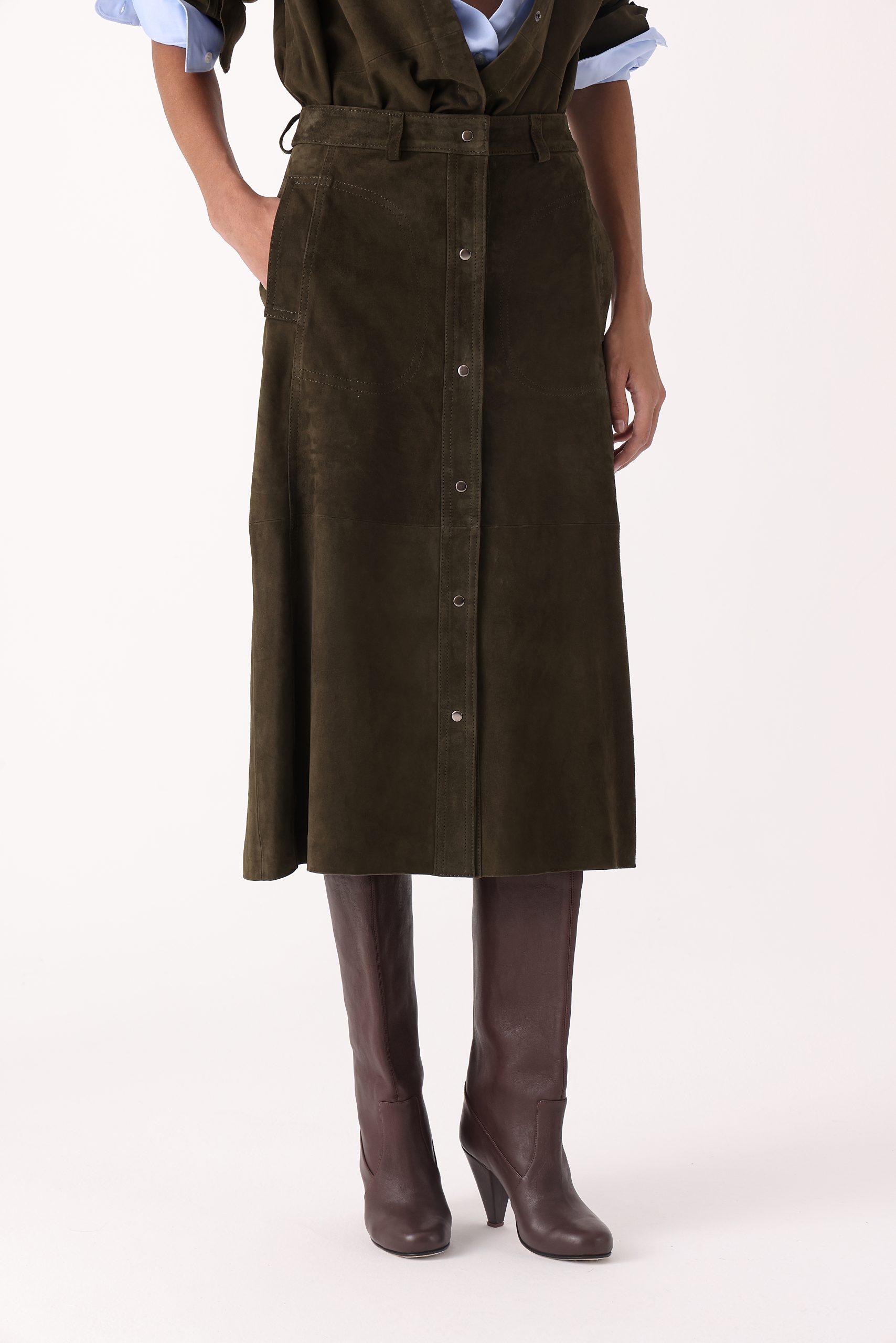 Falda larga de gamuza. Corte recto. Cartera simple con broches. Bolsillos con tapa. Recortes con pespuntes al tono.