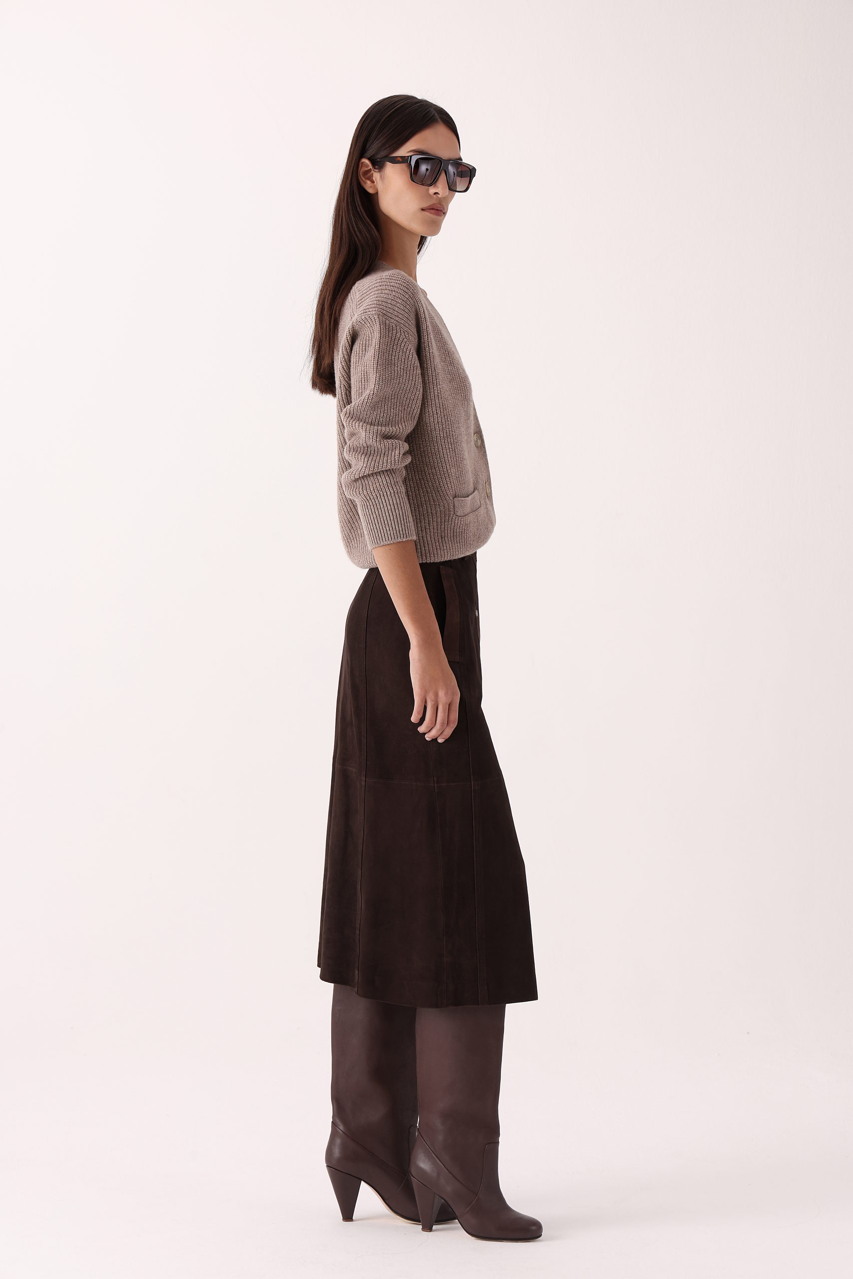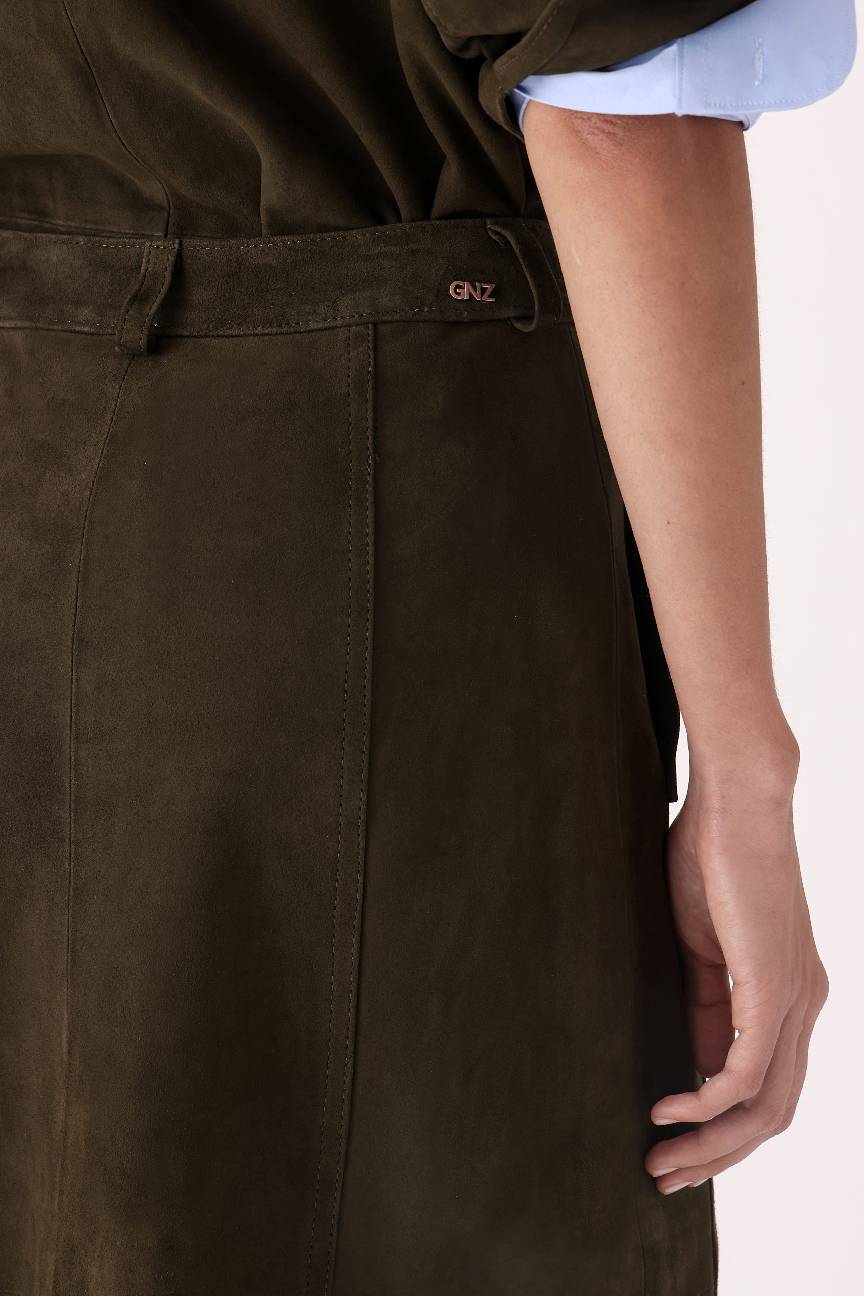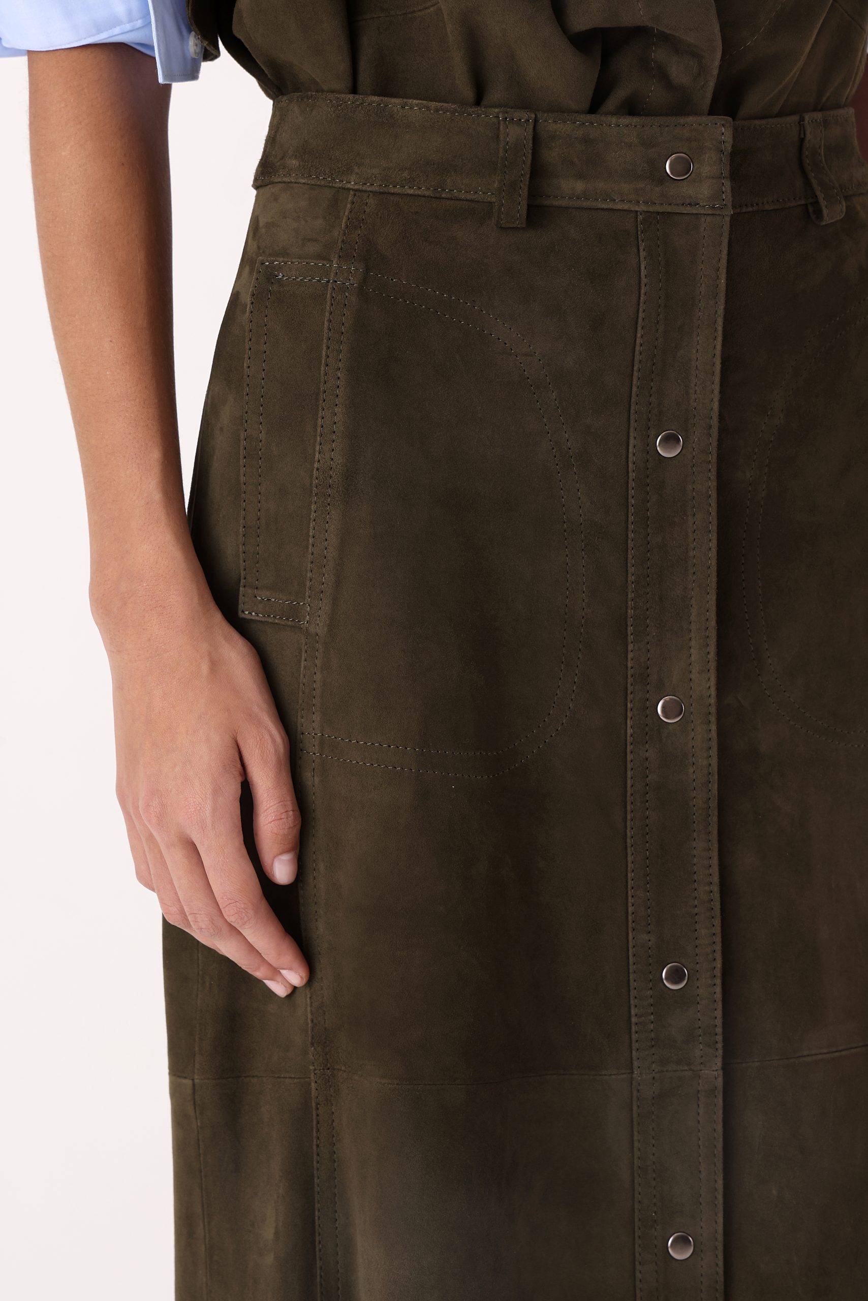 Falda larga de gamuza. Corte recto. Cartera simple con broches. Bolsillos con tapa. Recortes con pespuntes al tono.