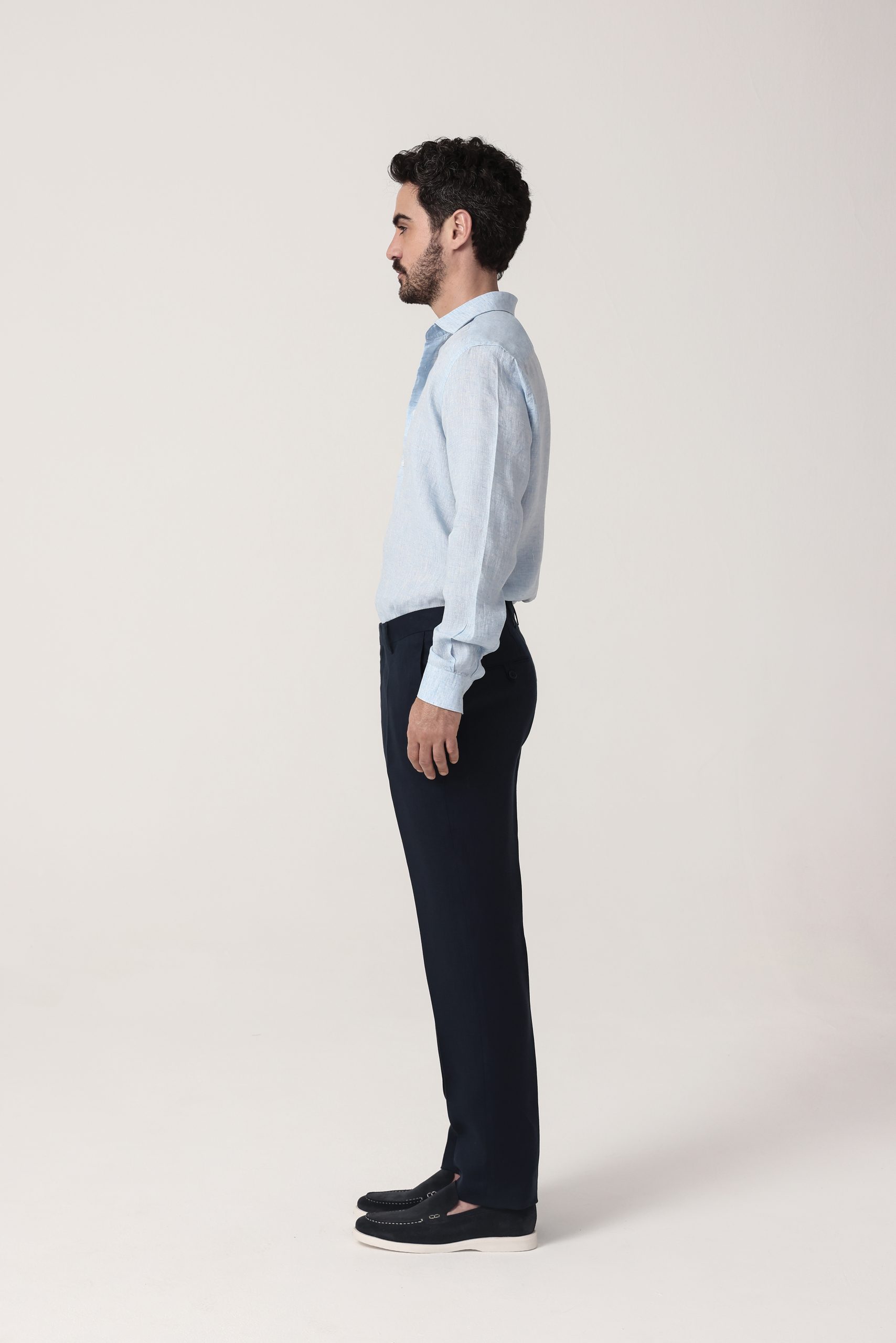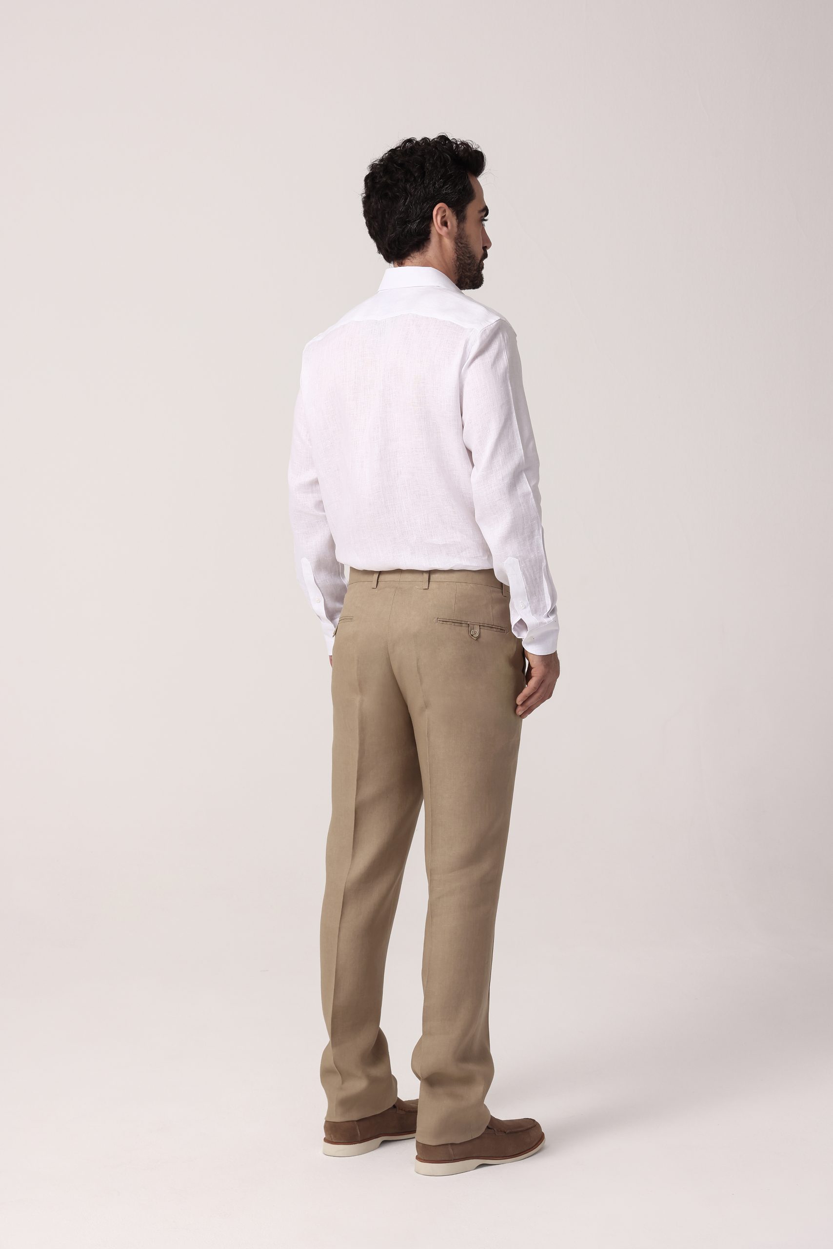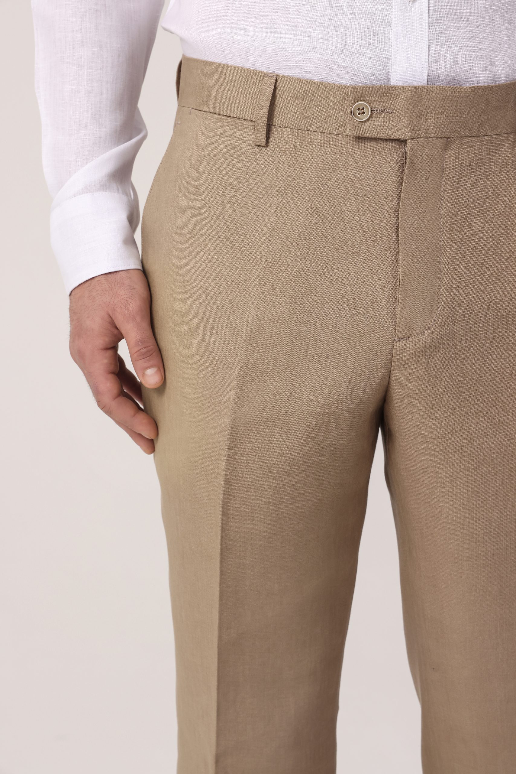 Pantalón de lino recto sin pinza. Cintura cruzada con cartera simple. Molderia regular