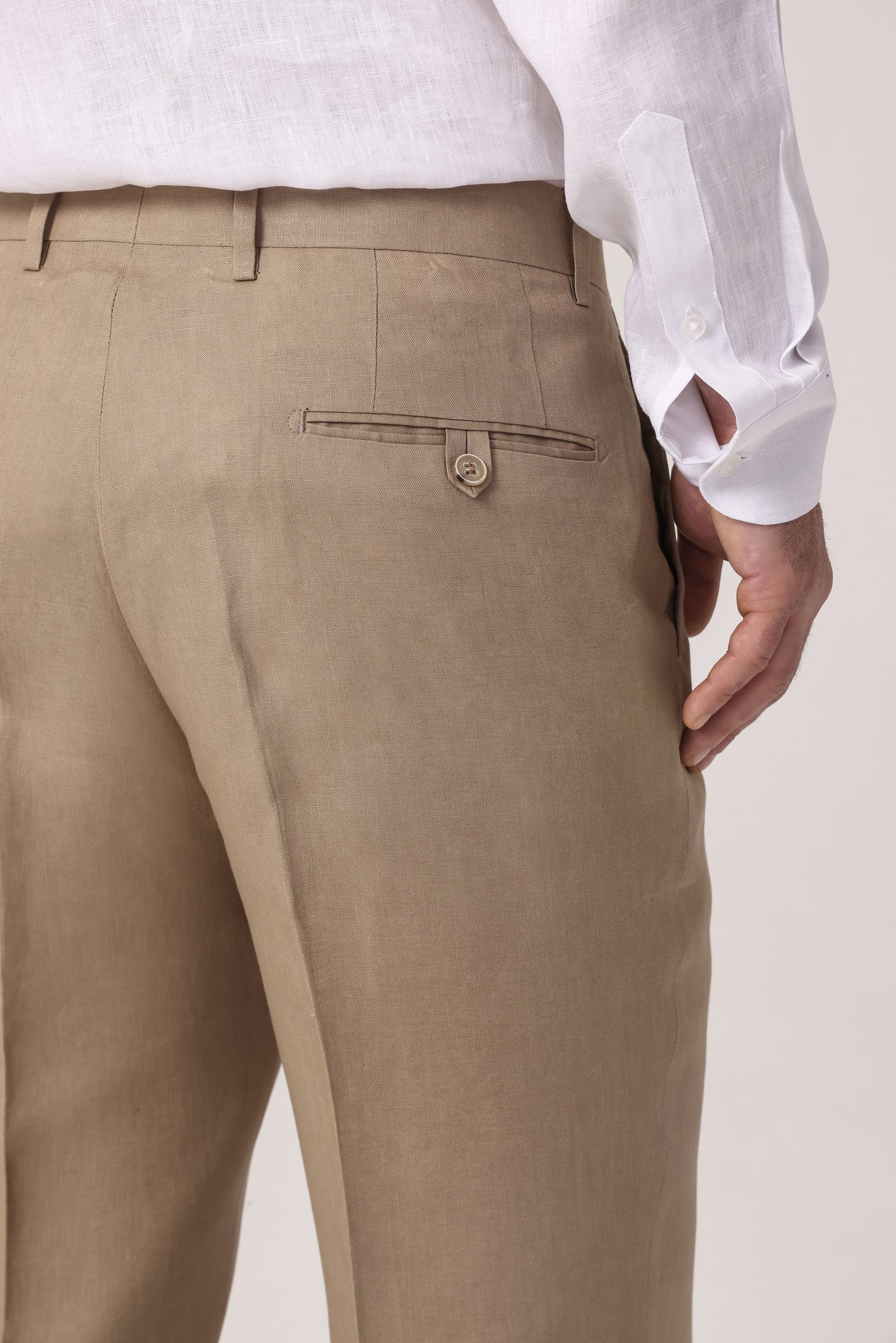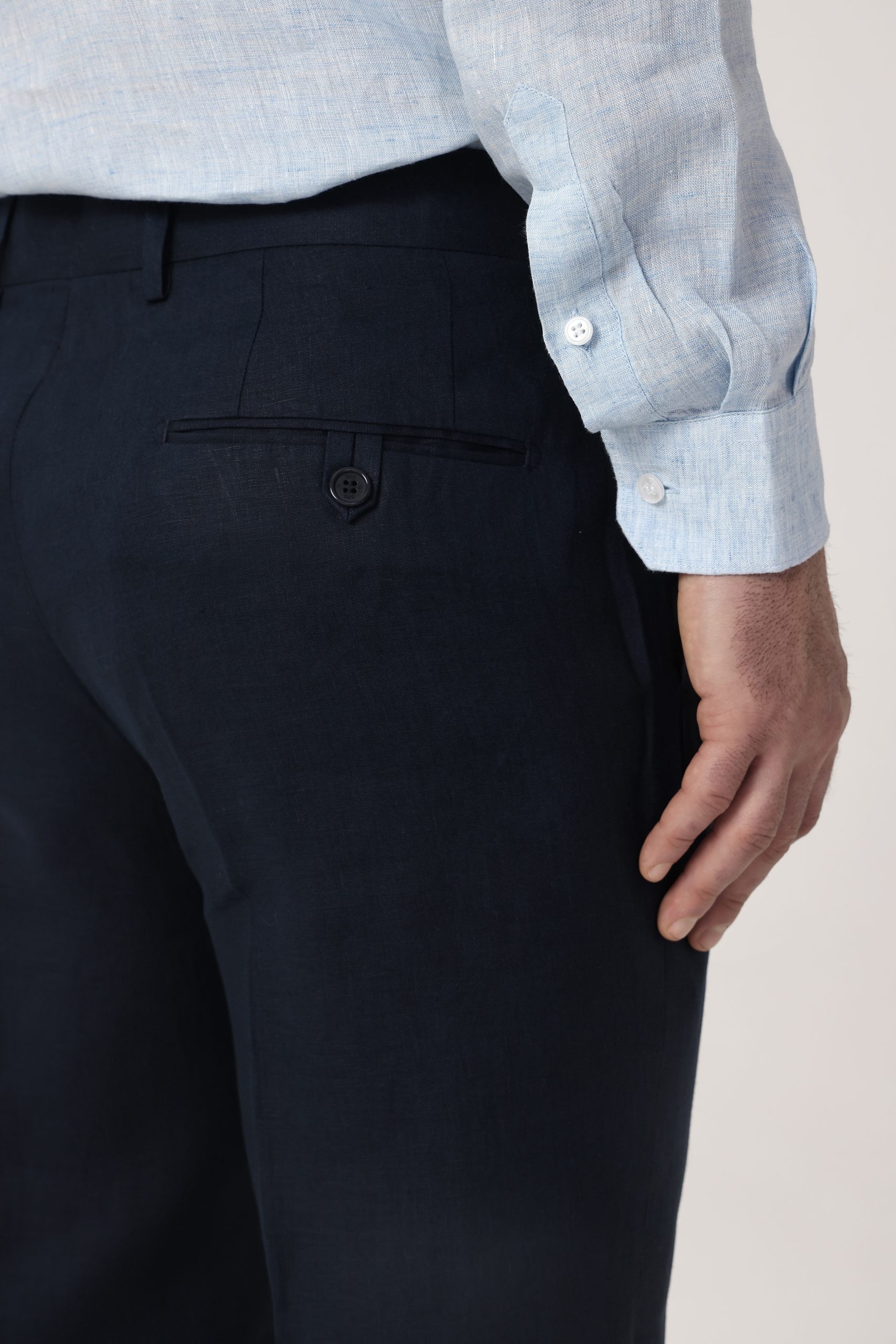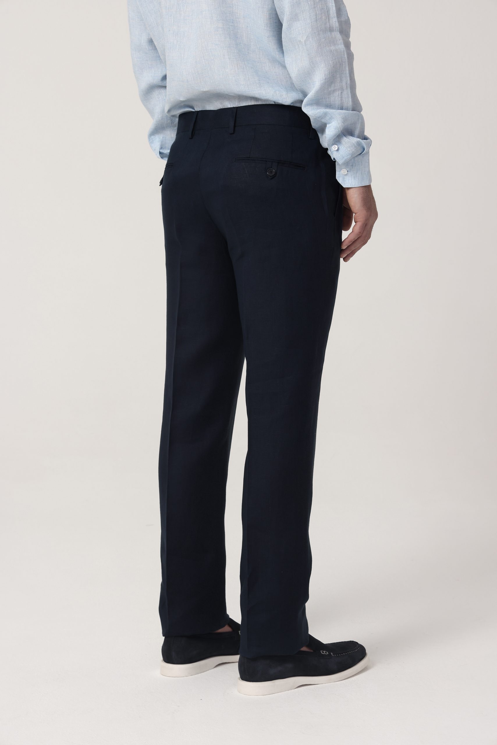 Pantalón de lino recto sin pinza. Cintura cruzada con cartera simple. Molderia regular