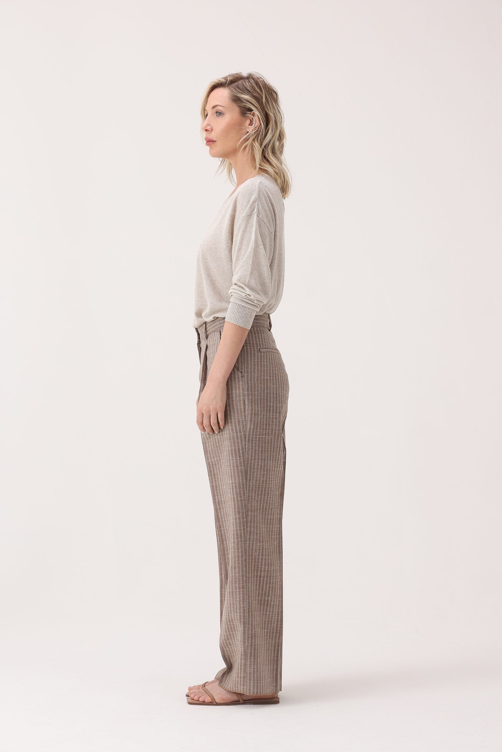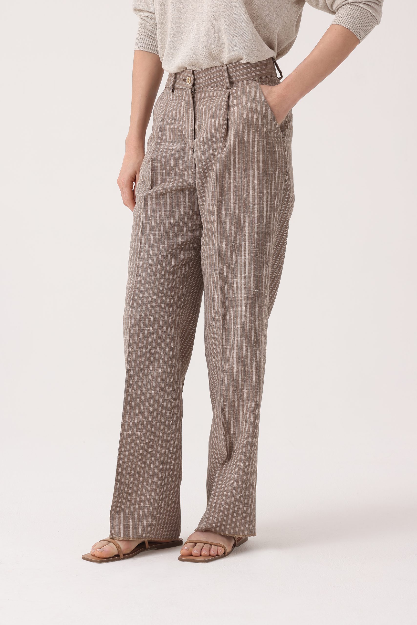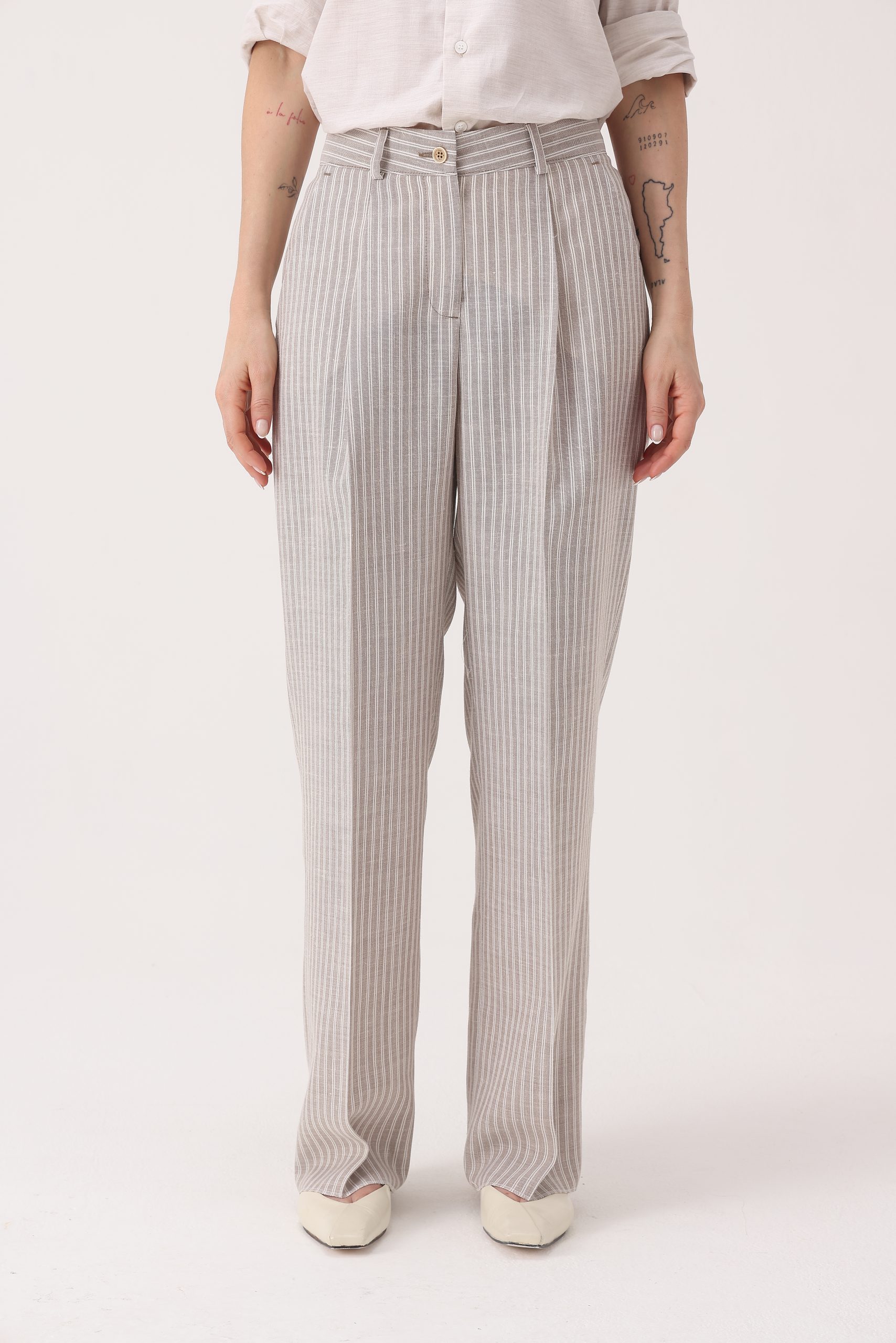 Pantalón rayado de algodón. Cintura recta con pinzas y cartera simple con cierre y botón. Molderia regular.