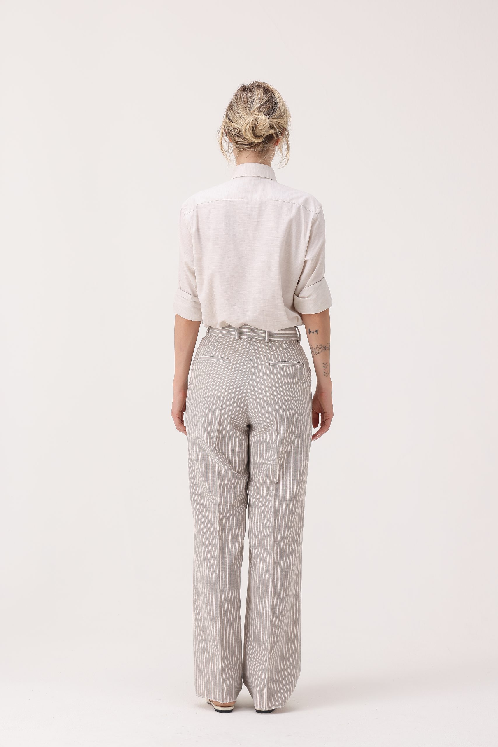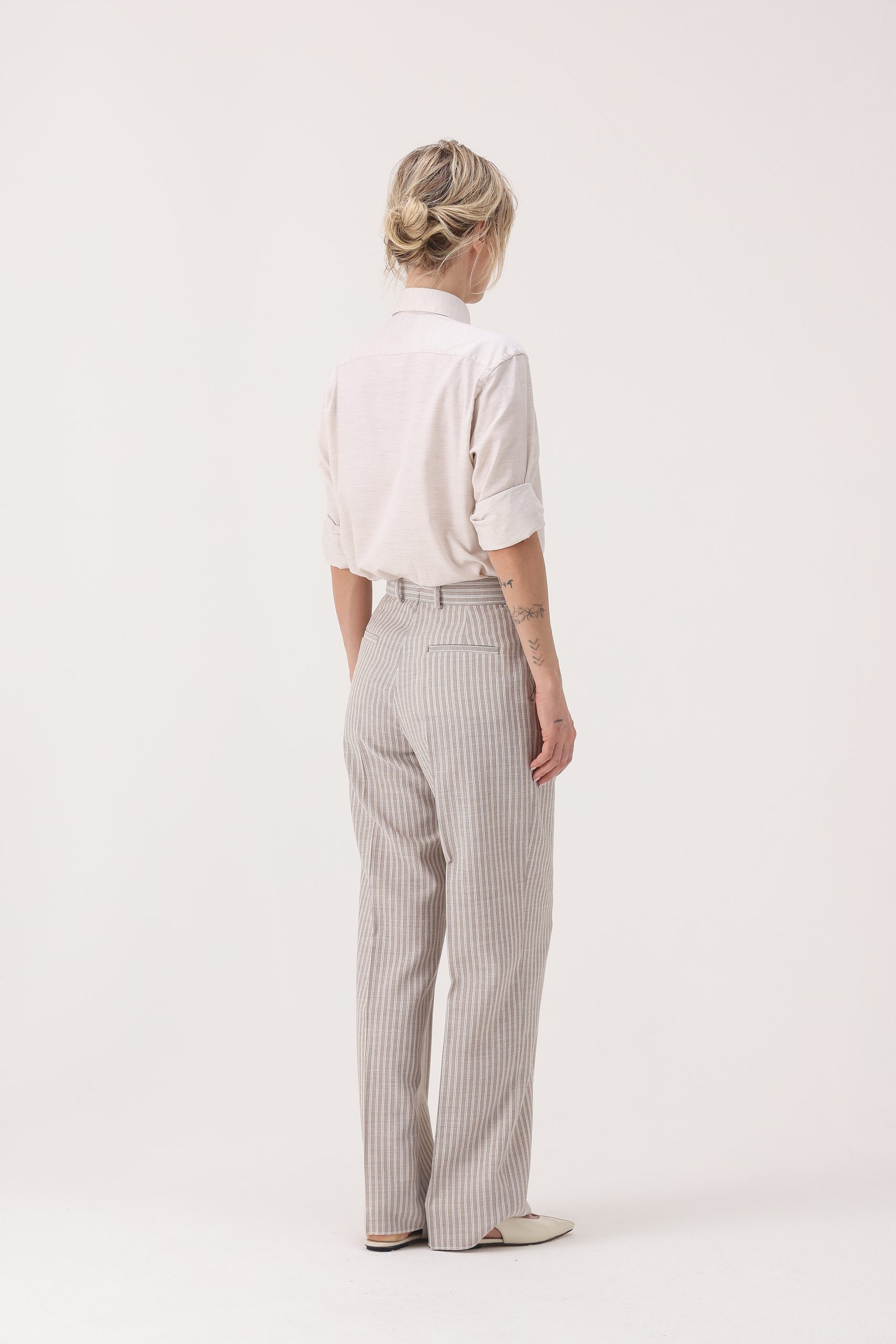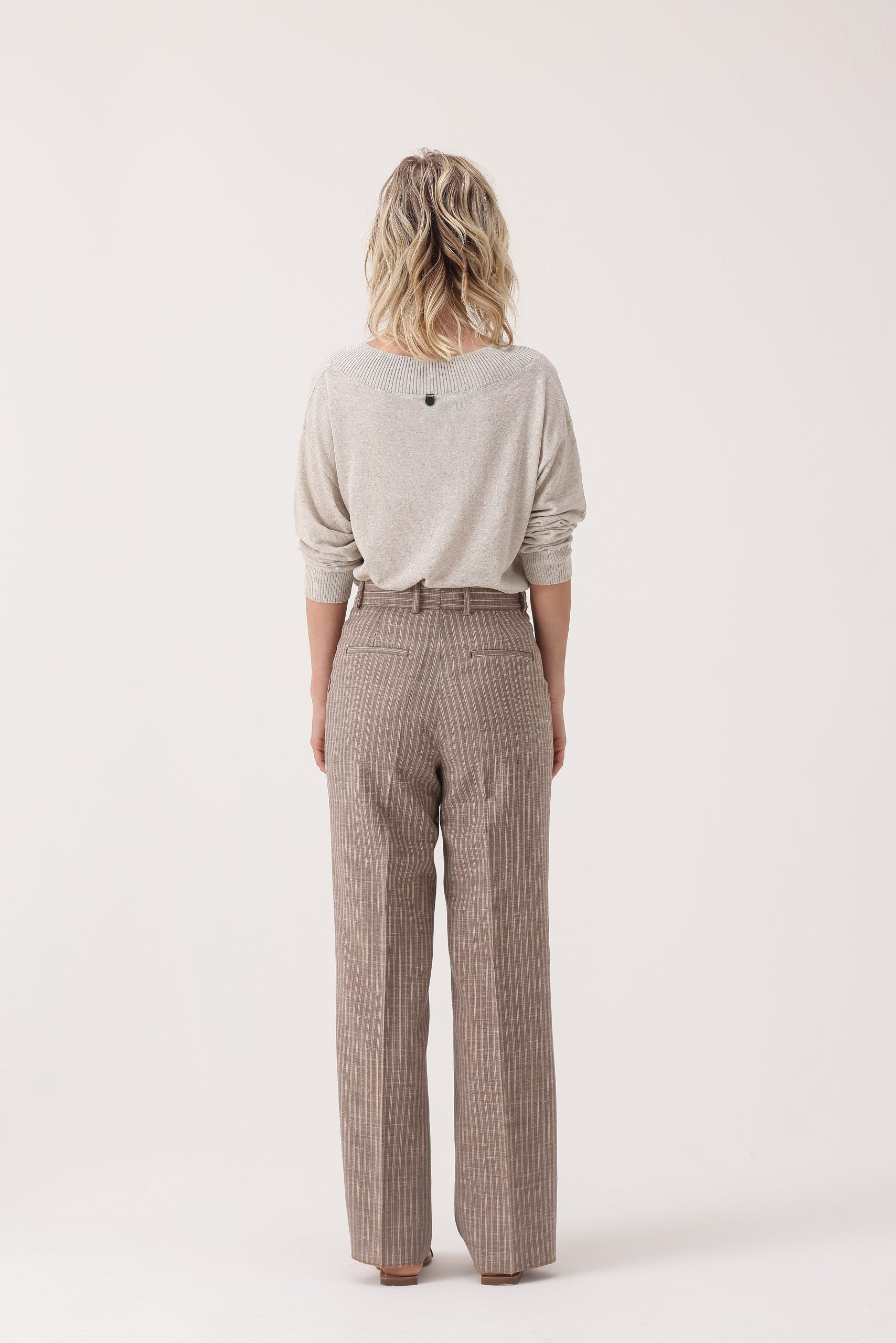 Pantalón rayado de algodón. Cintura recta con pinzas y cartera simple con cierre y botón. Molderia regular.
