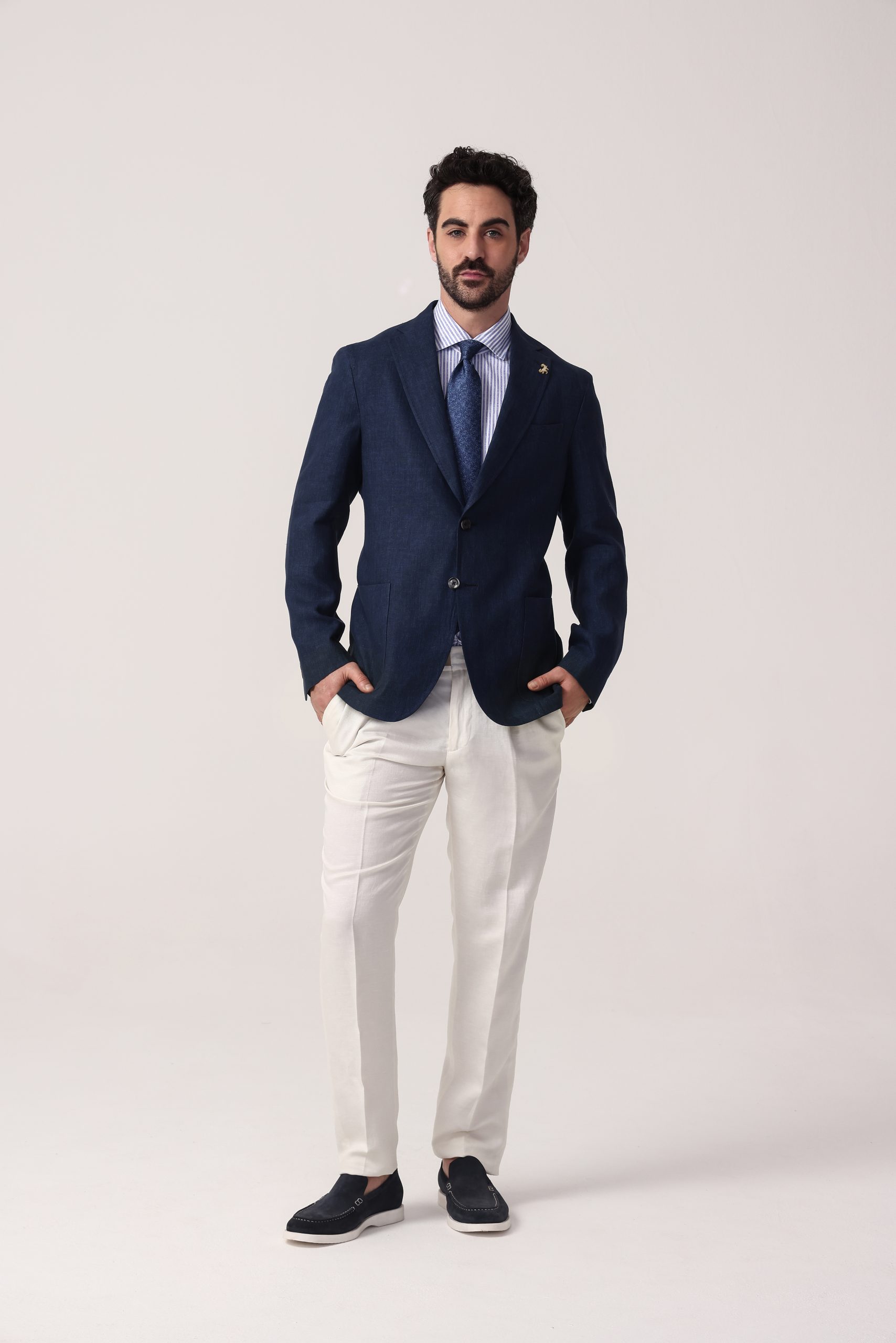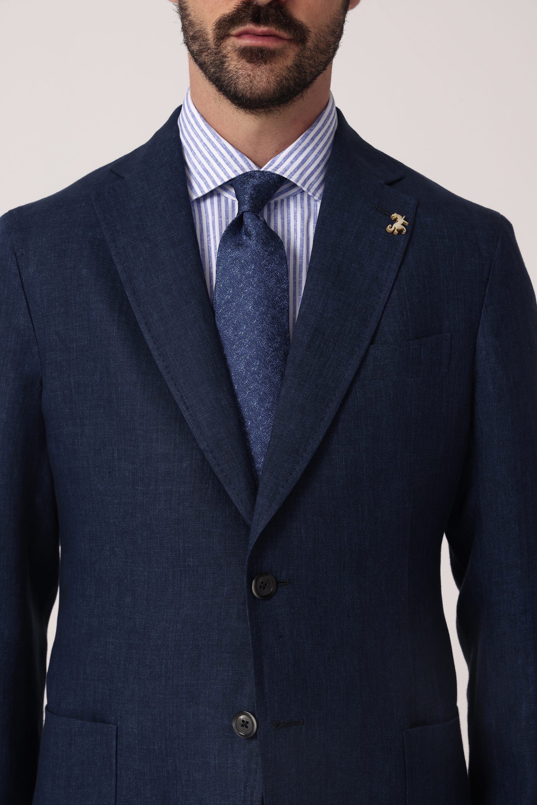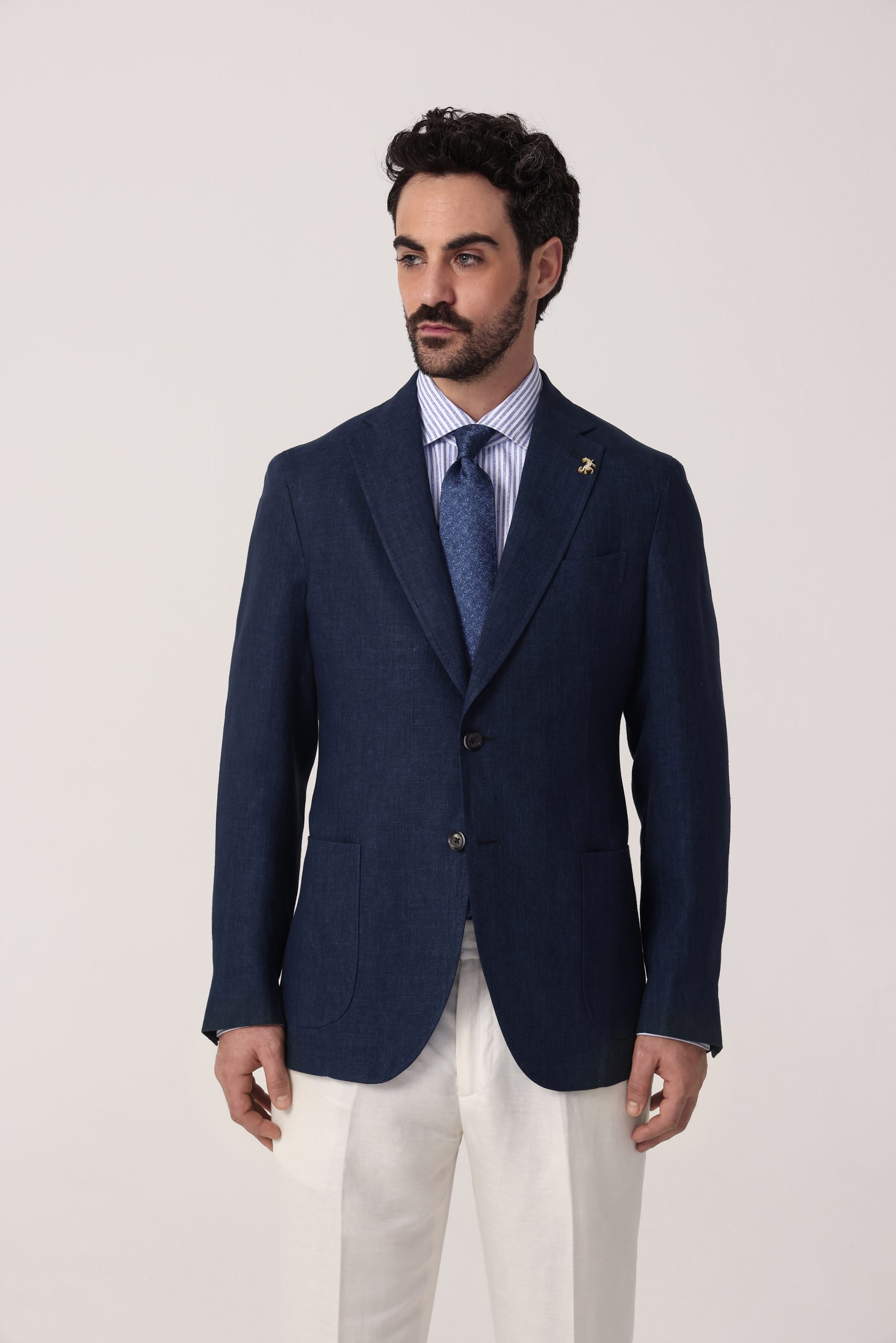 Saco de lino Tombolini. Recto con dos botones. Solapa angosta. Interior sin forro. Bolsillos plaqué. Moldería regular. Doble apertura trasera.