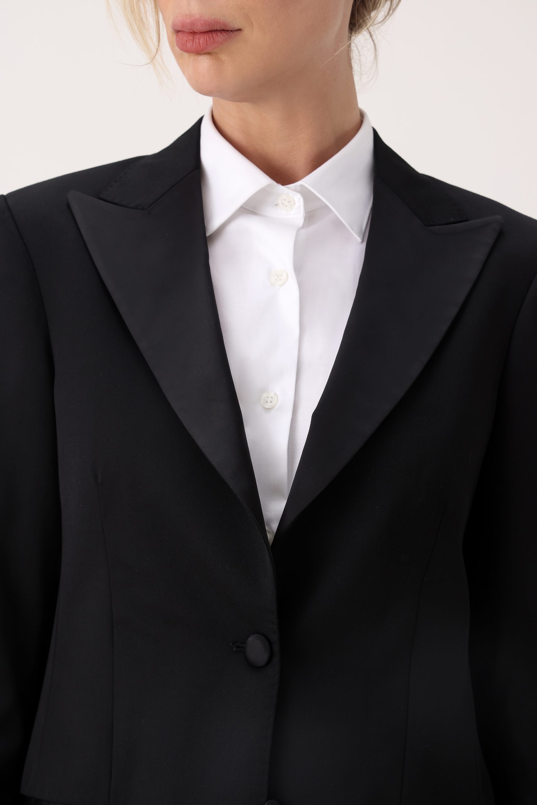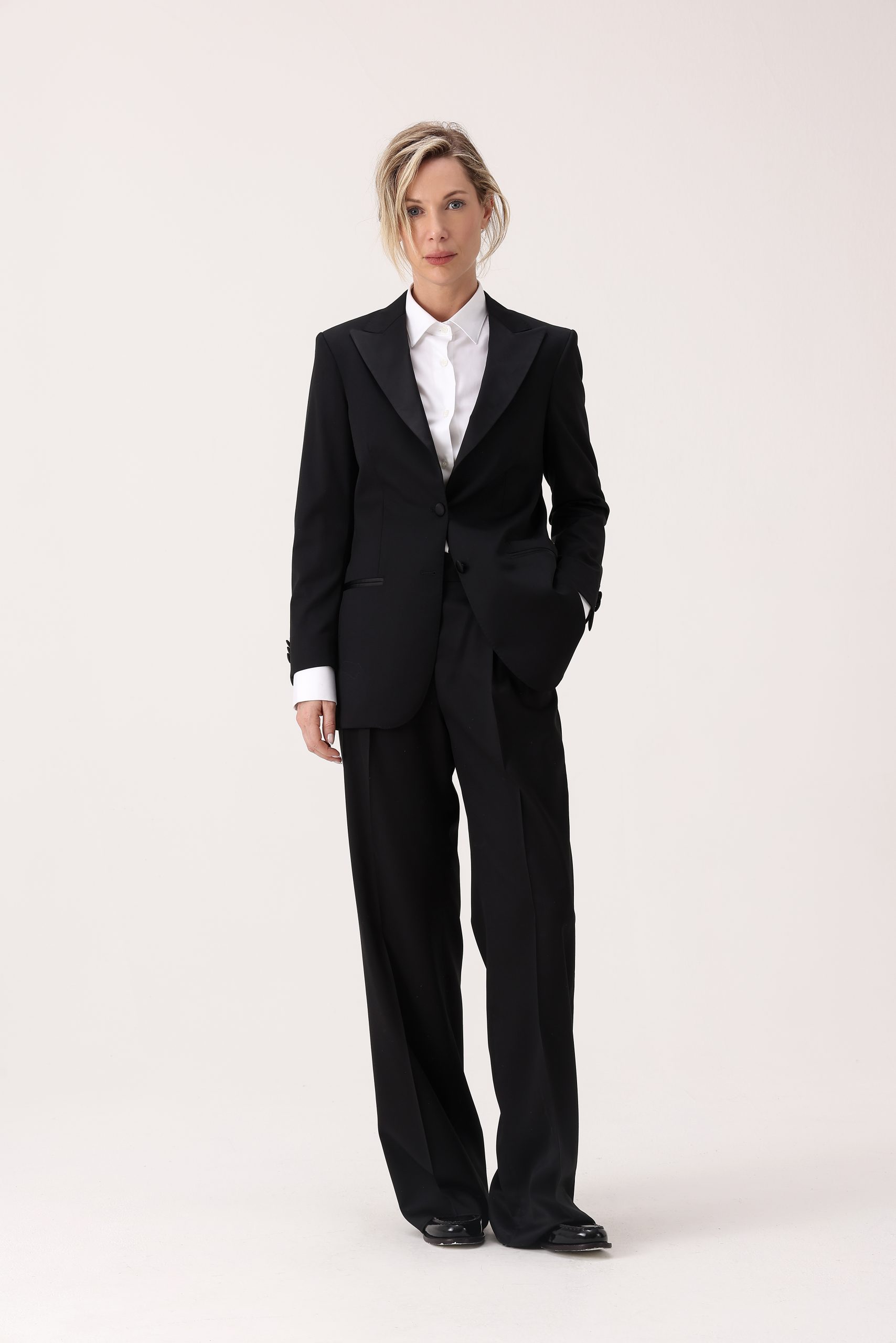 Saco smoking de dama. Solapa en punta. Moldería regular. Botones forrados. Bolsillos ojal. Interior con forro. Abertura trasera simple.
