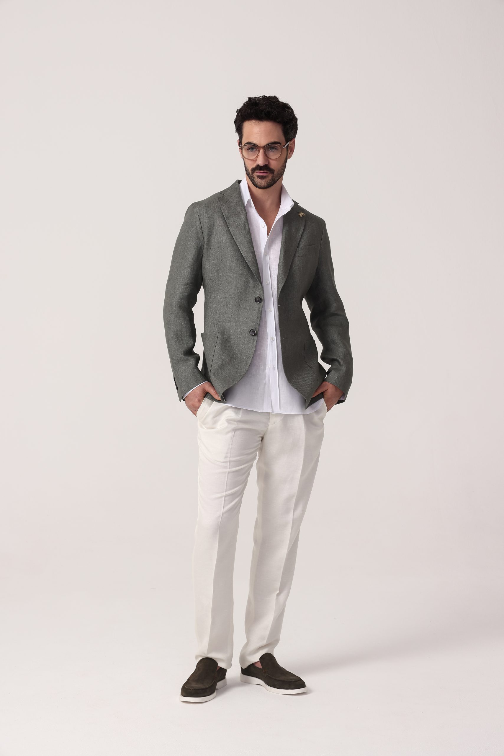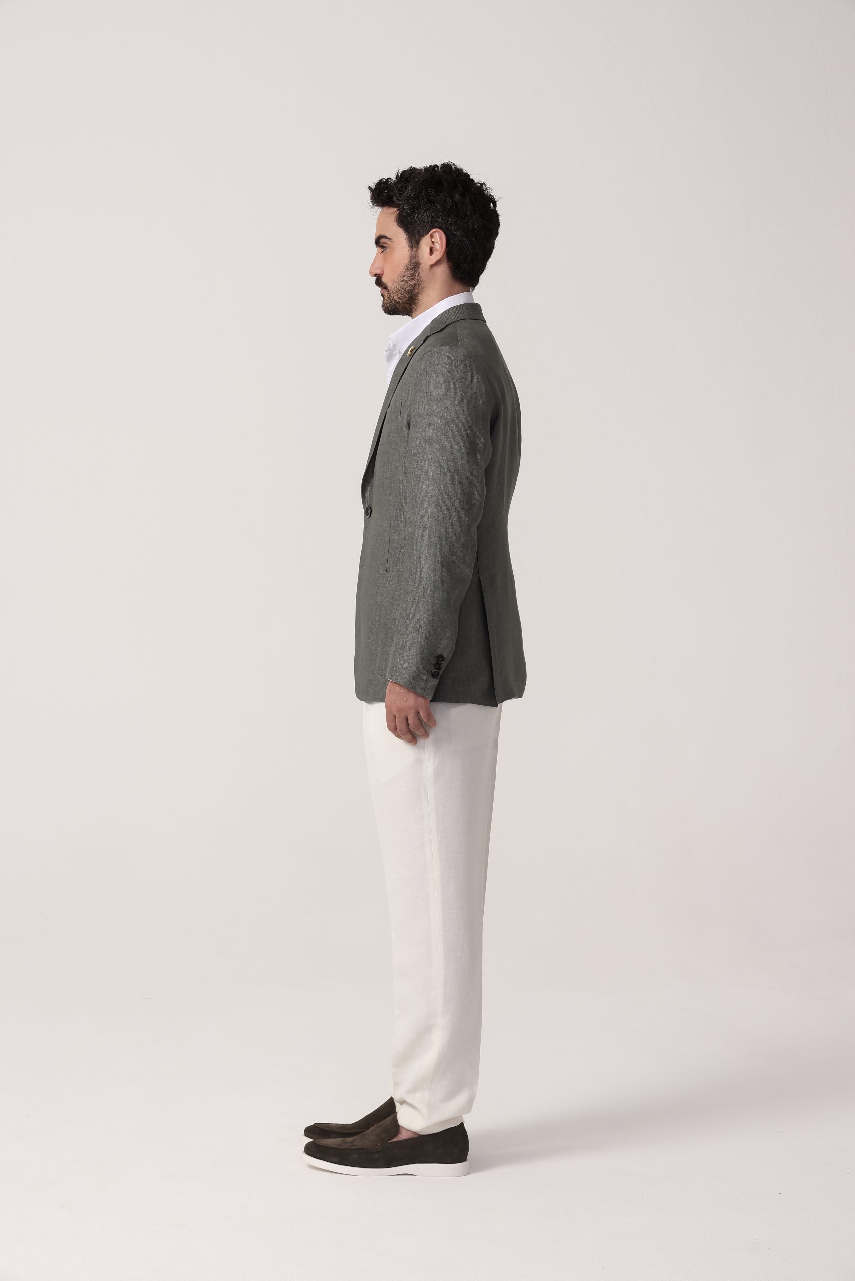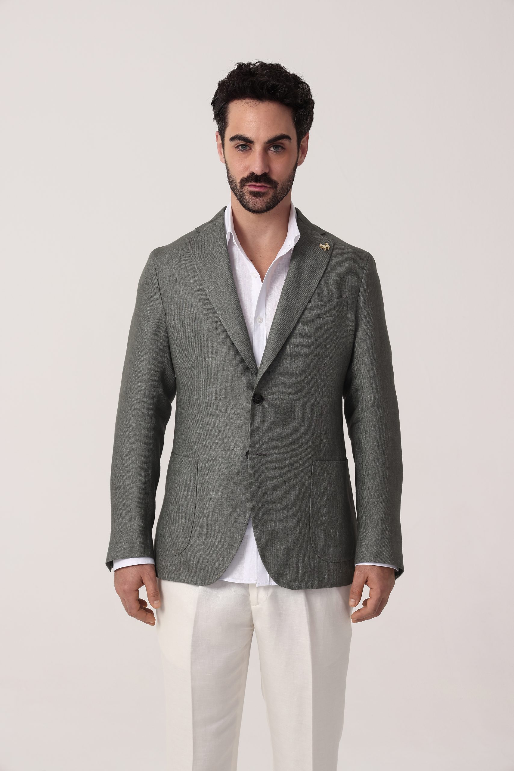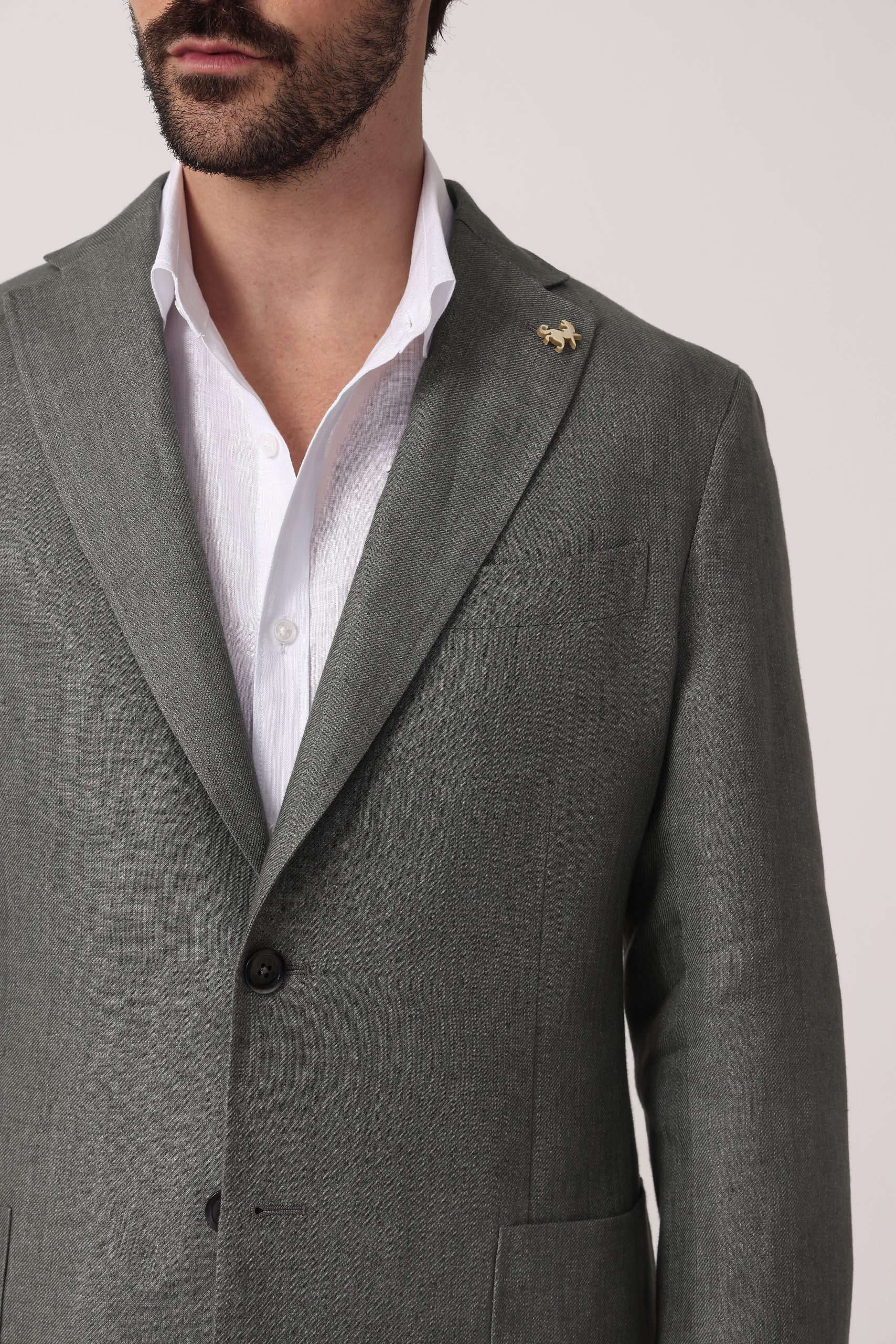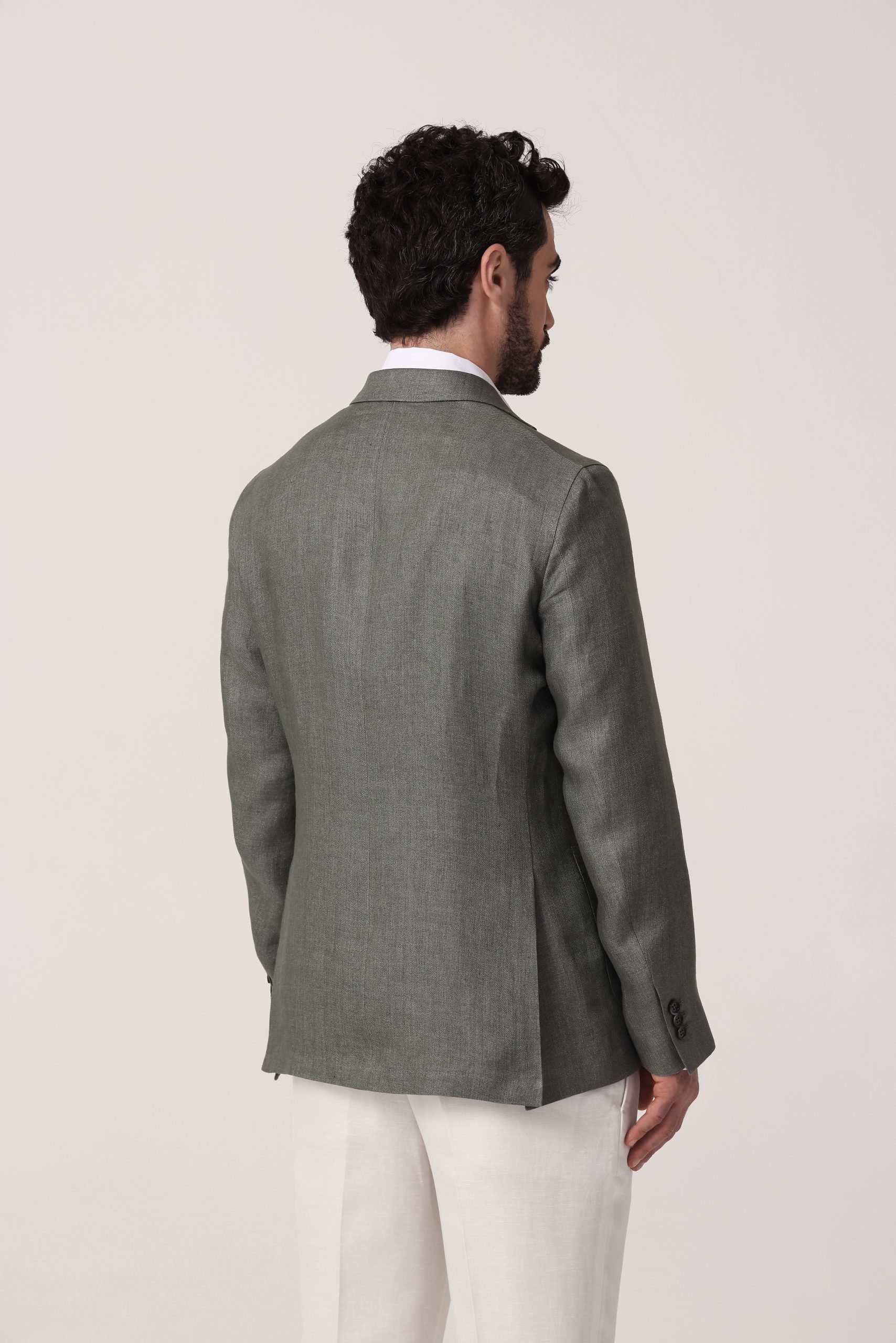 Saco de lino Tombolini. Recto con dos botones. Solapa angosta. Interior sin forro. Bolsillos plaqué. Moldería regular. Doble apertura trasera.