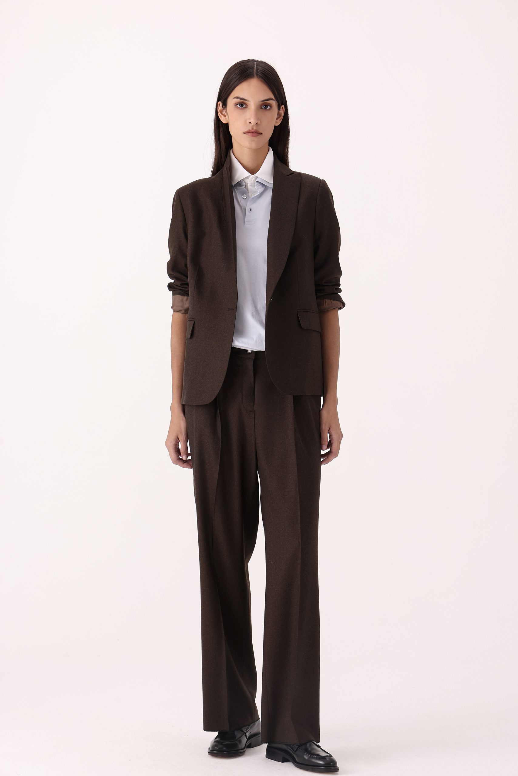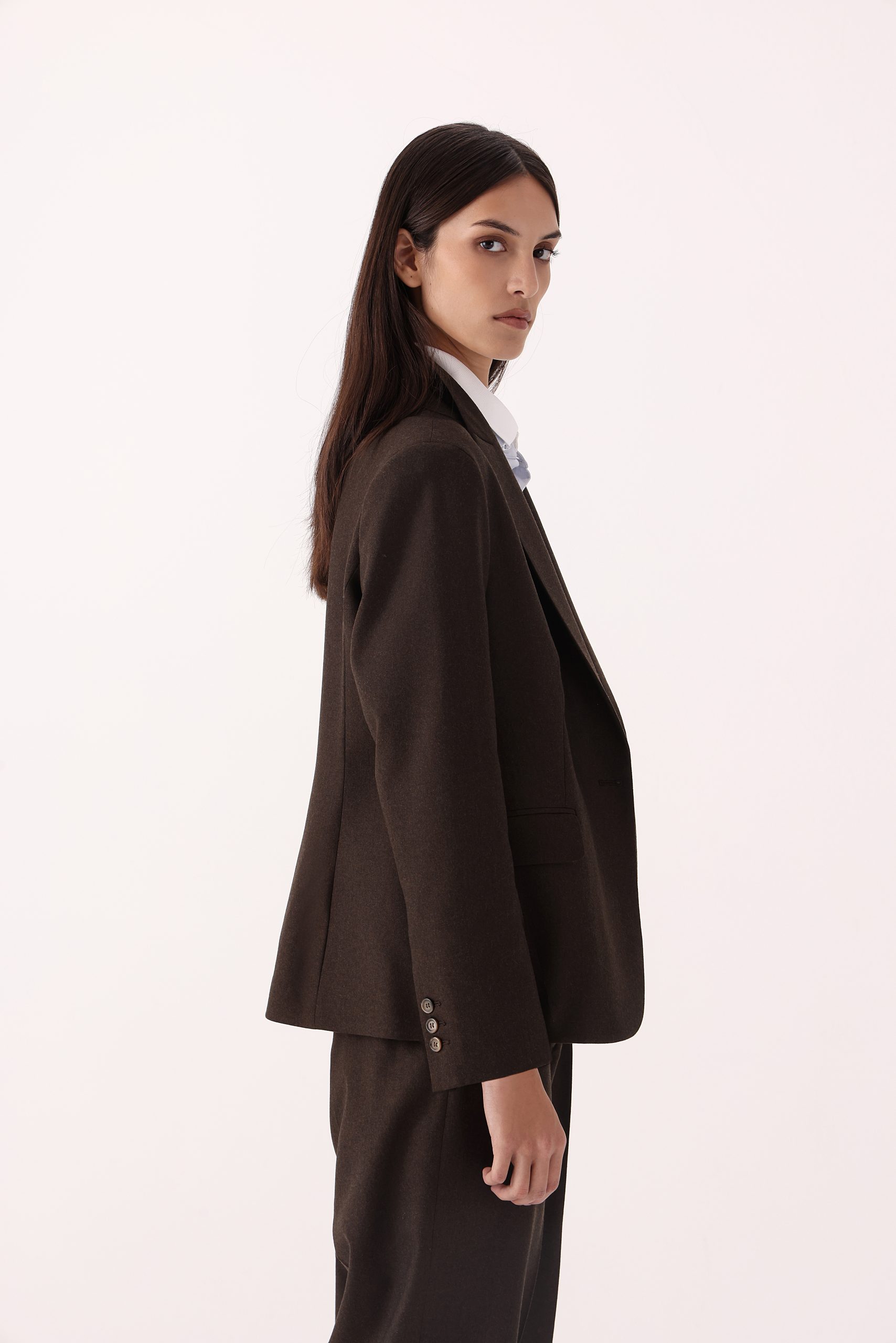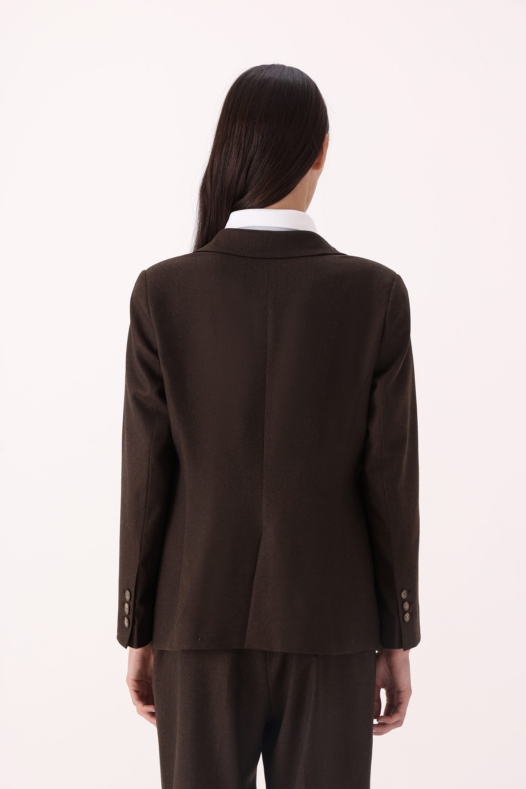 Saco liso de dama. Recto con un botón. Solapa angosta. Interior con forro. Bolsillos con tapa. Abertura trasera simple. Moldería regular.