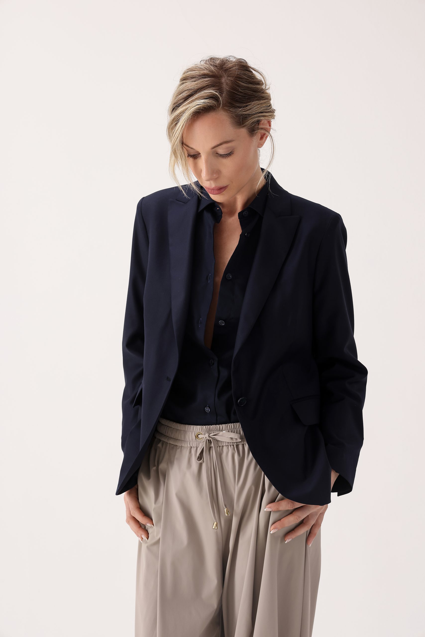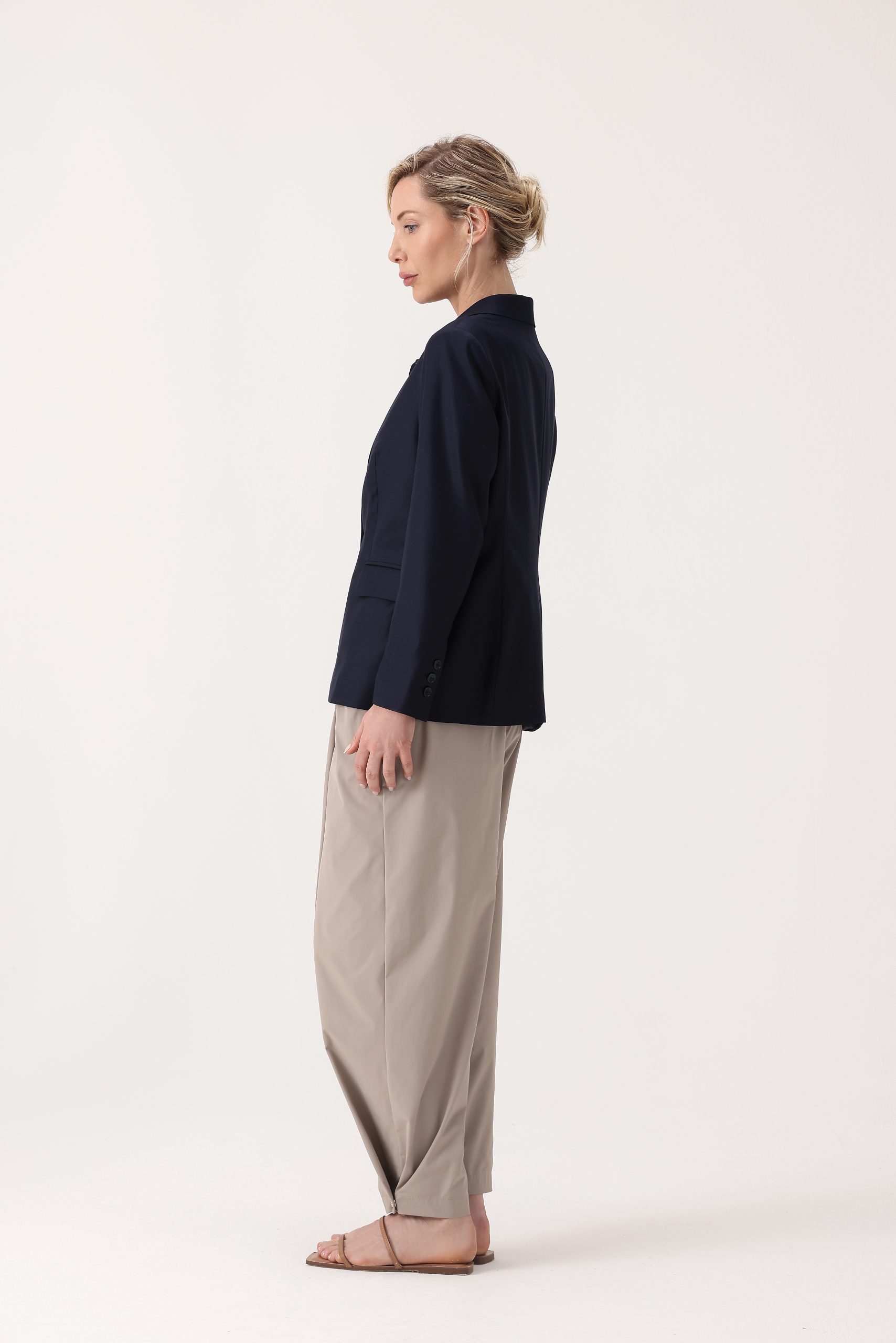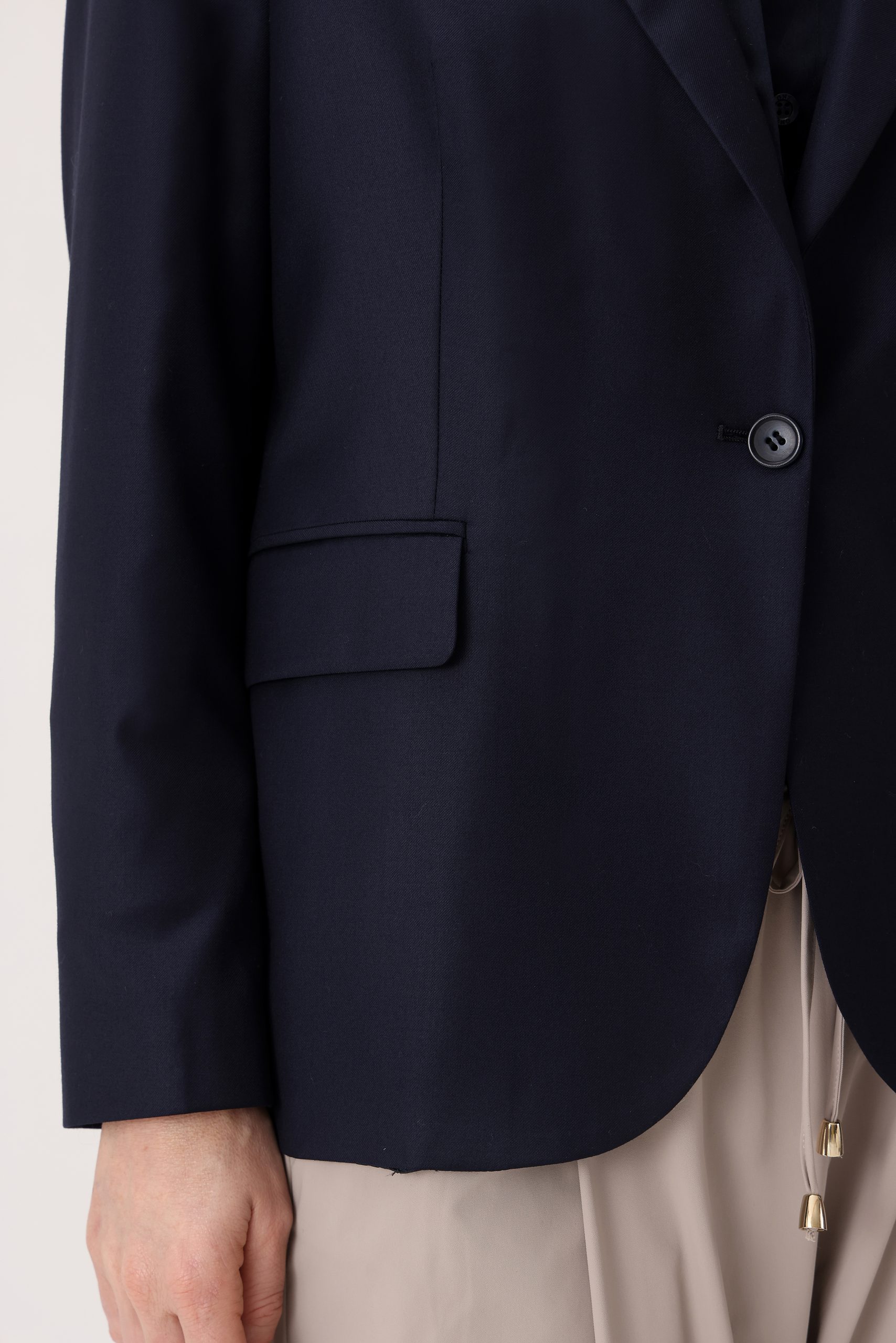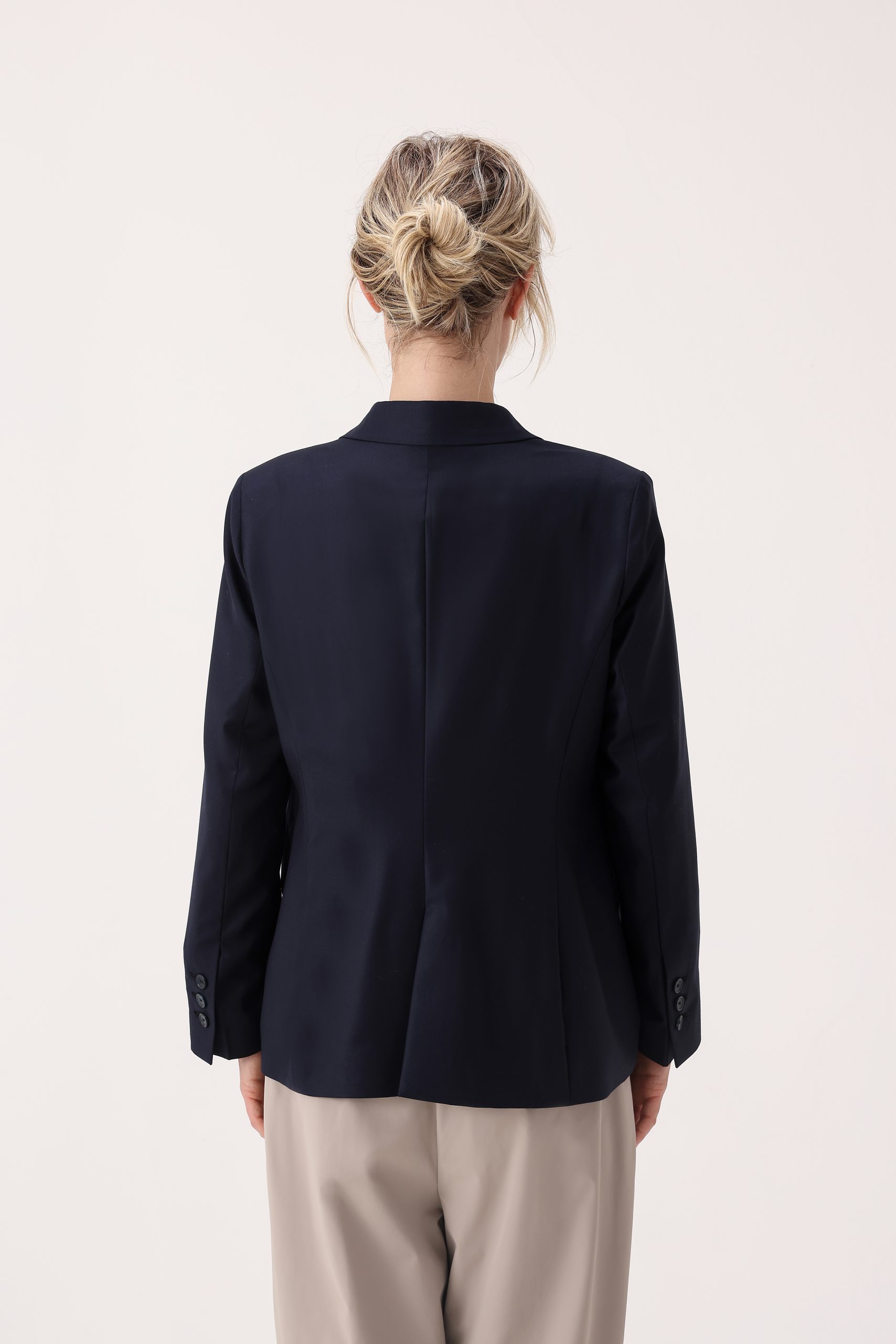 Saco liso de dama. Saco recto de dos botones. Solapa angosta. Interior con forrado. Bolsillos con tapa. Doble abertura trasera.