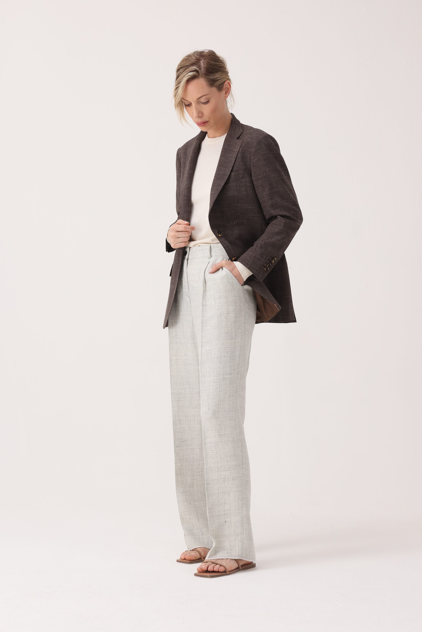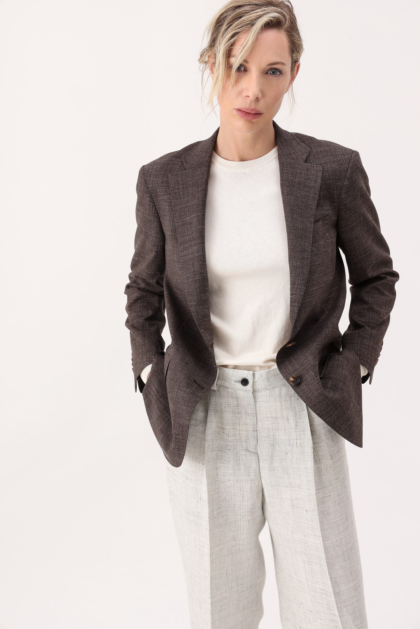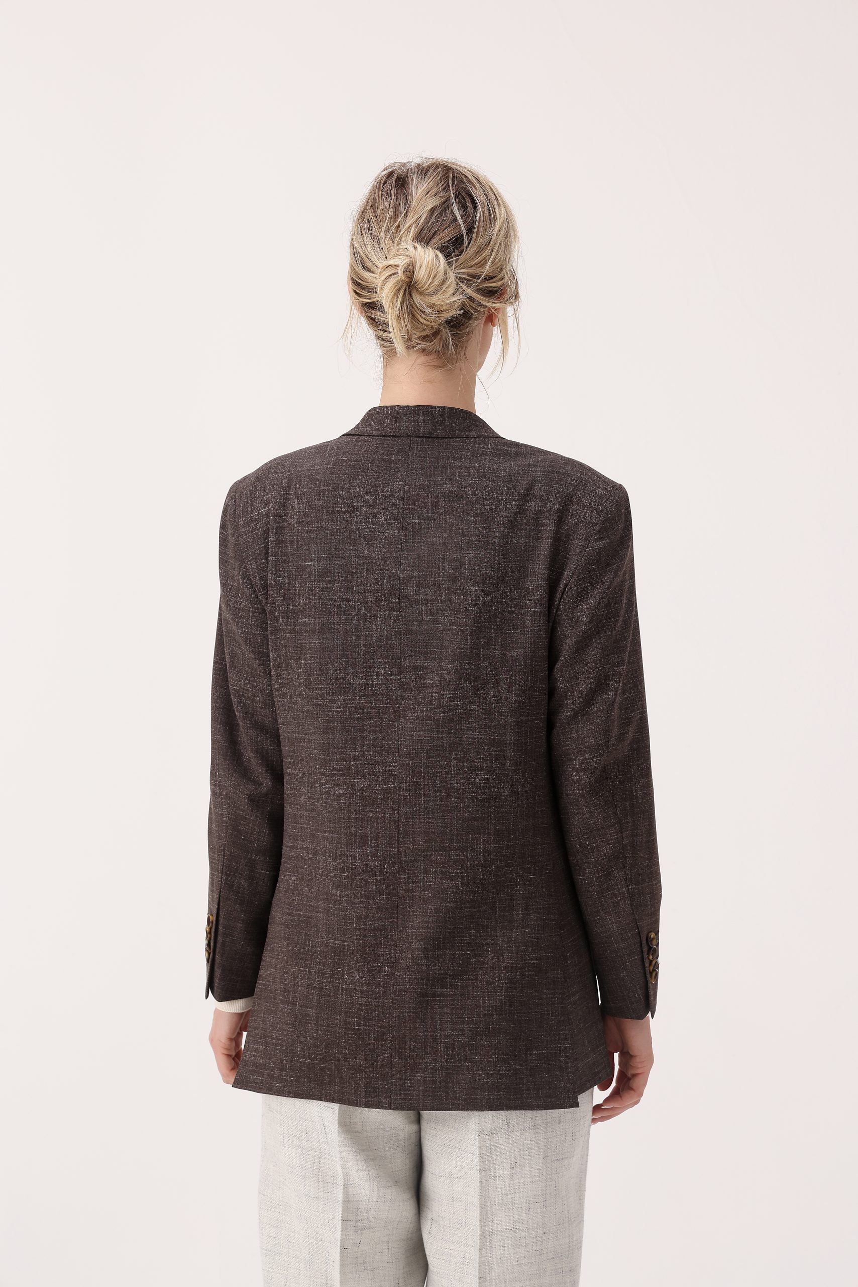 Saco liso de dama, recto con dos botones. Solapa angosta. Interior forrado. Bolsillos con tapa. Doble abertura trasera.