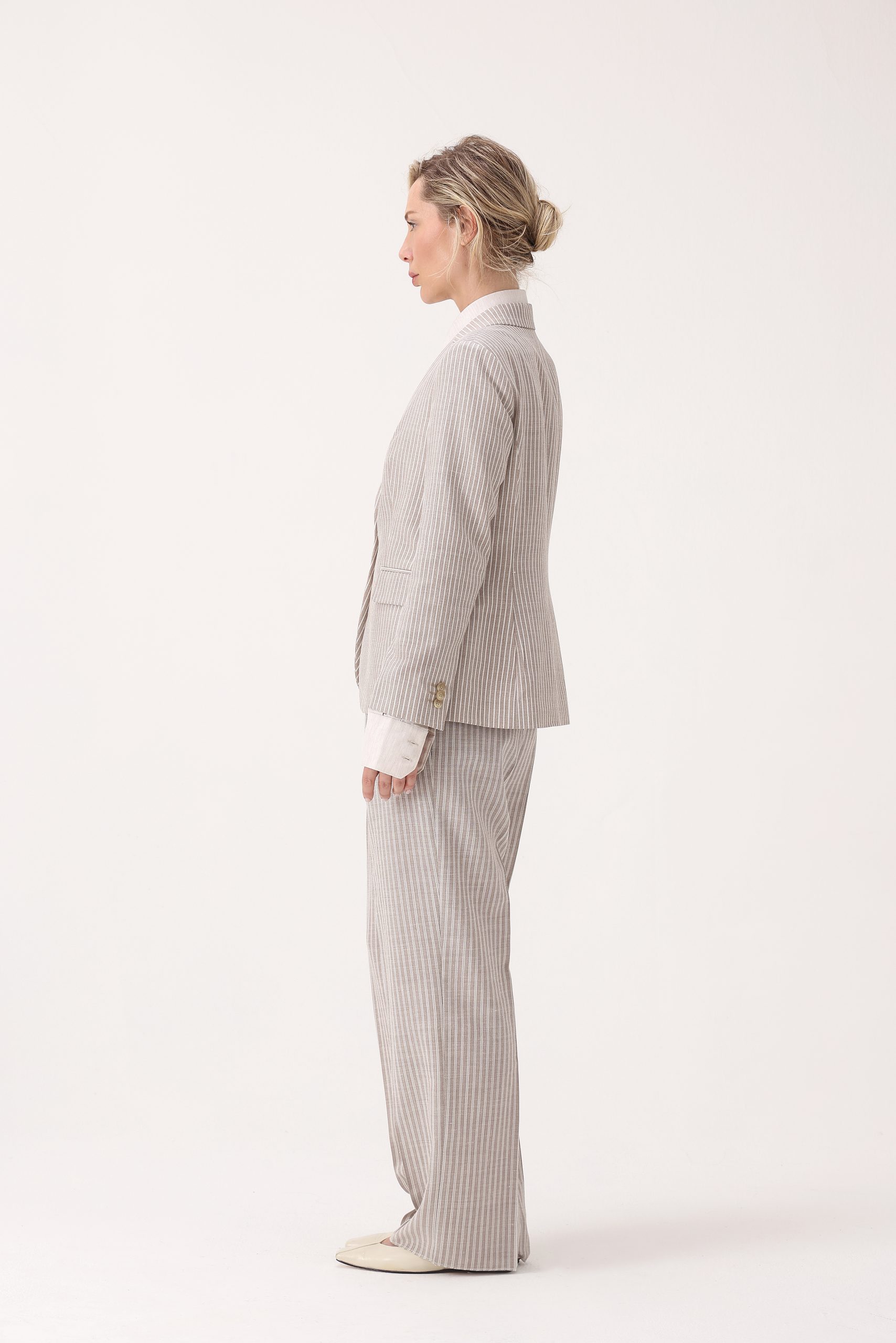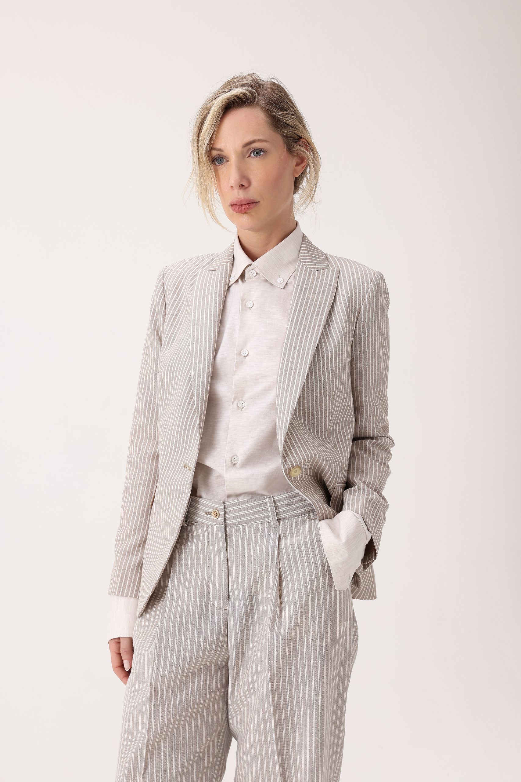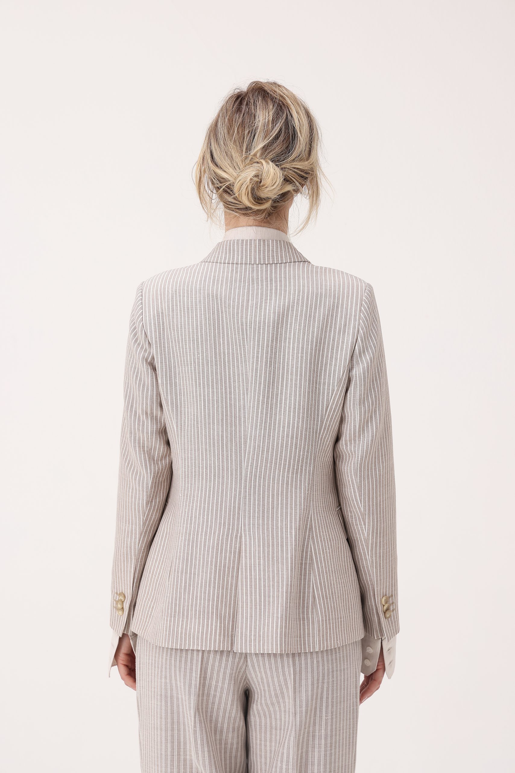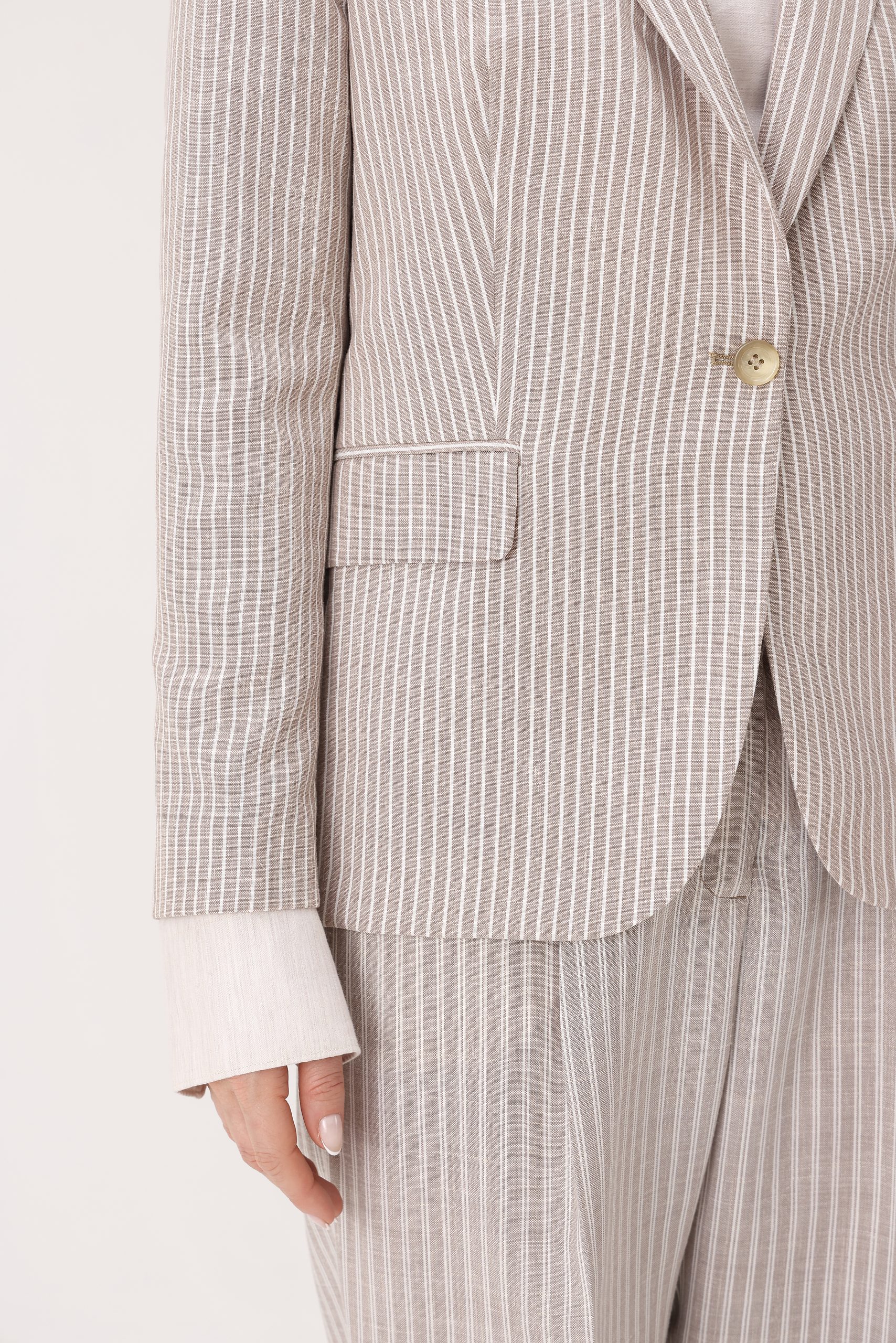 Saco de dama rayado recto con un botón. Solapa angosta. Bolsillos con tapa. Interior con forro. Doble abertura trasera. Composición 70% poliamida 30% lino