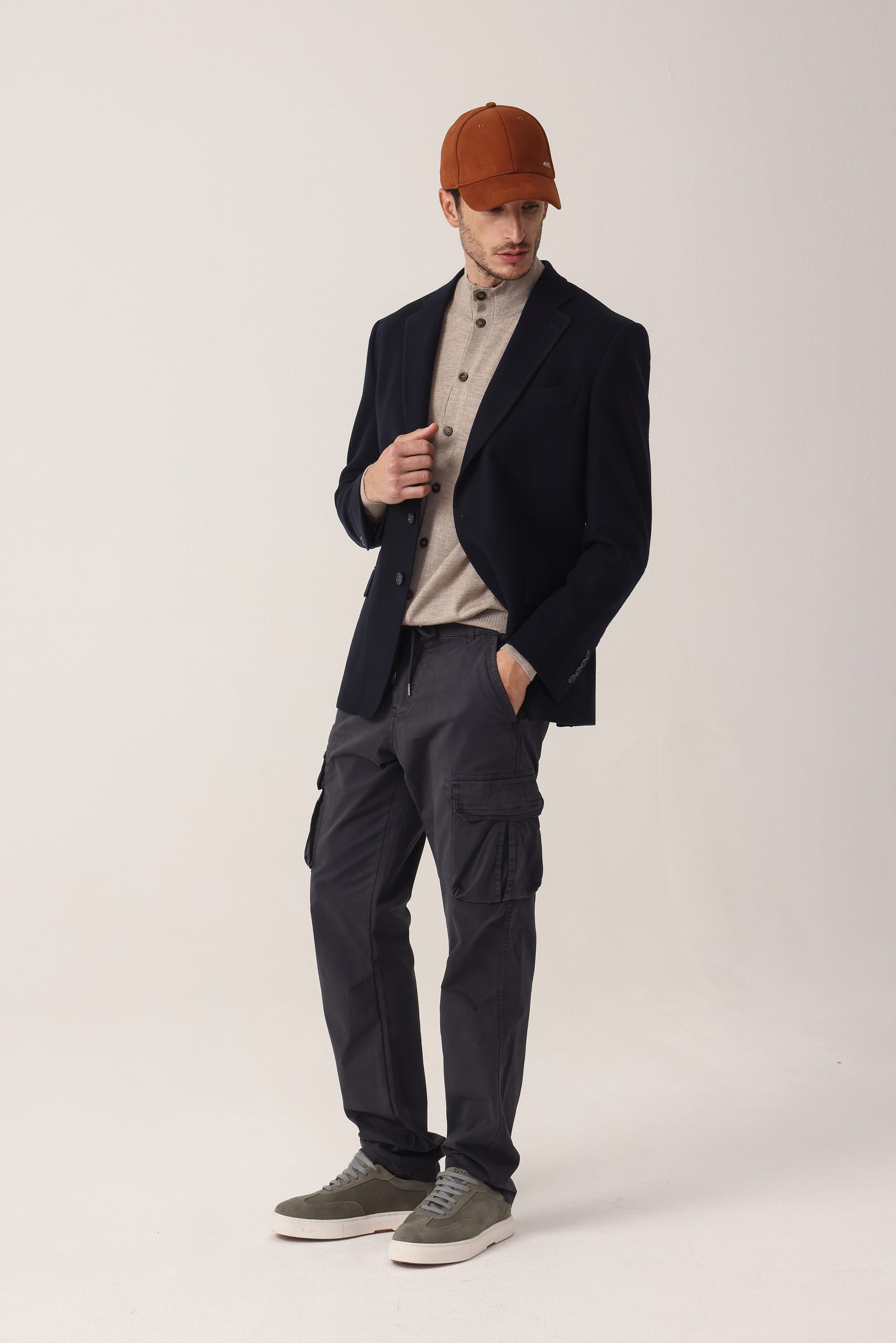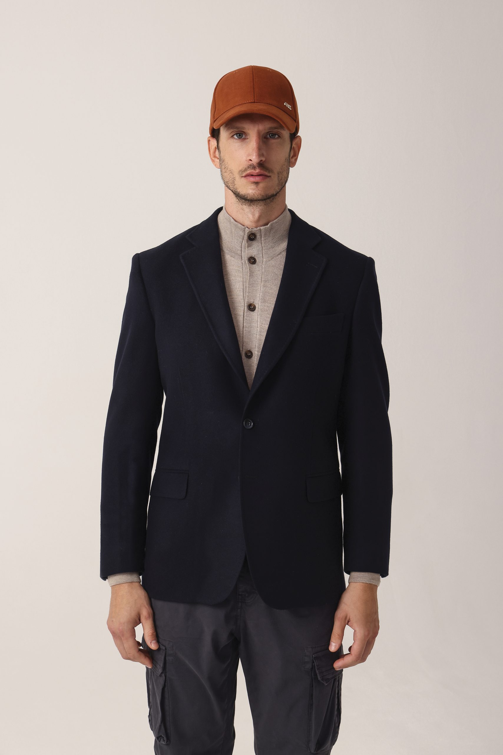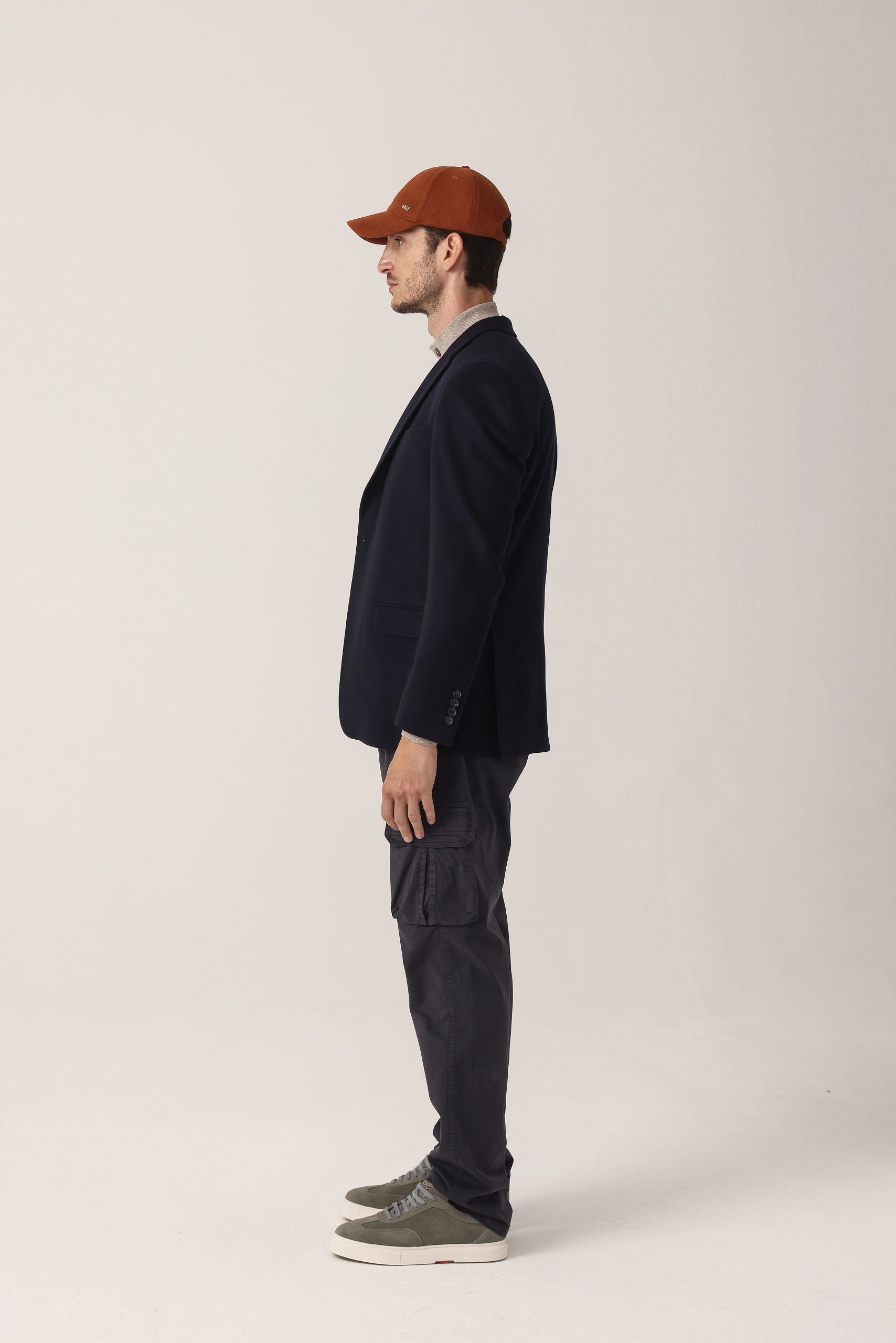 Saco liso recto. Solapa angosta. Frente con dos botones. Bolsillos con tapa. Interior forrado. Doble abertura trasera. Moldería regular.