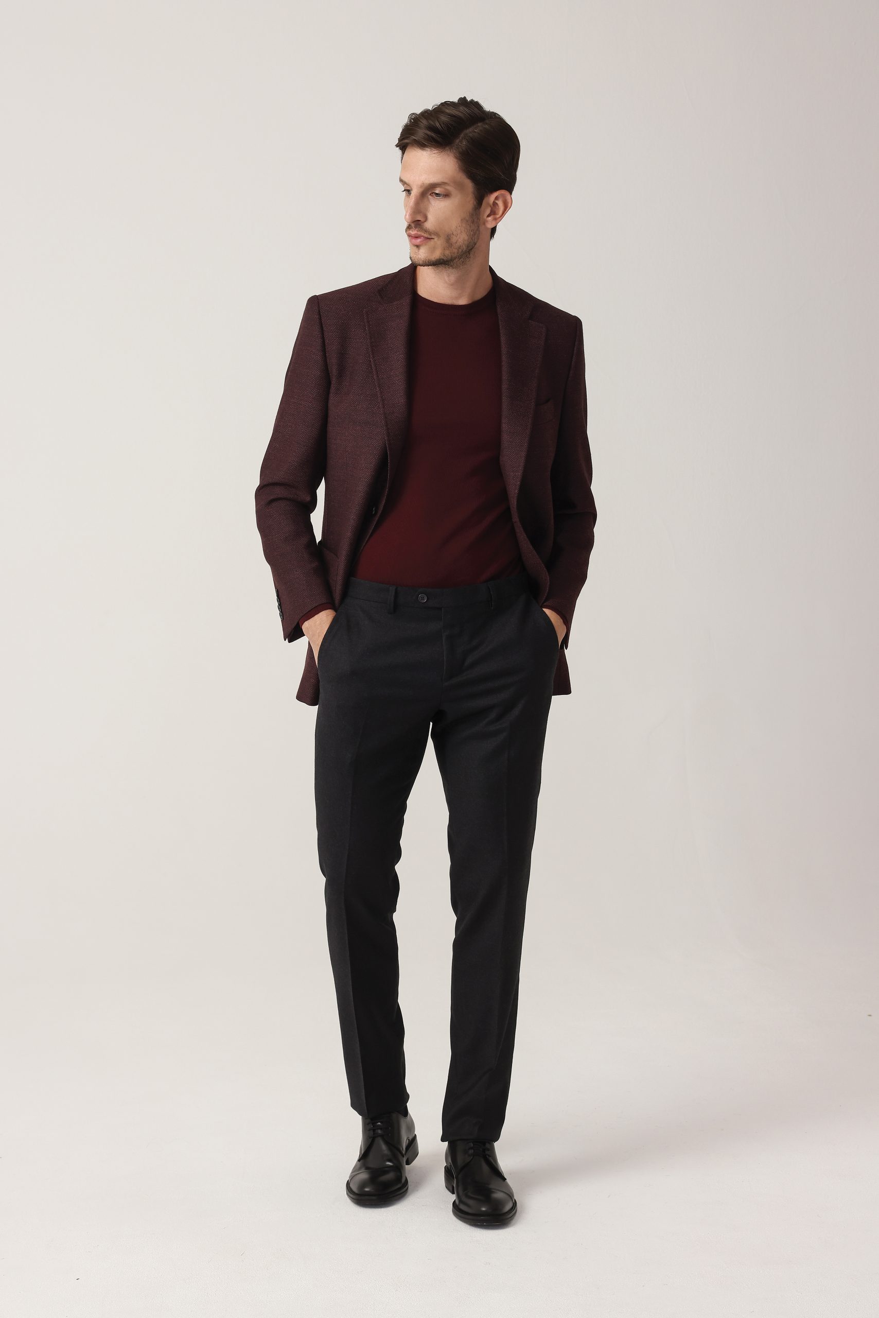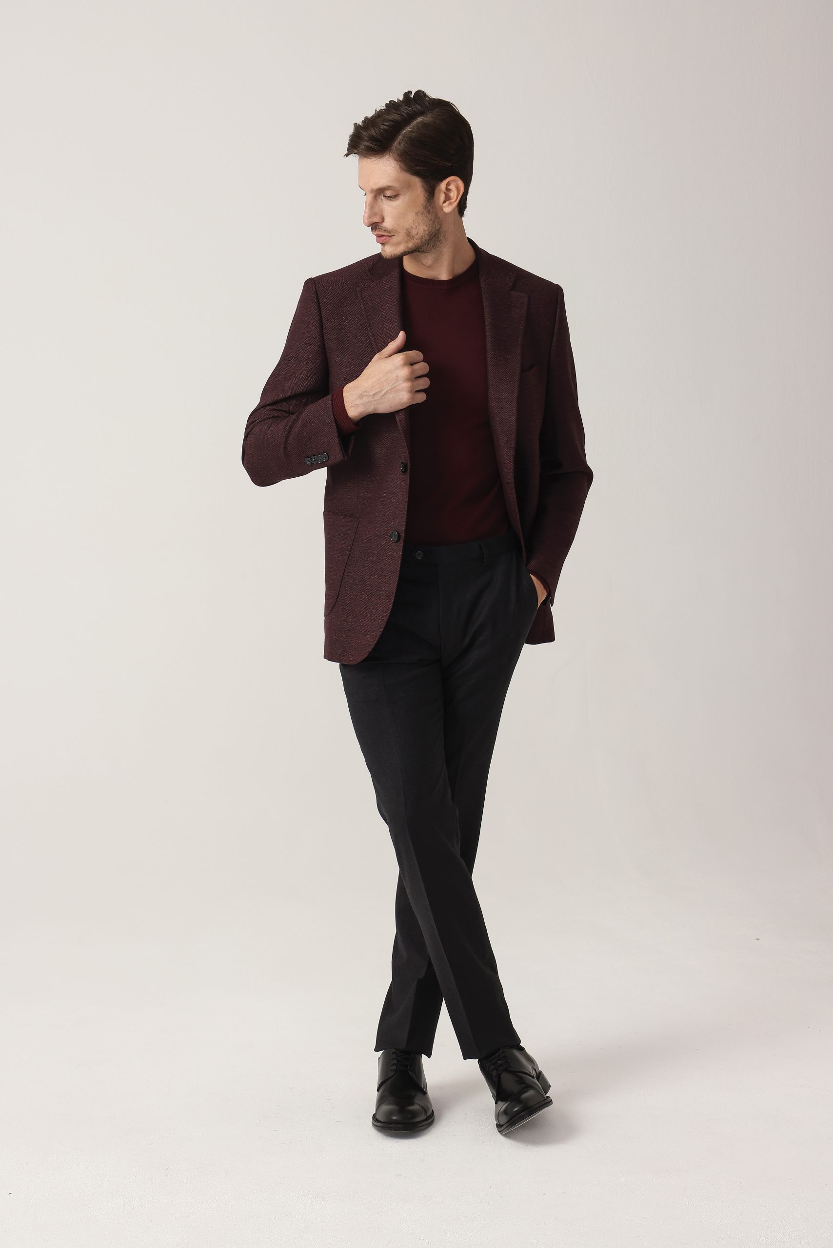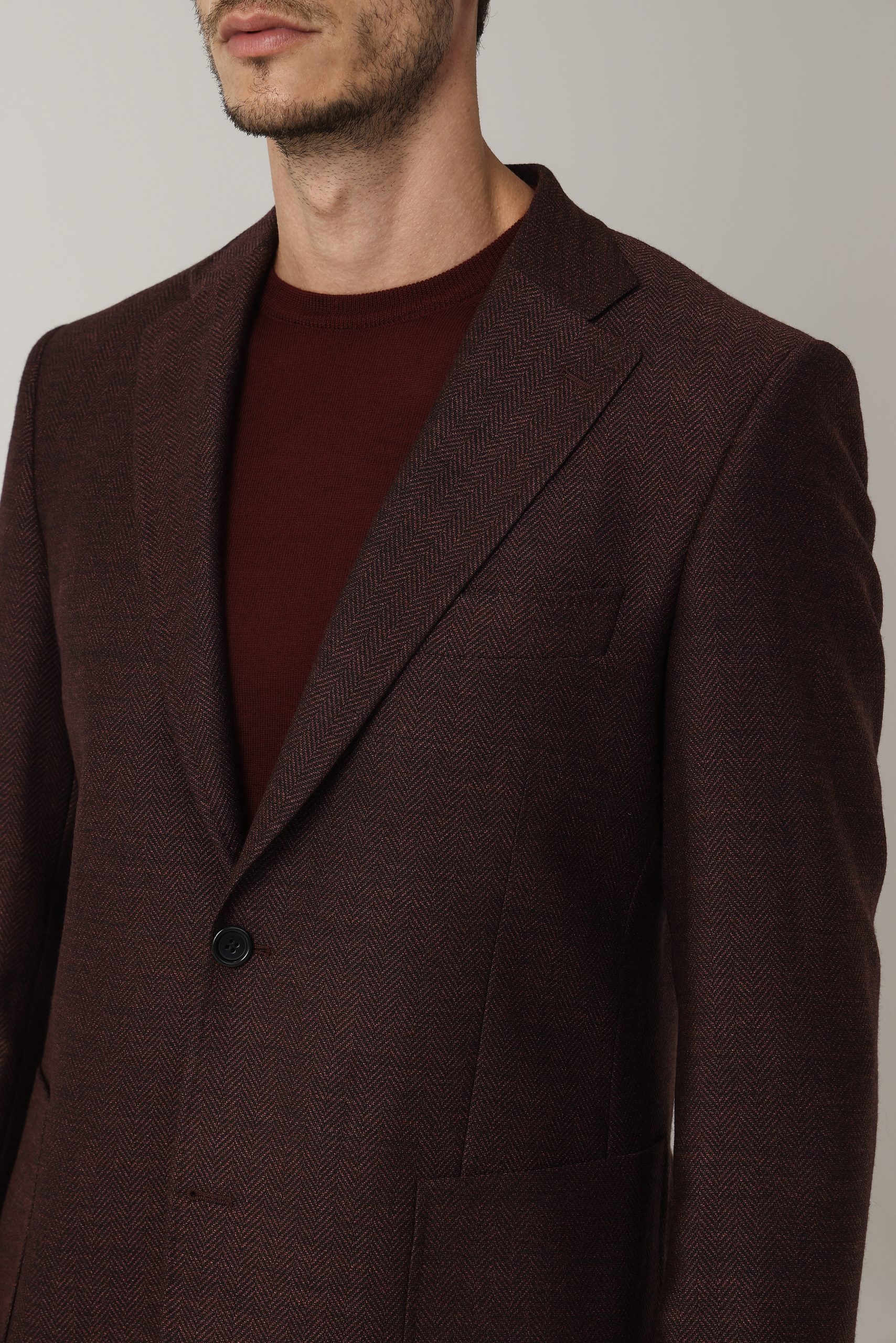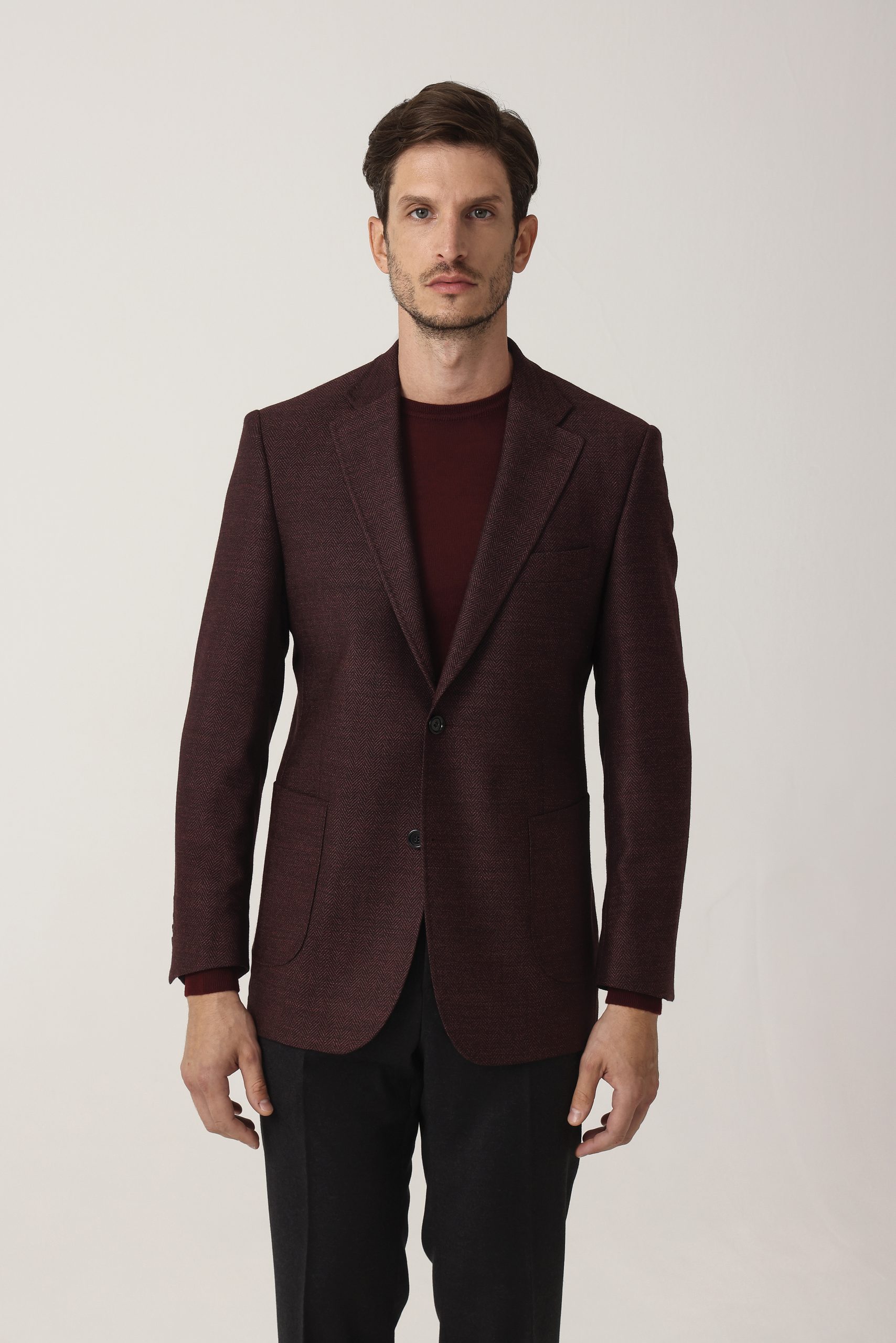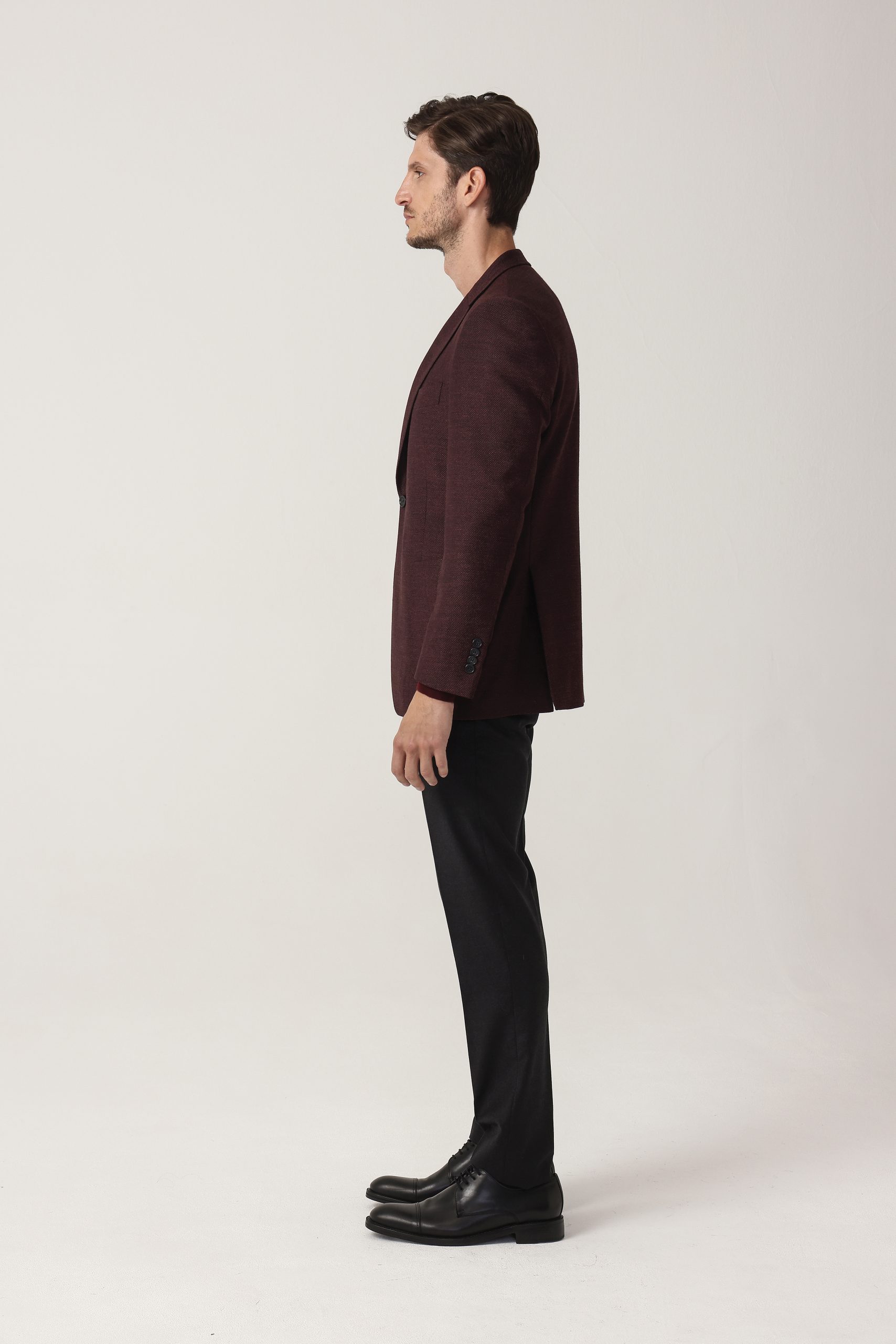 Saco espigado recto de dos botones. Solapa angosta. Forro interno. Bolsillo plaqué. Moldería regular.