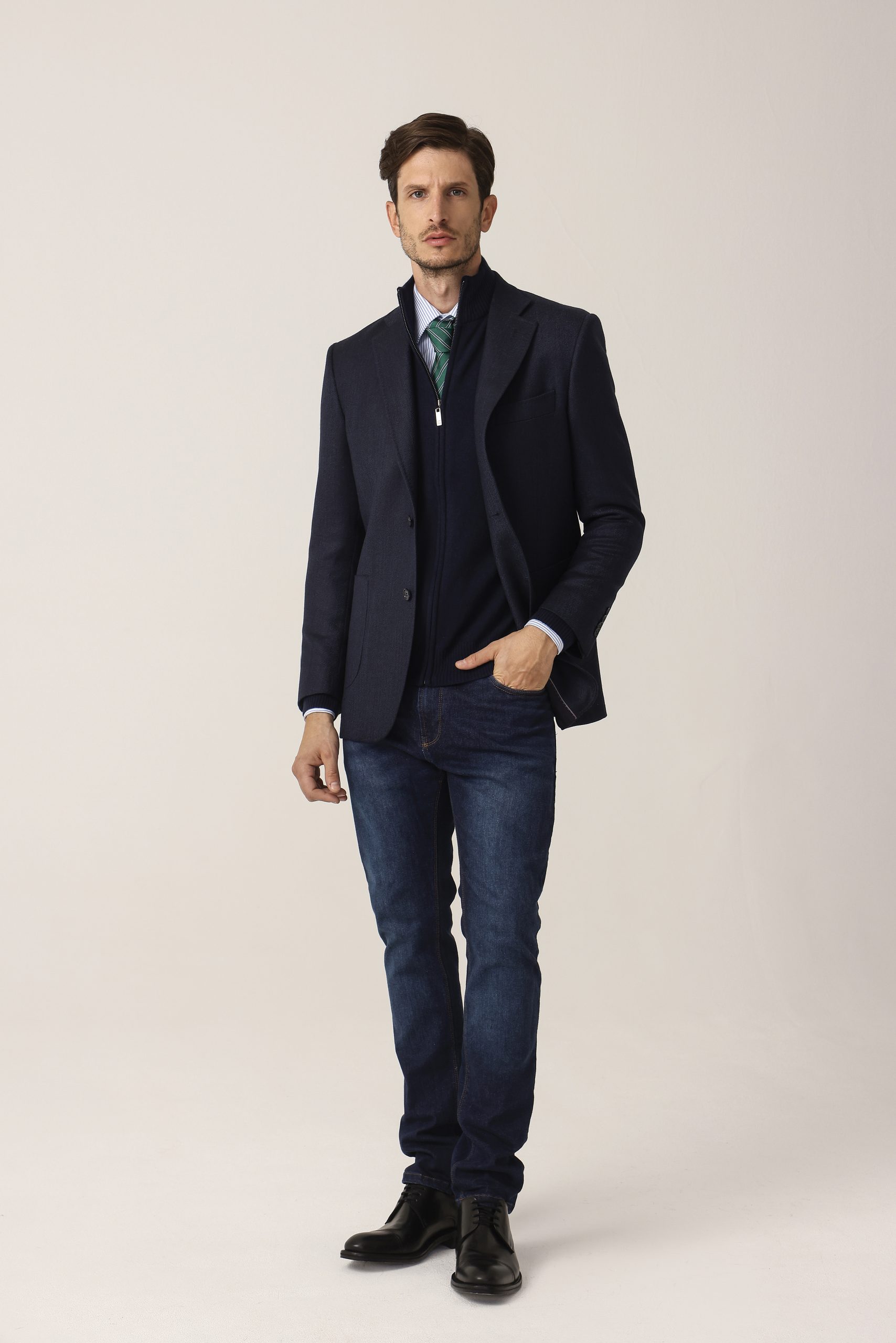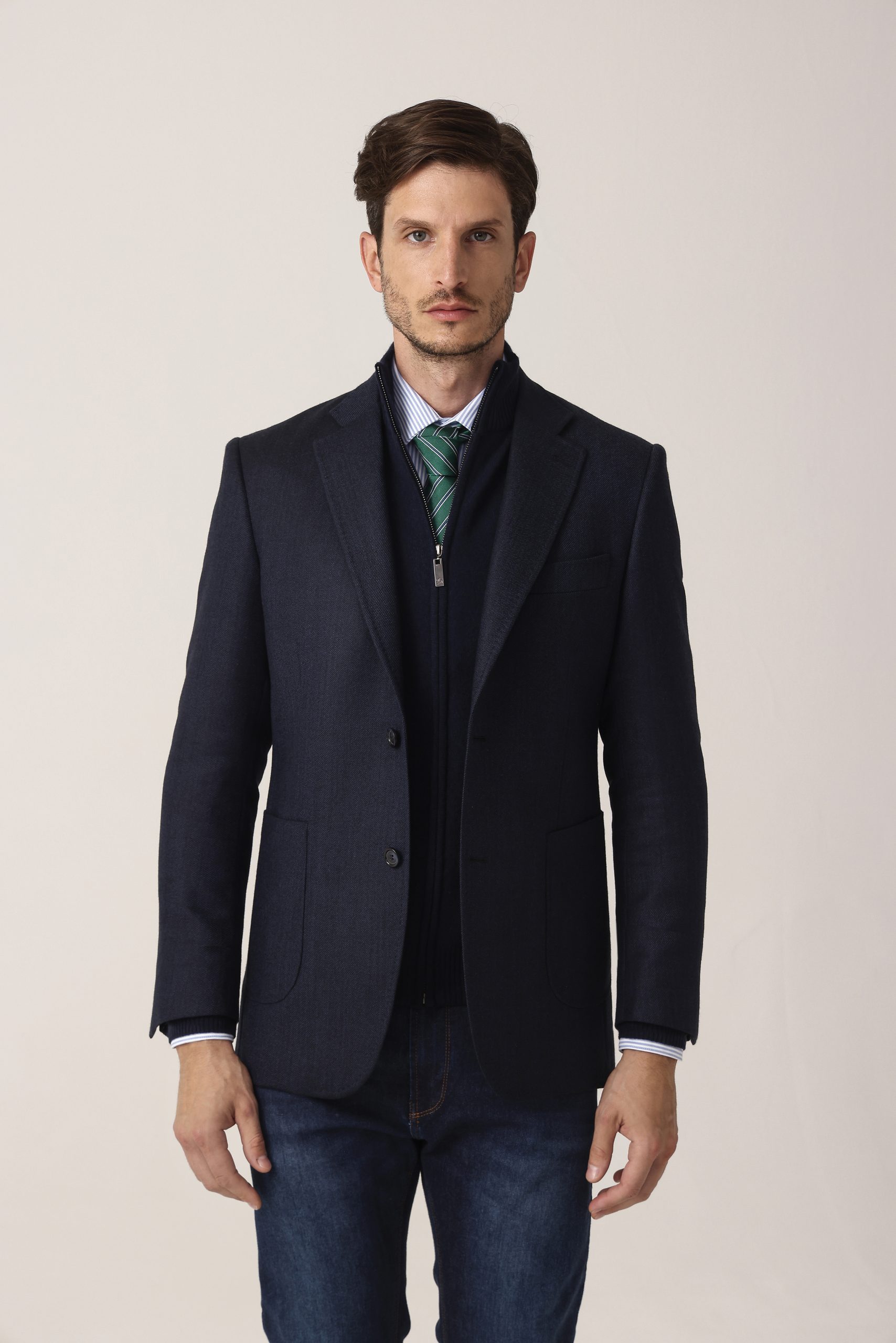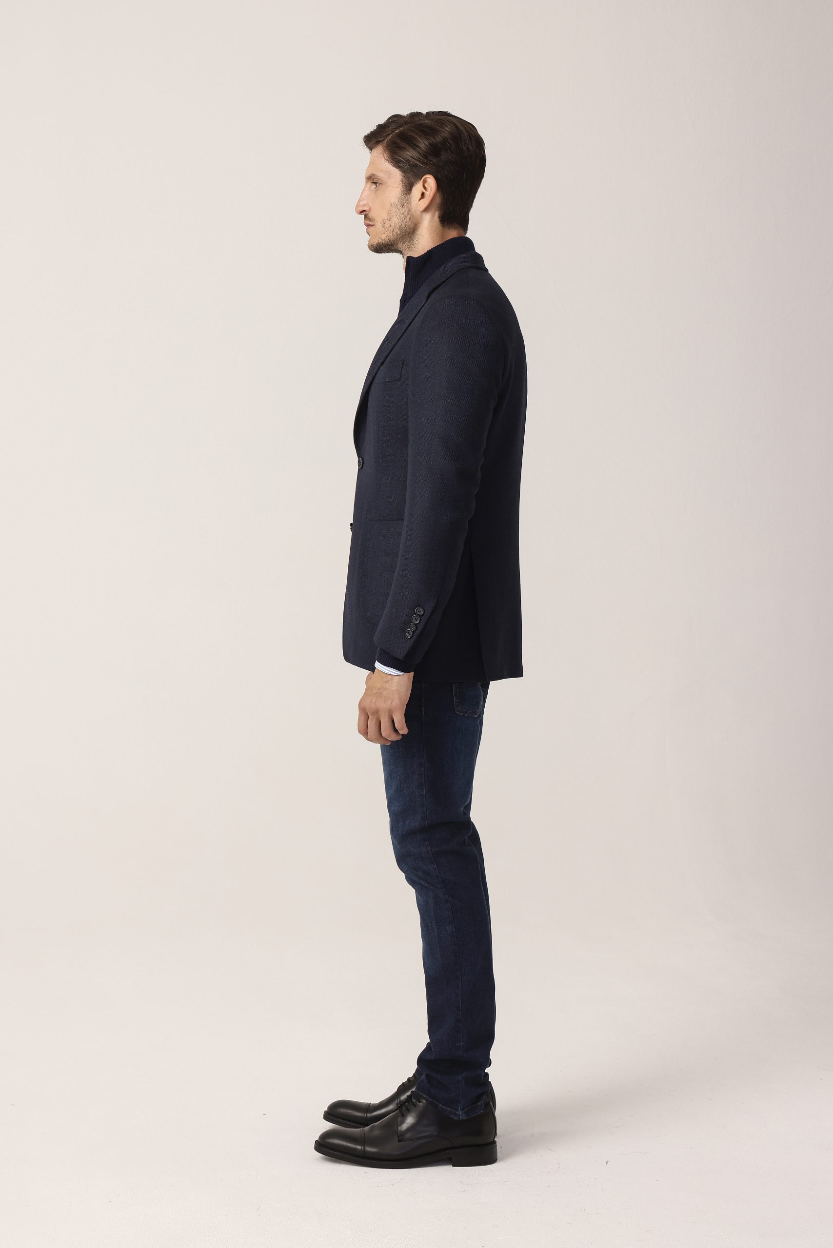 Saco tramado, recto con dos botones. Solapa angosta. Interior forrado. Bolsillos con tapa. Doble abertura trasera.