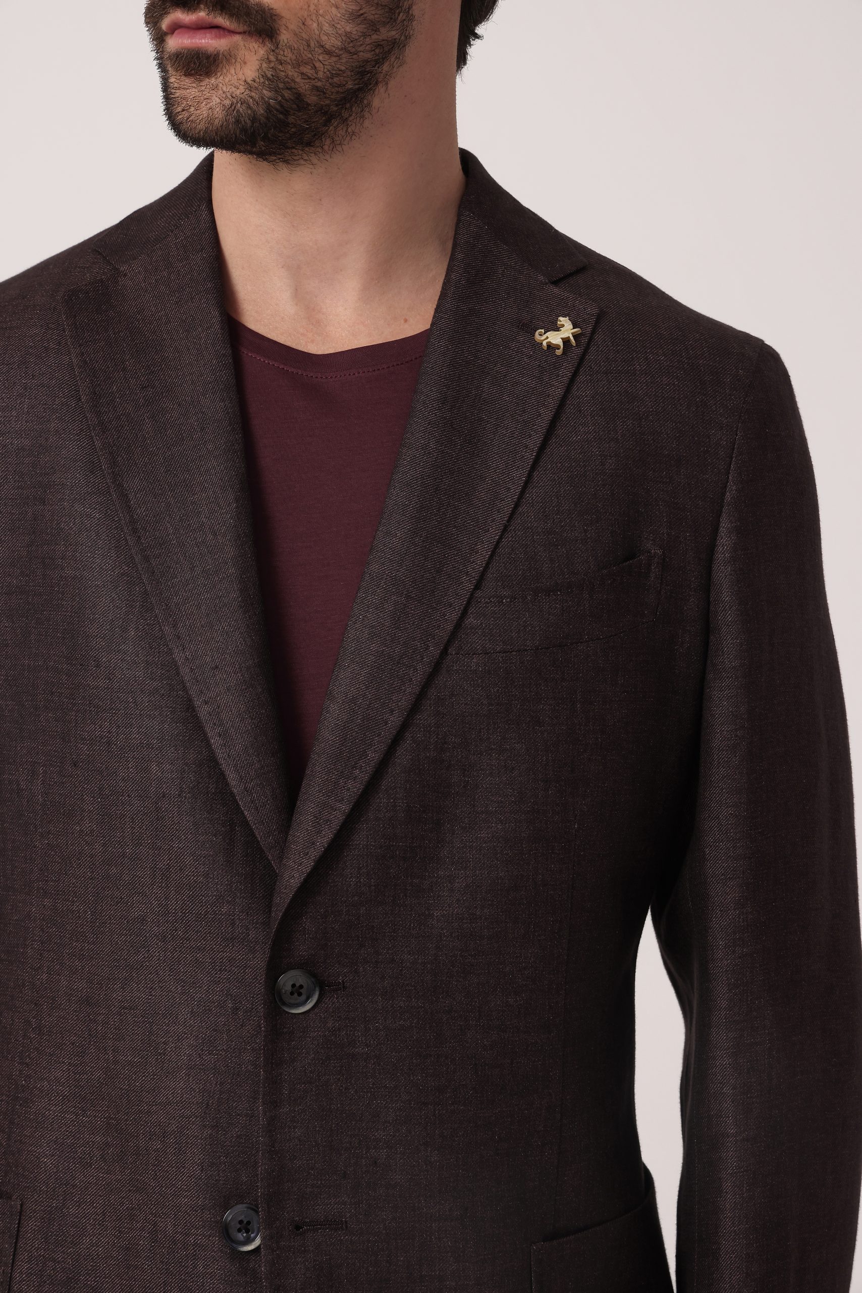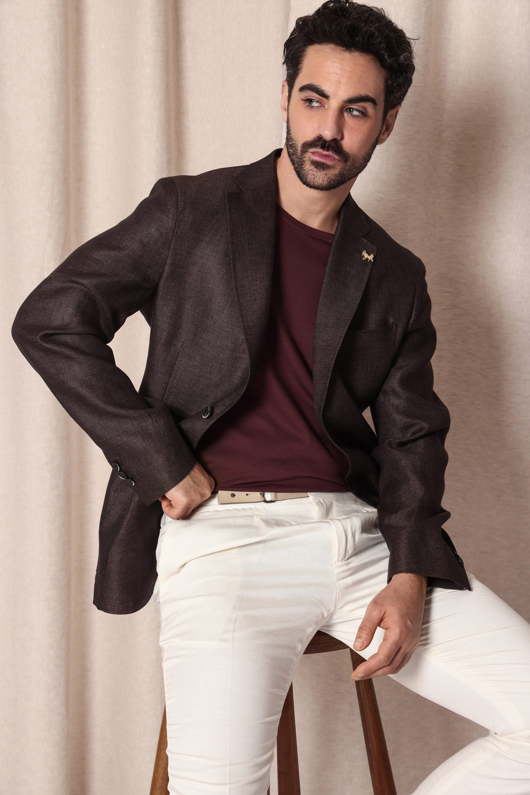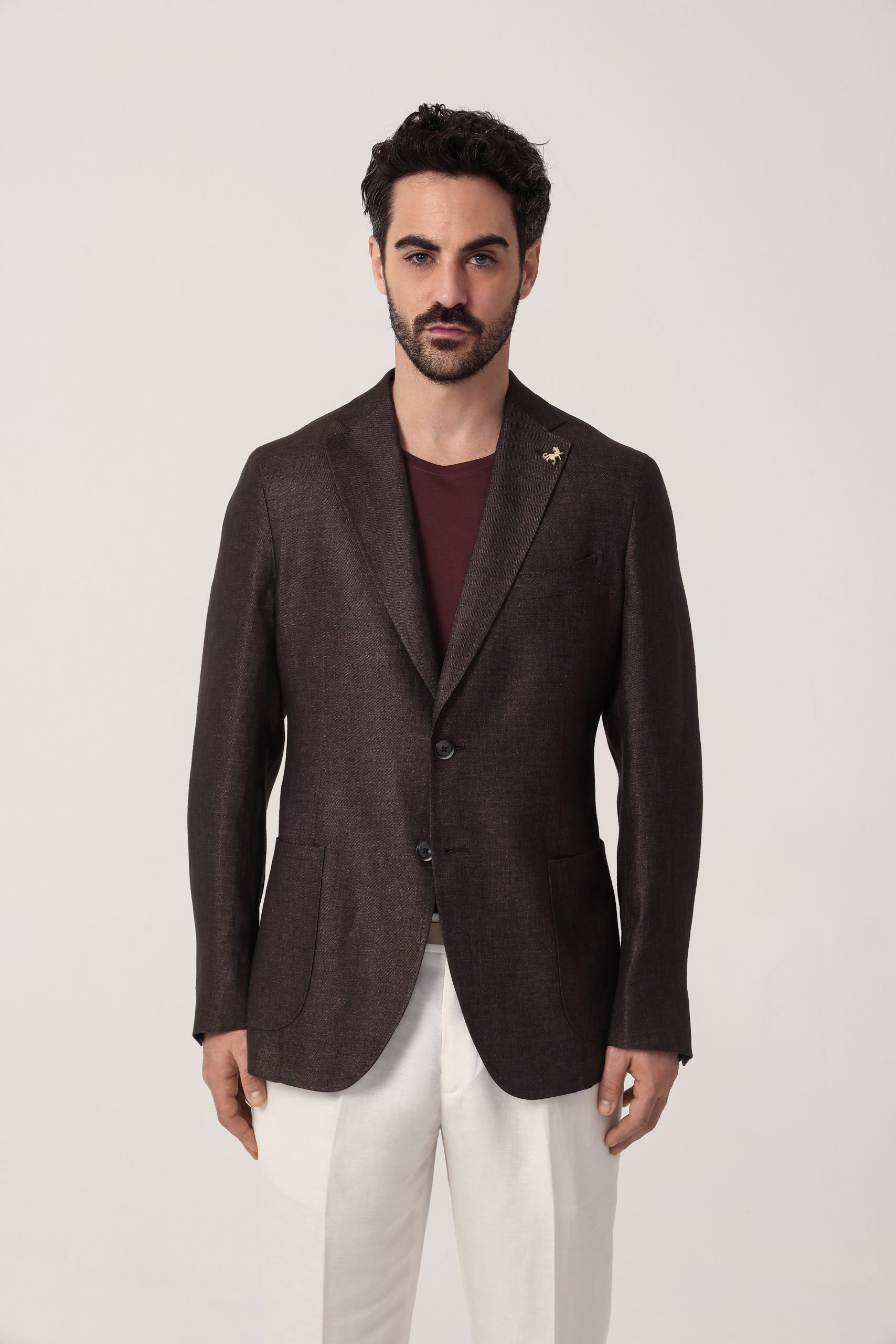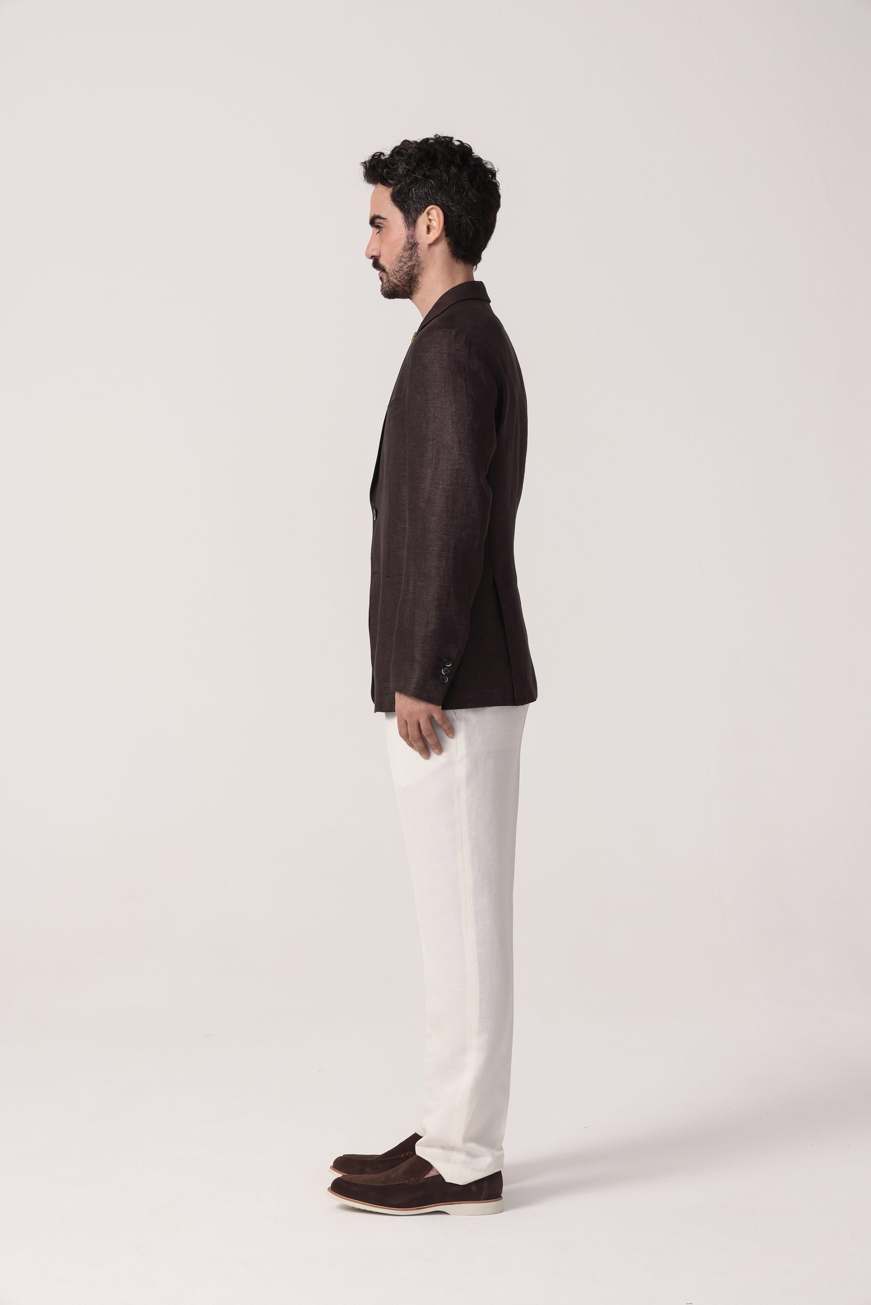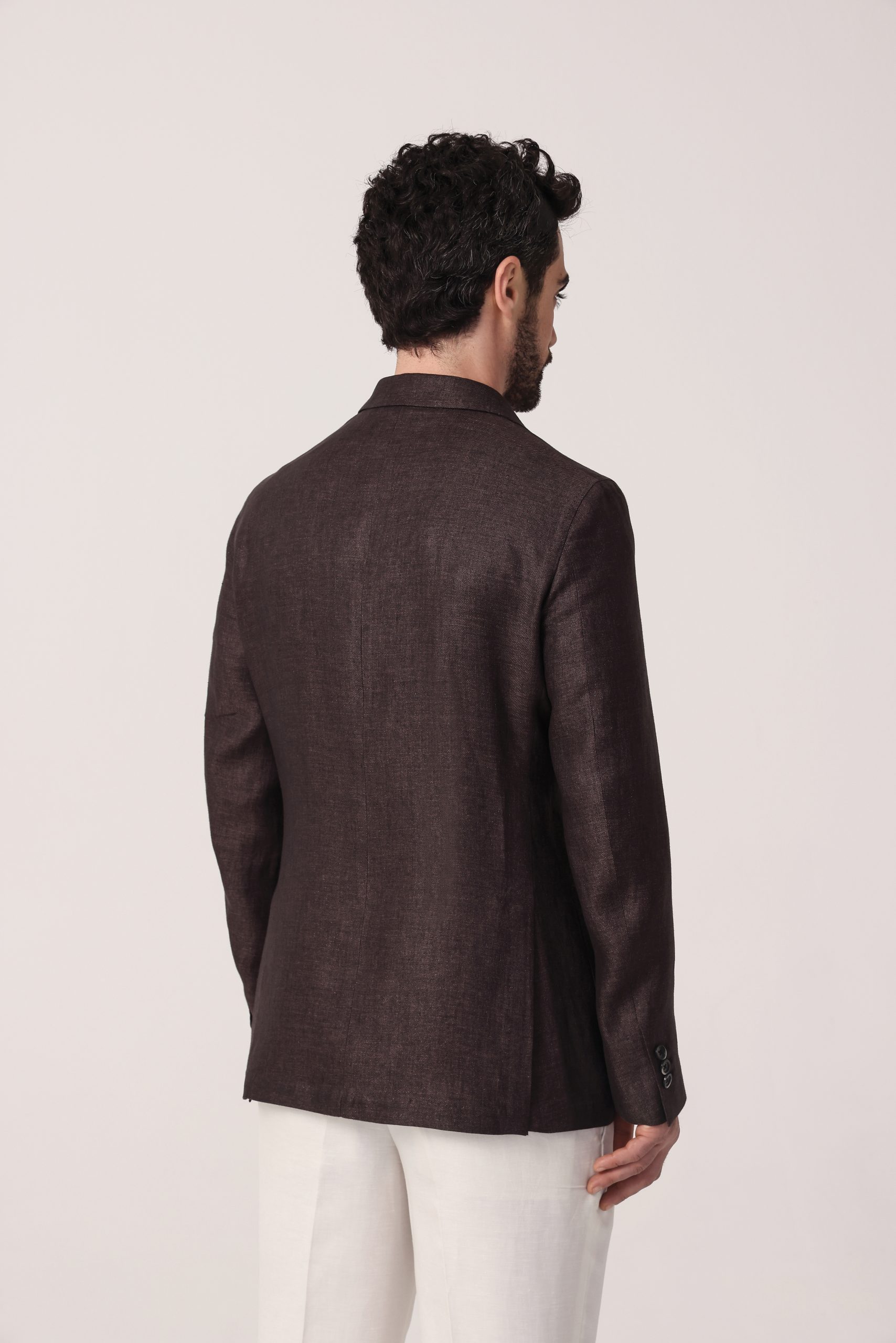 Saco de lino Tombolini. Recto con dos botones. Solapa angosta. Interior sin forro. Bolsillos plaqué. Moldería regular. Doble apertura trasera.