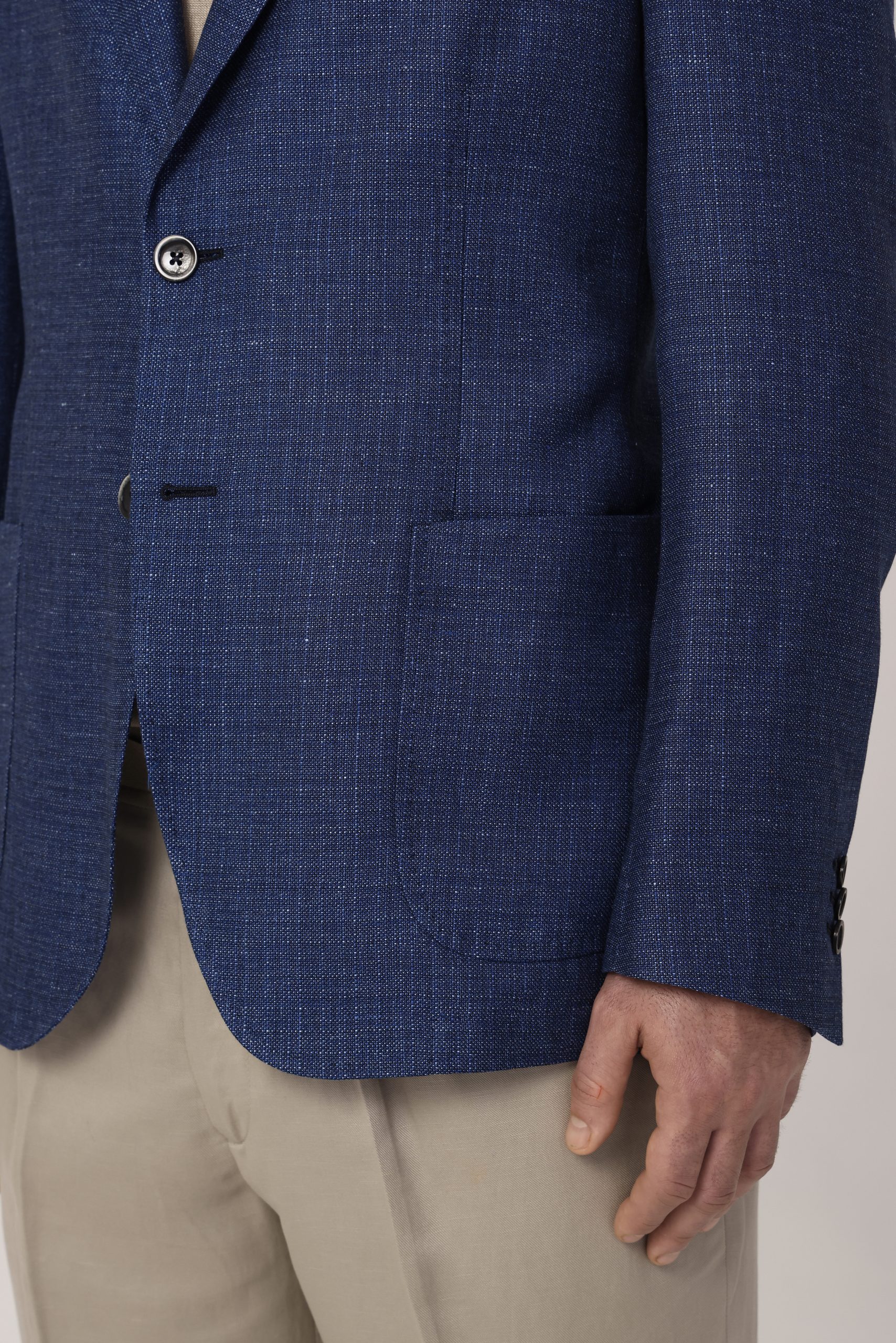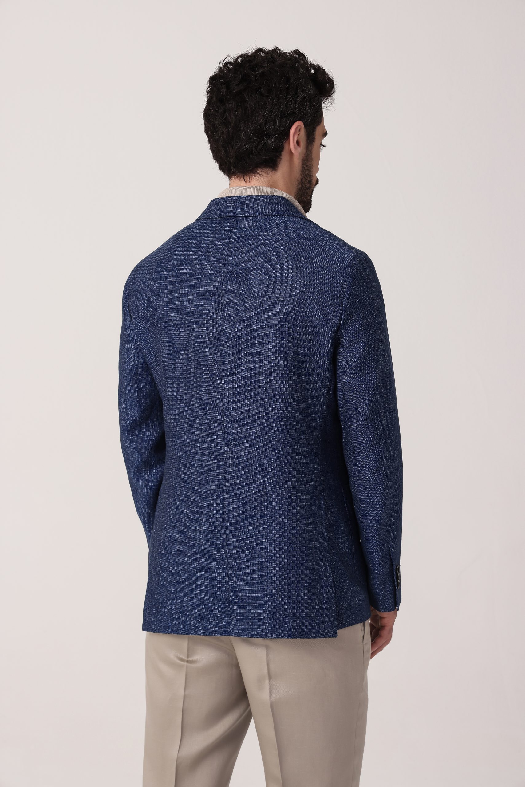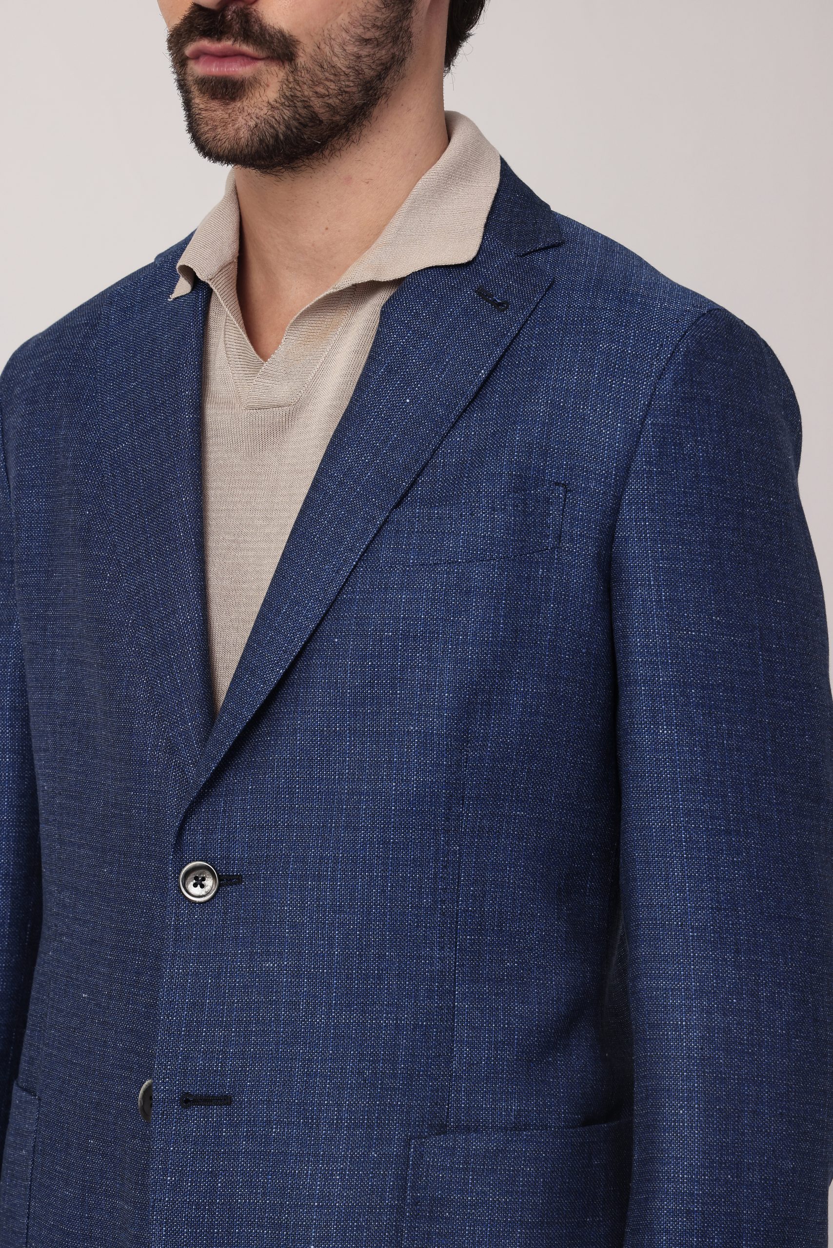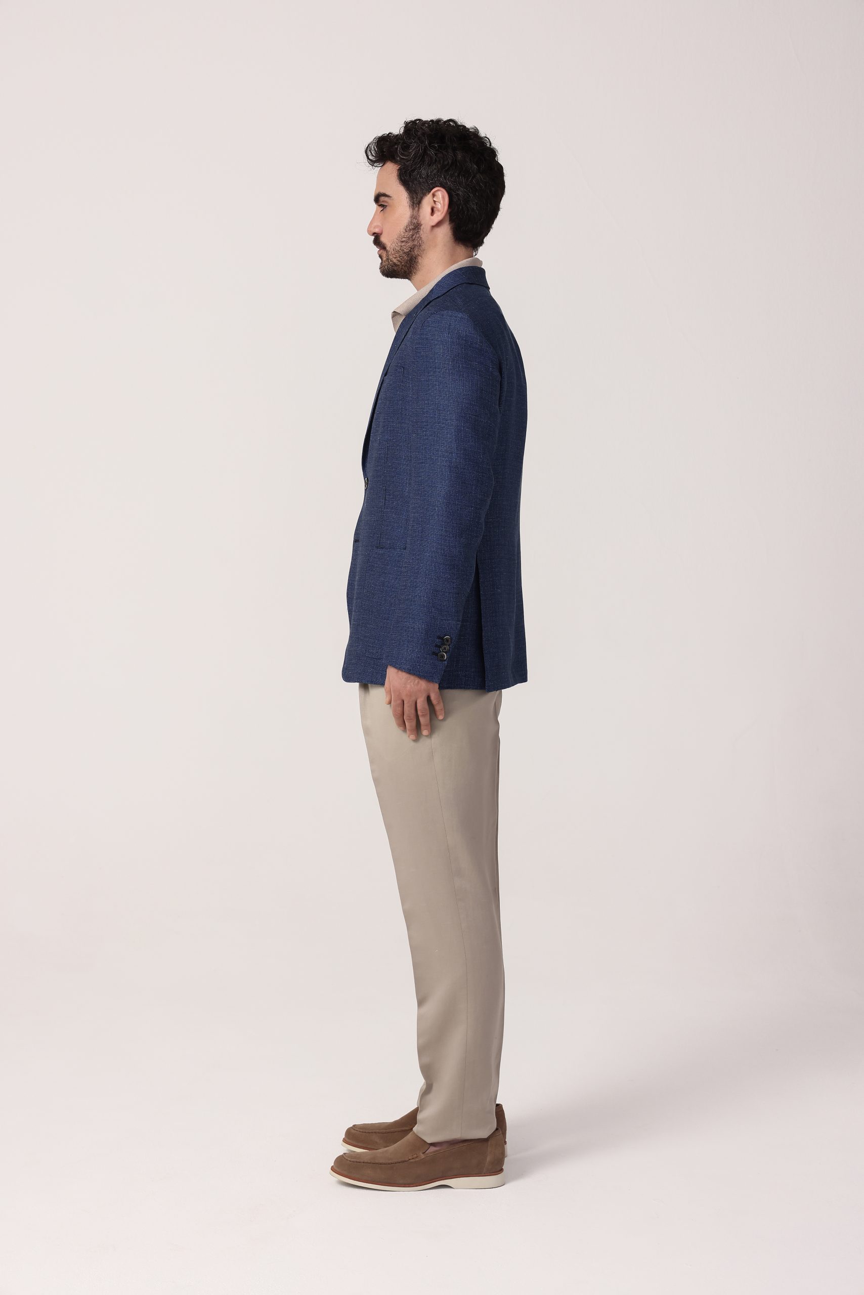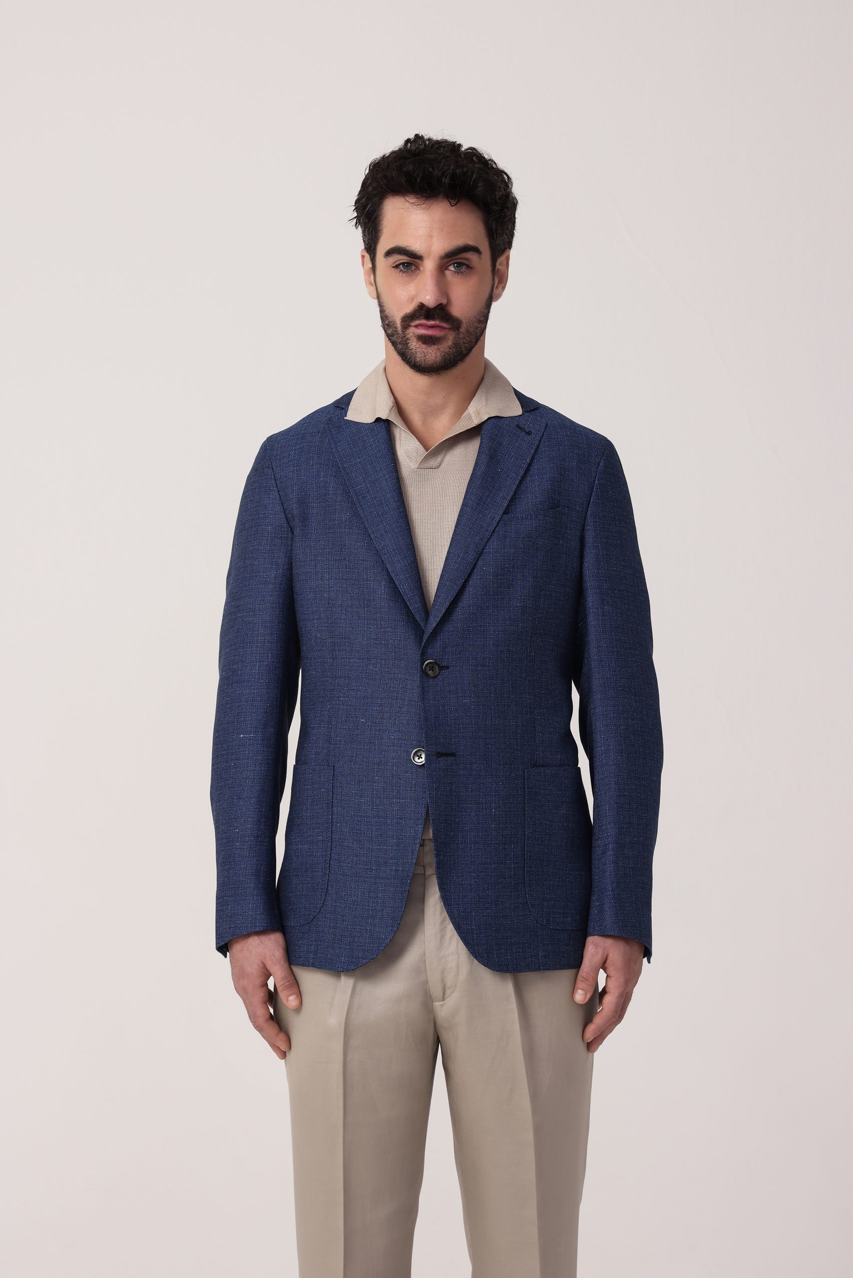 Saco de lino Tombolini. Recto con dos botones. Solapa angosta. Interior sin forro. Bolsillos plaqué. Moldería regular. Doble apertura trasera.