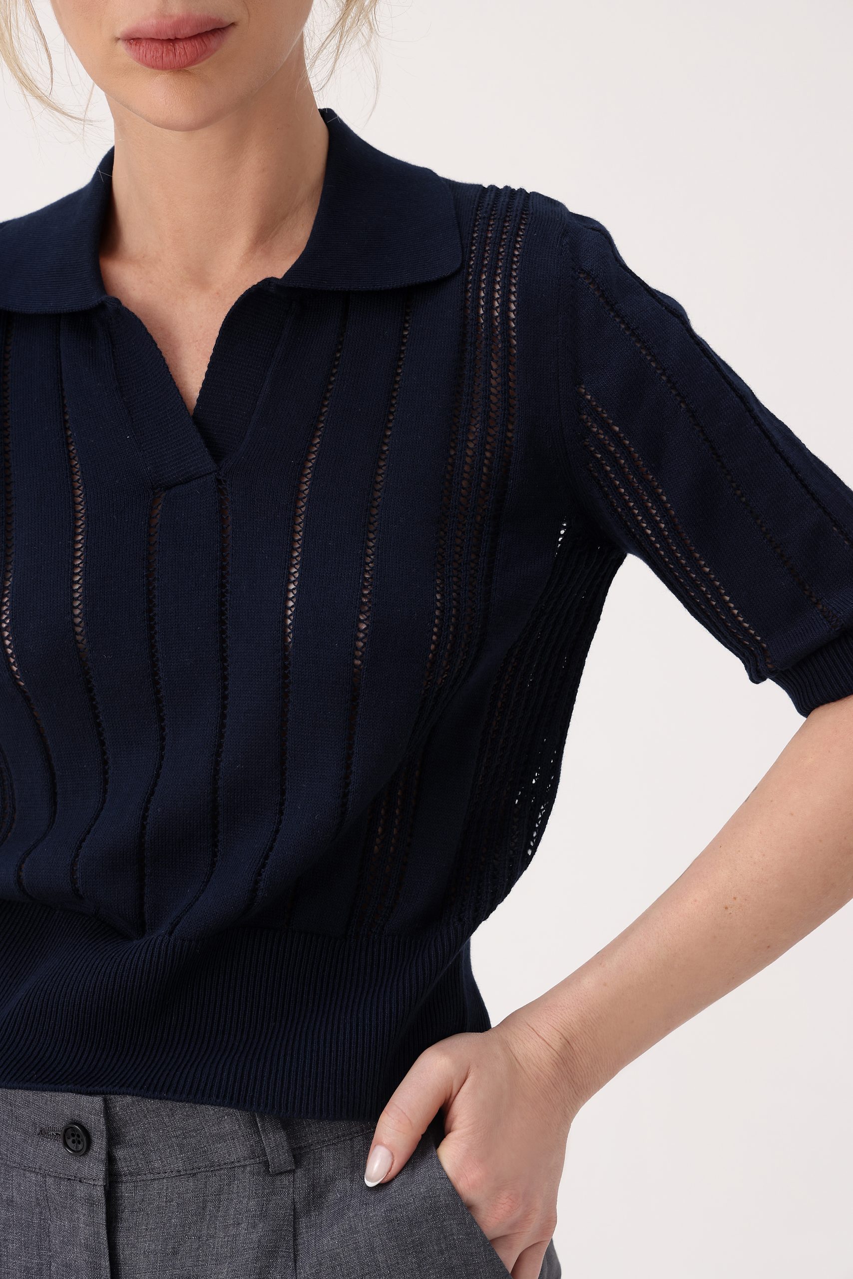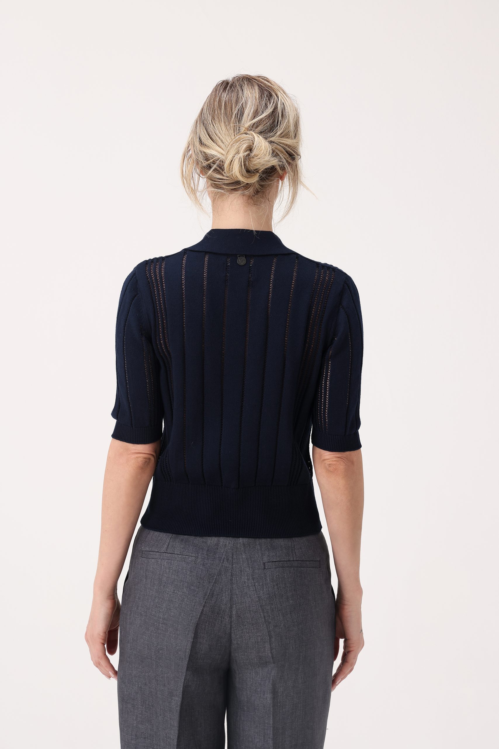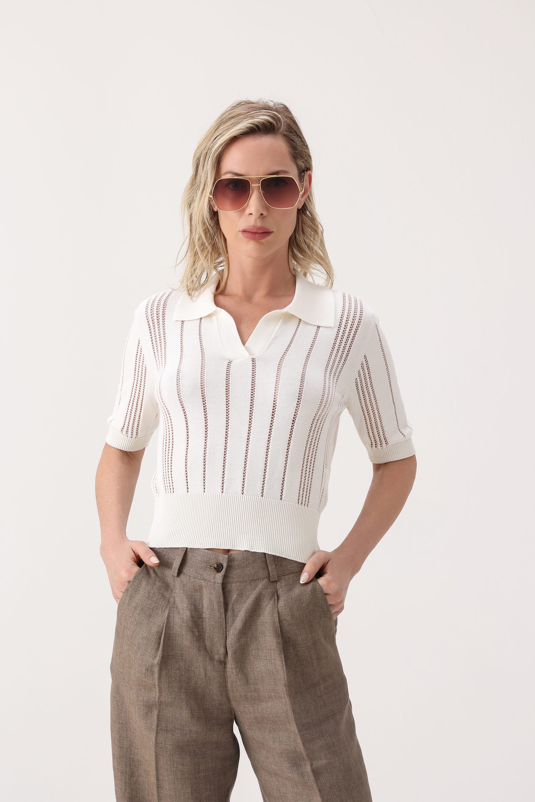 Sweater calado de dama. Cuello polo. Mangas y cintura con puño. Molderia regular.