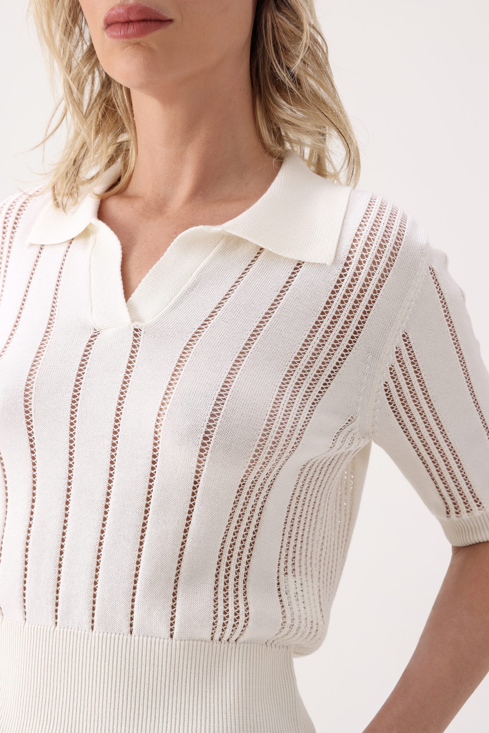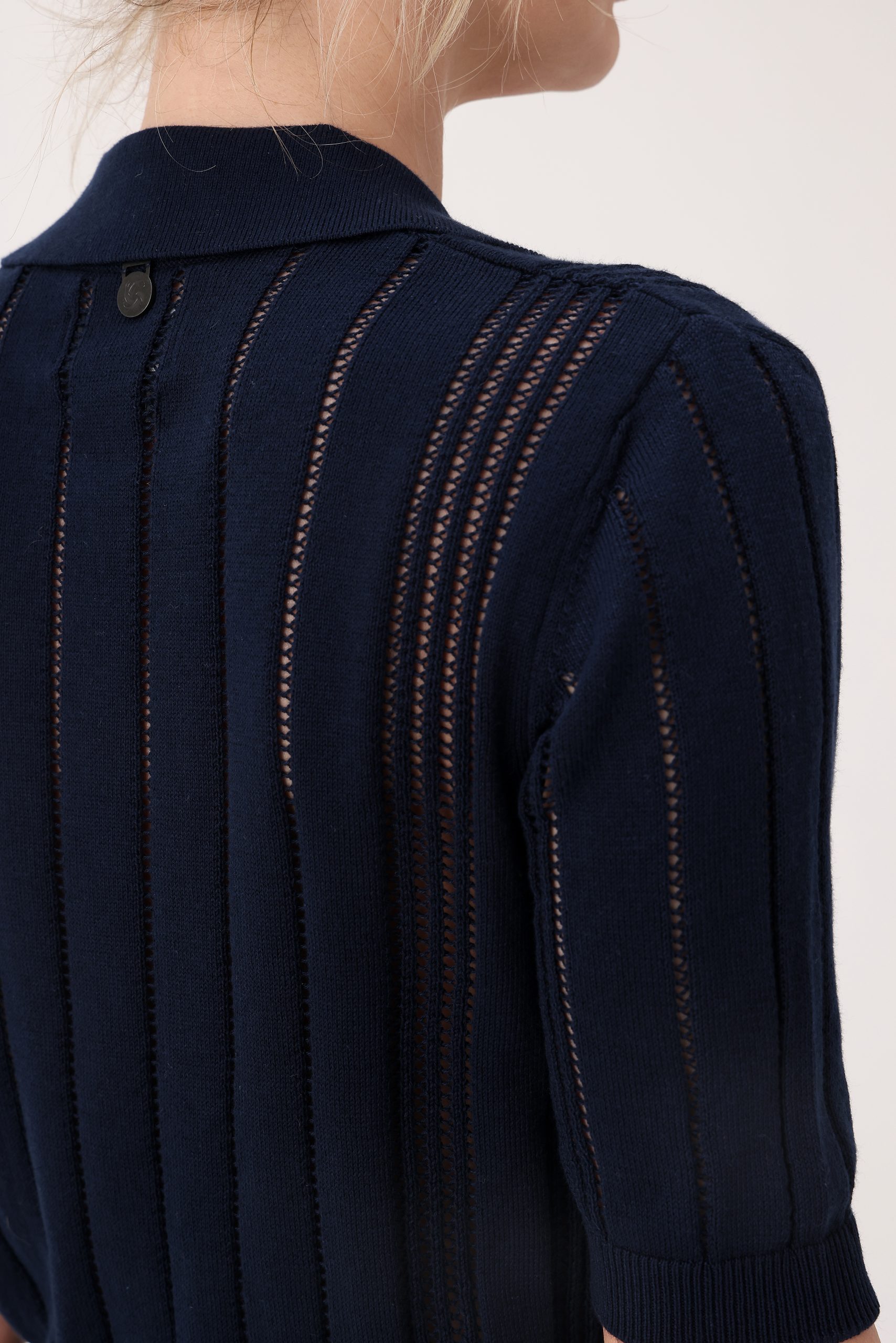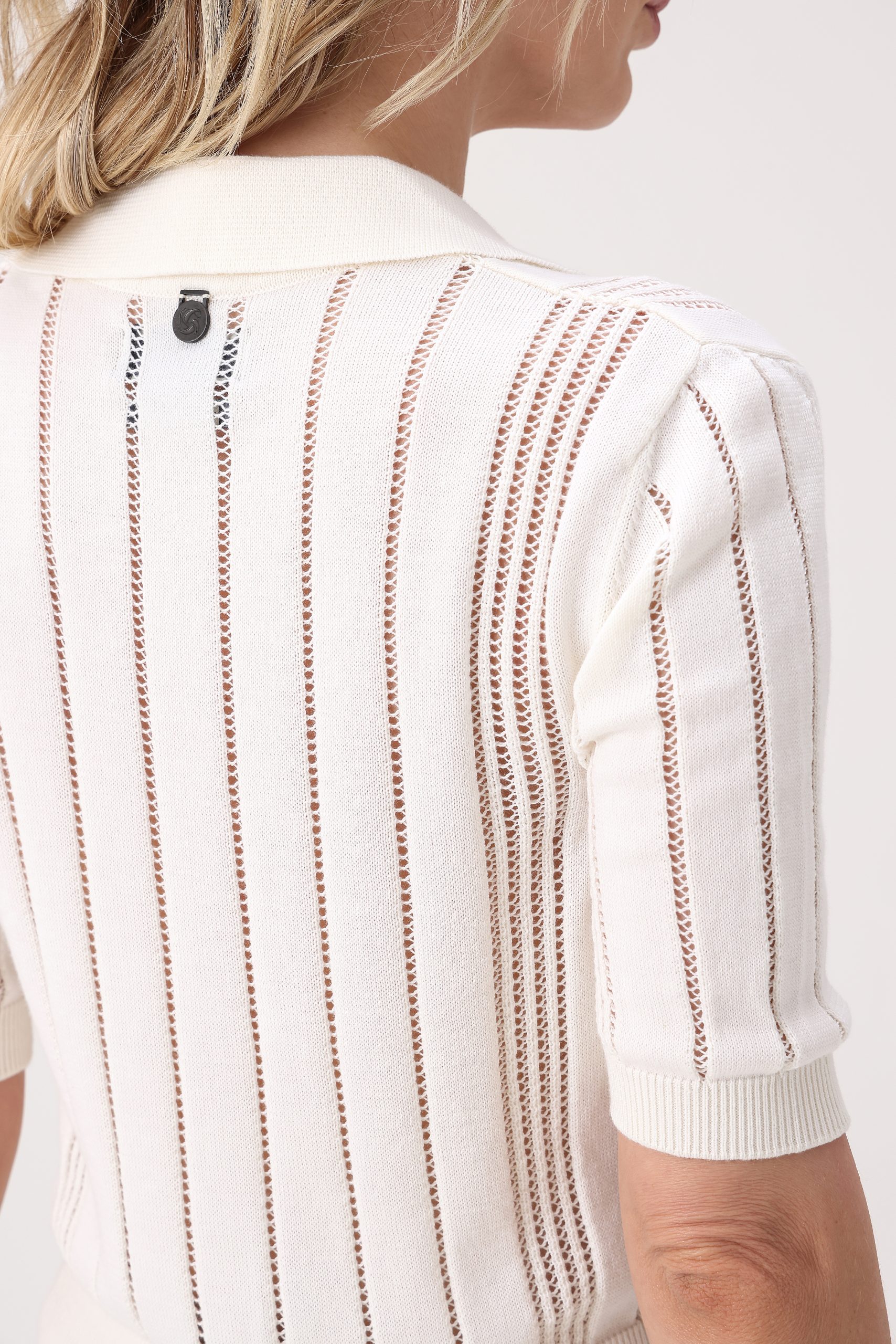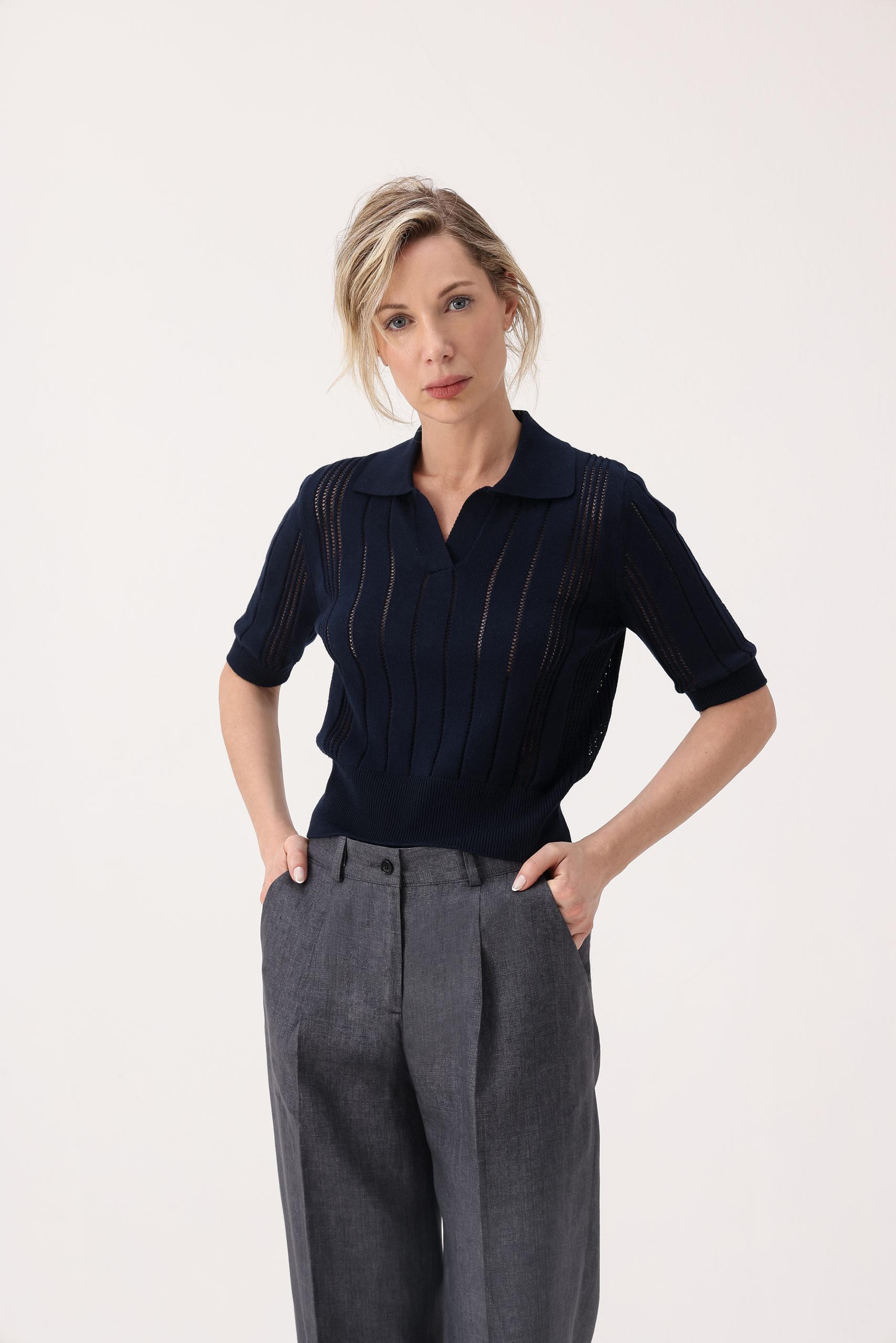 Sweater calado de dama. Cuello polo. Mangas y cintura con puño. Molderia regular.