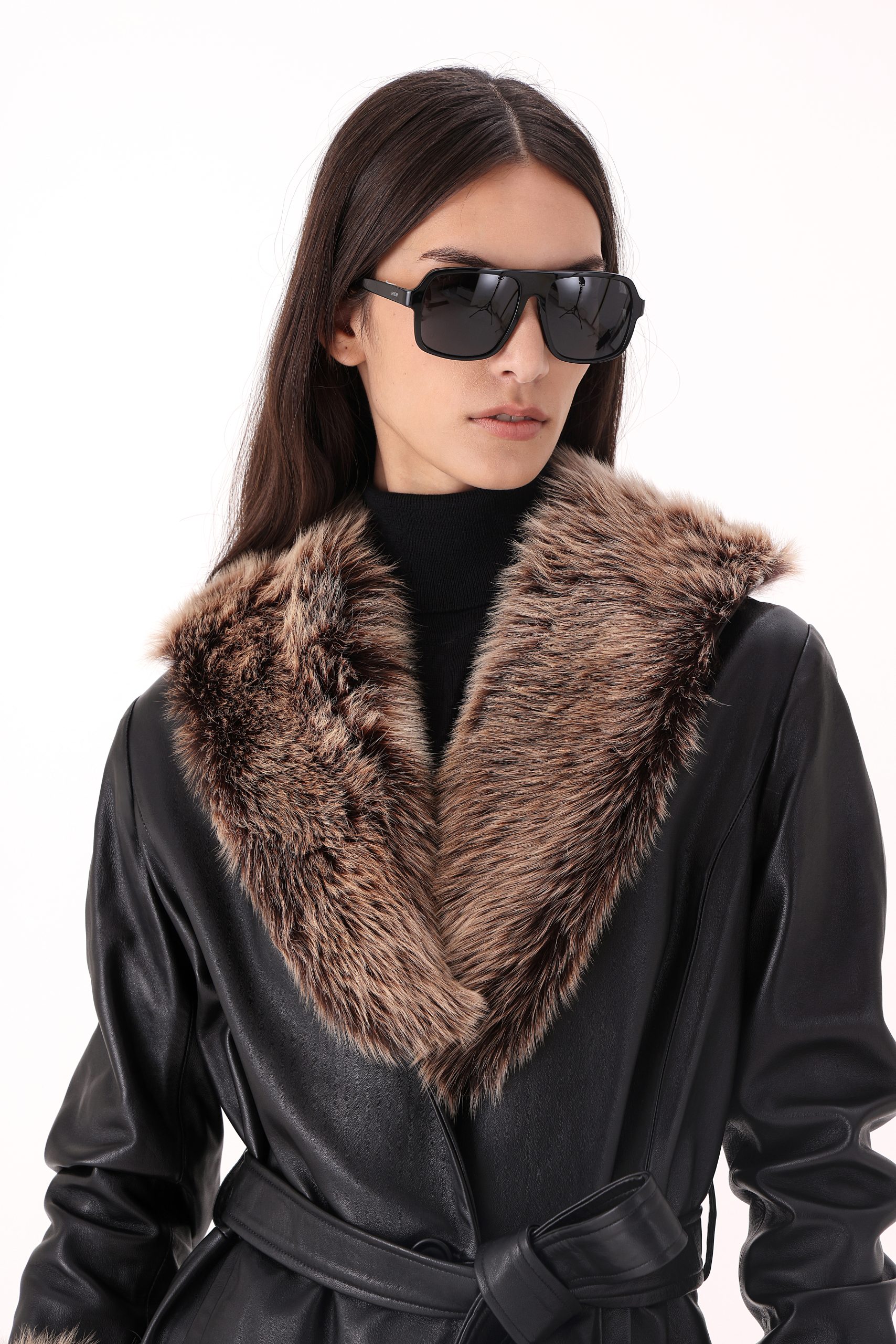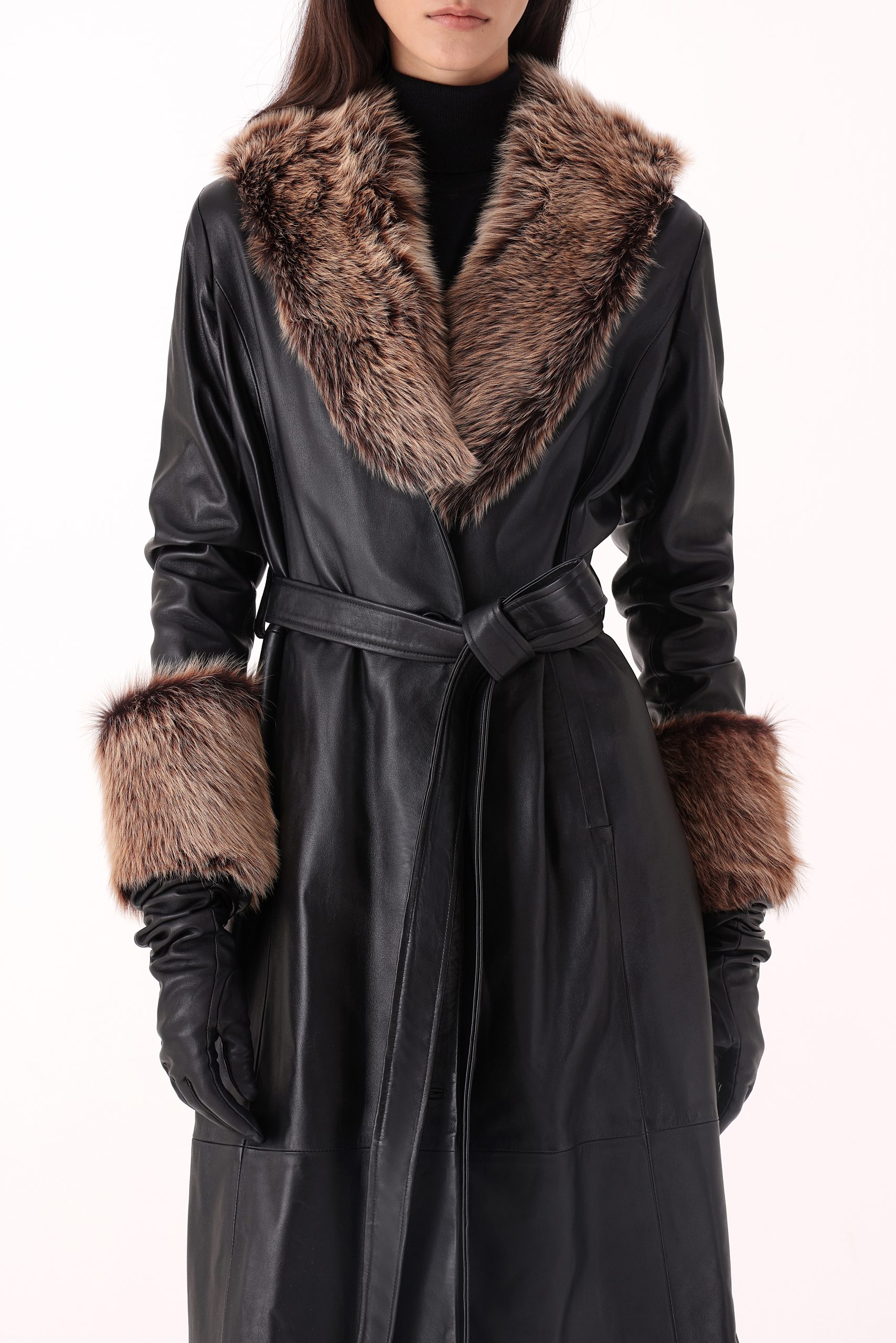 Tapado de dama en cuero con pelo símil zorro. Cintura con lazo. Interior forrado. Composición 100% cuero ovino.